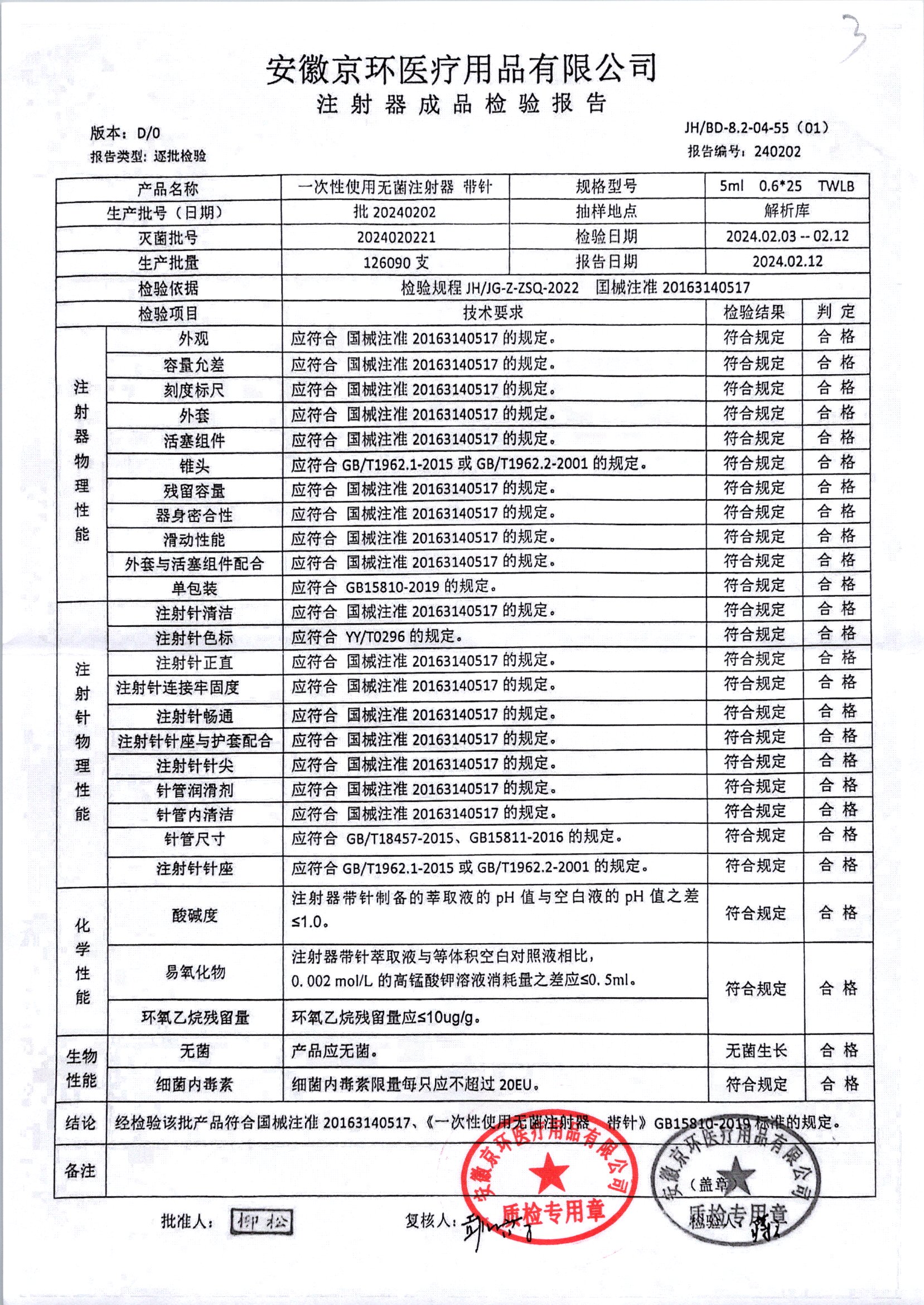 一次性使用无菌注射器带针 | 5ml*0.6*25 | 批20240202 | 查看详情 |