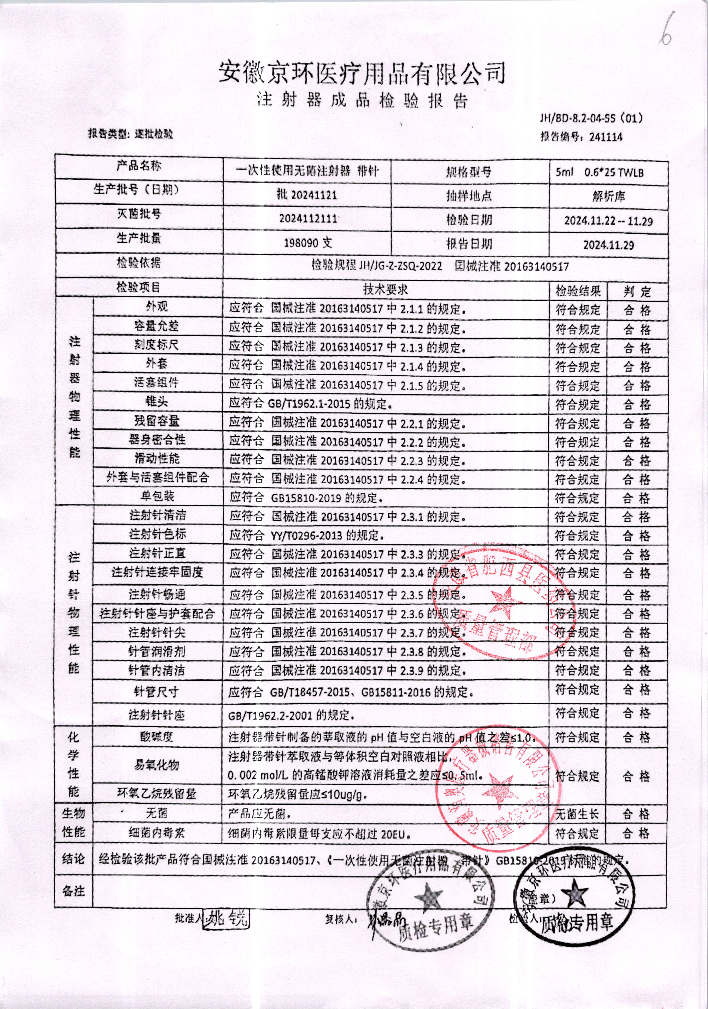 一次性使用无菌注射器带针 | 5ml*0.6*25 | 批20241121 | 查看详情 |