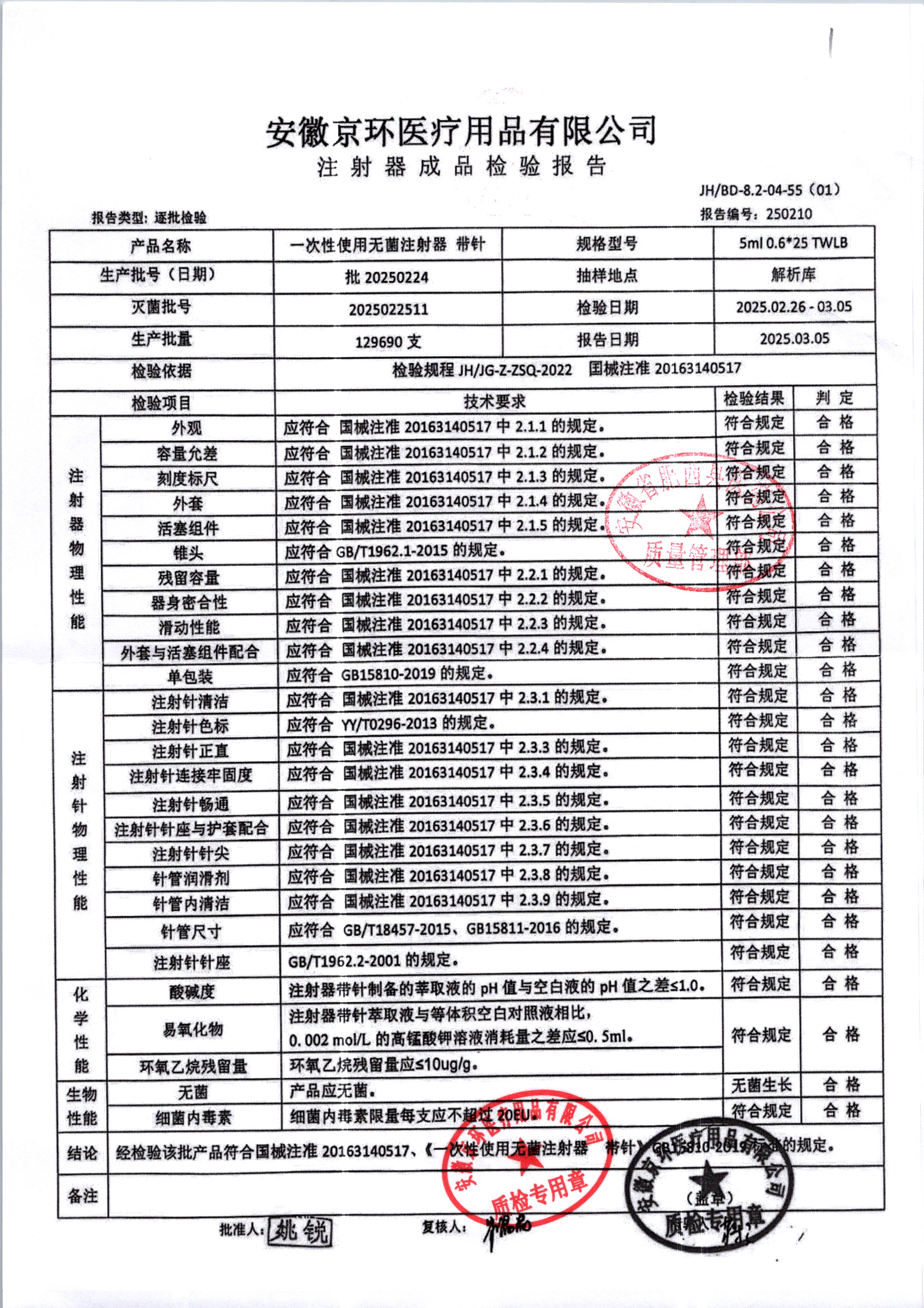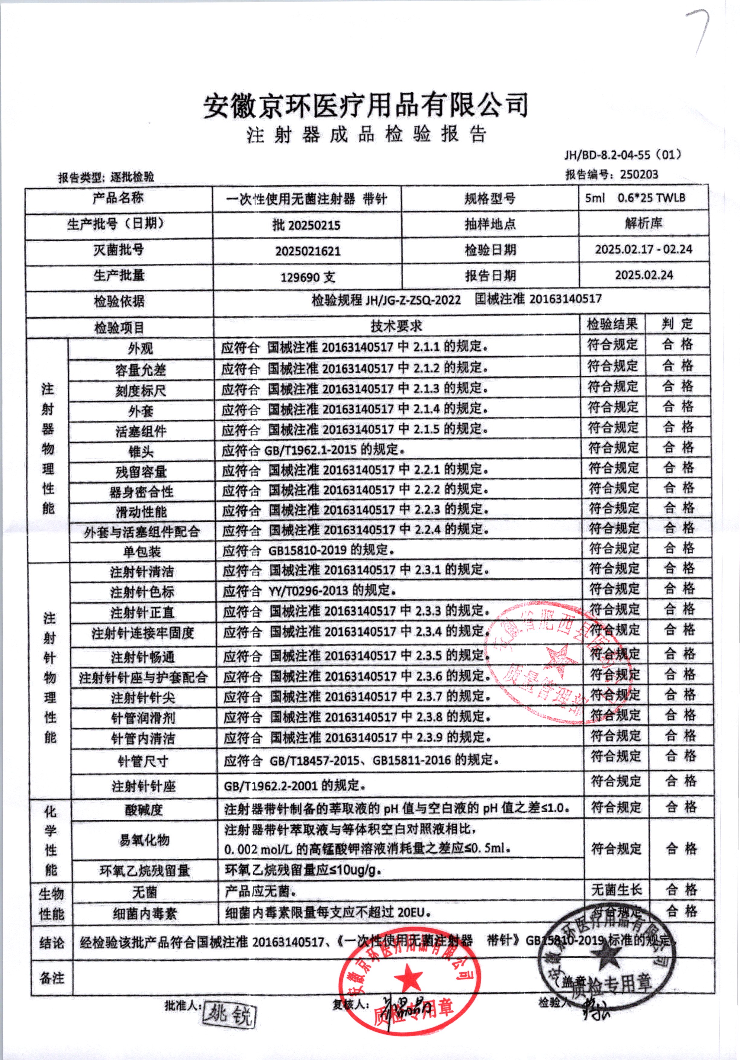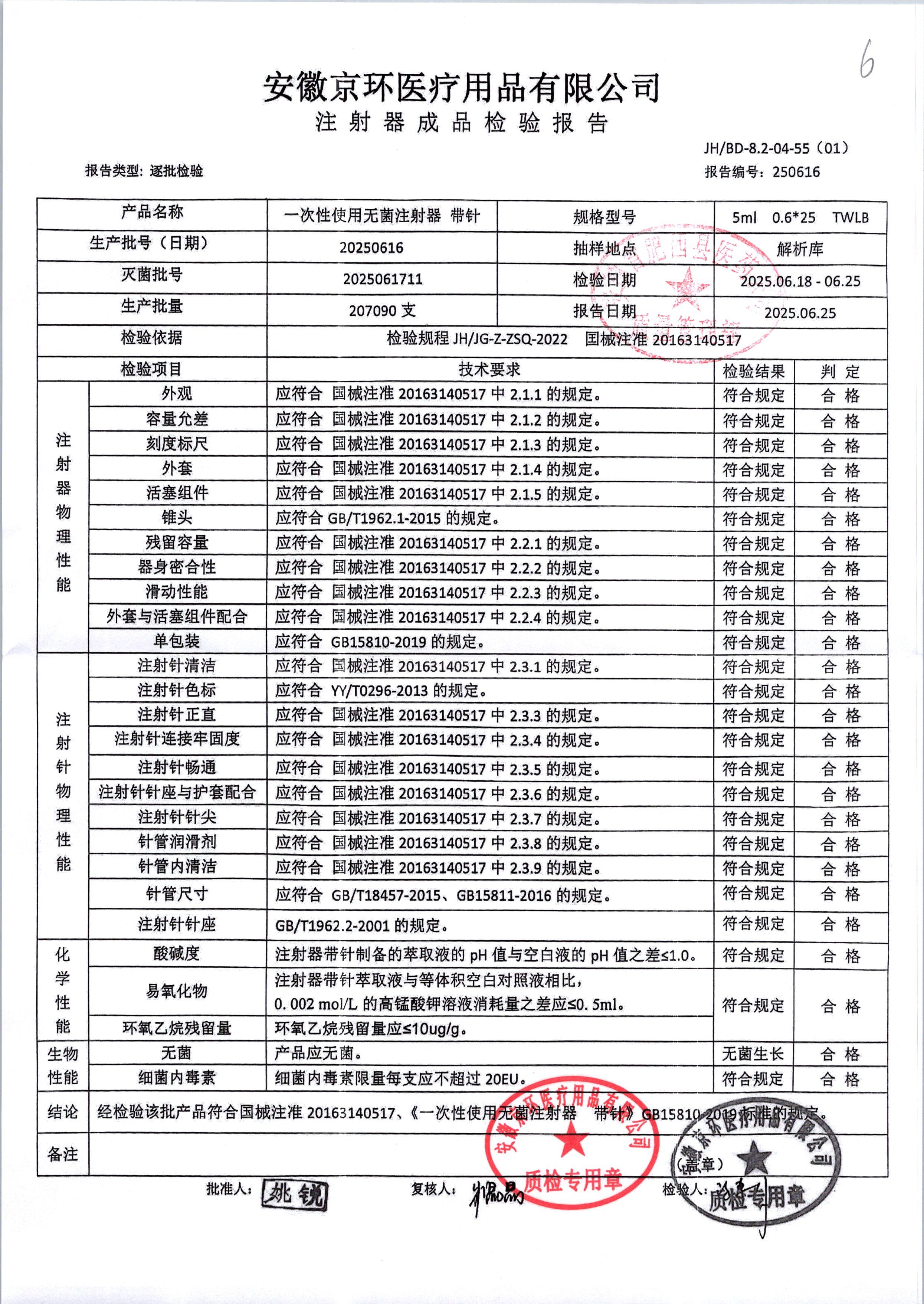 一次性使用无菌注射器带针 | 5ml*0.6*25 | 20250616 | 查看详情 |