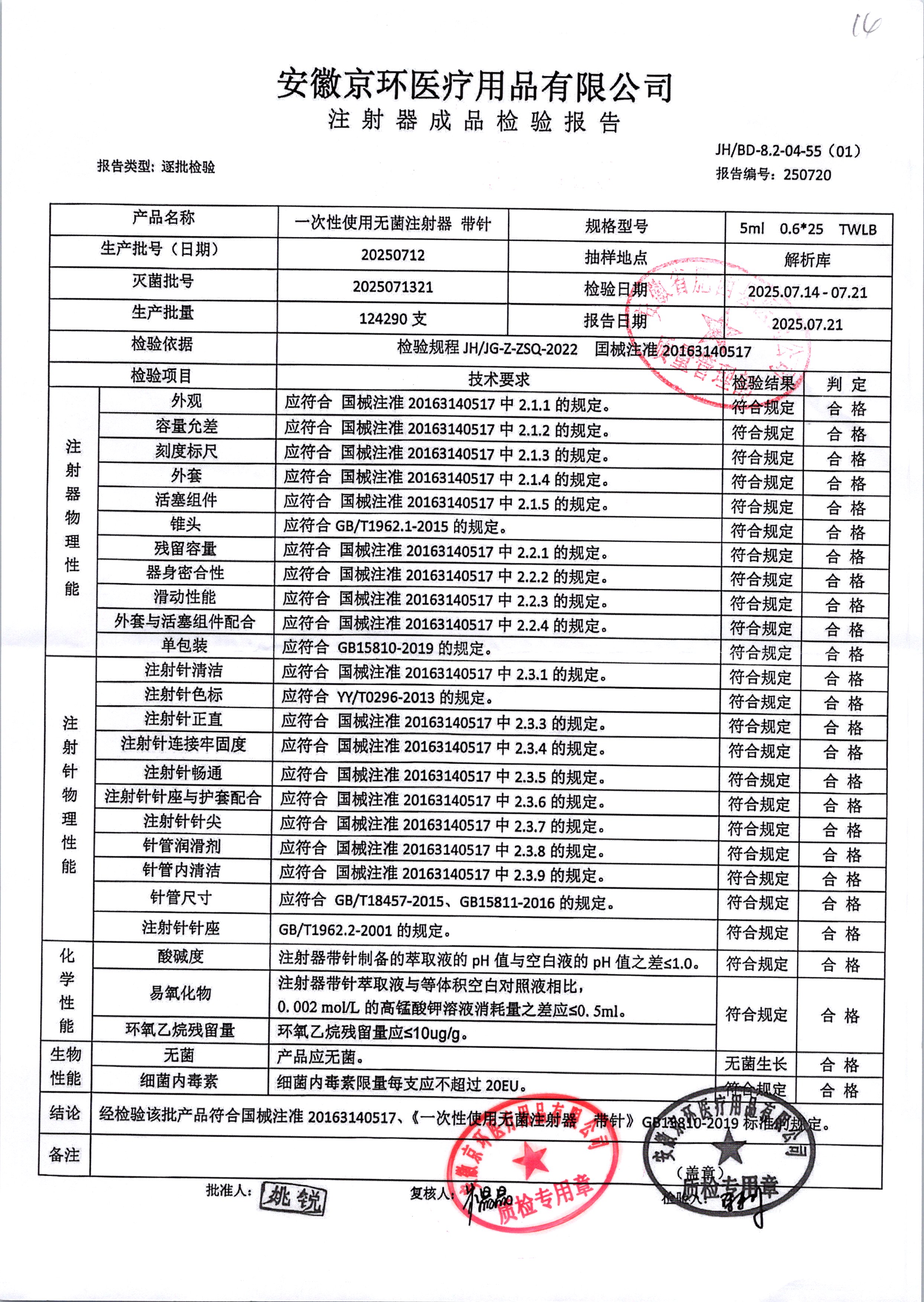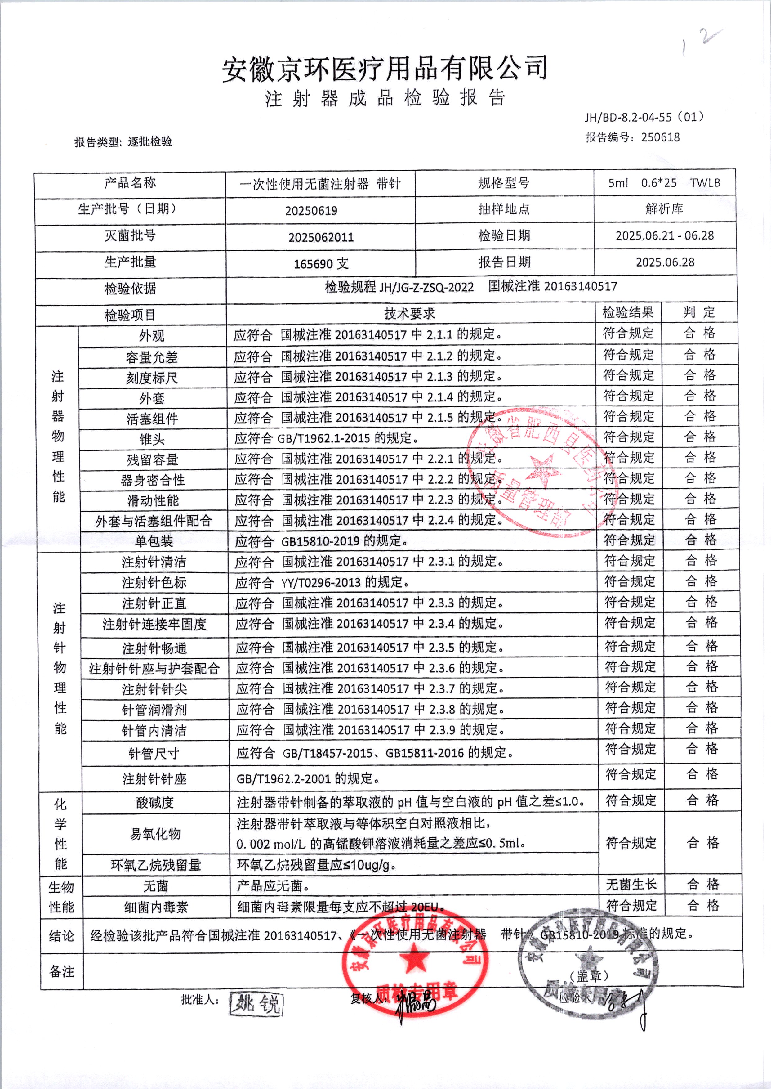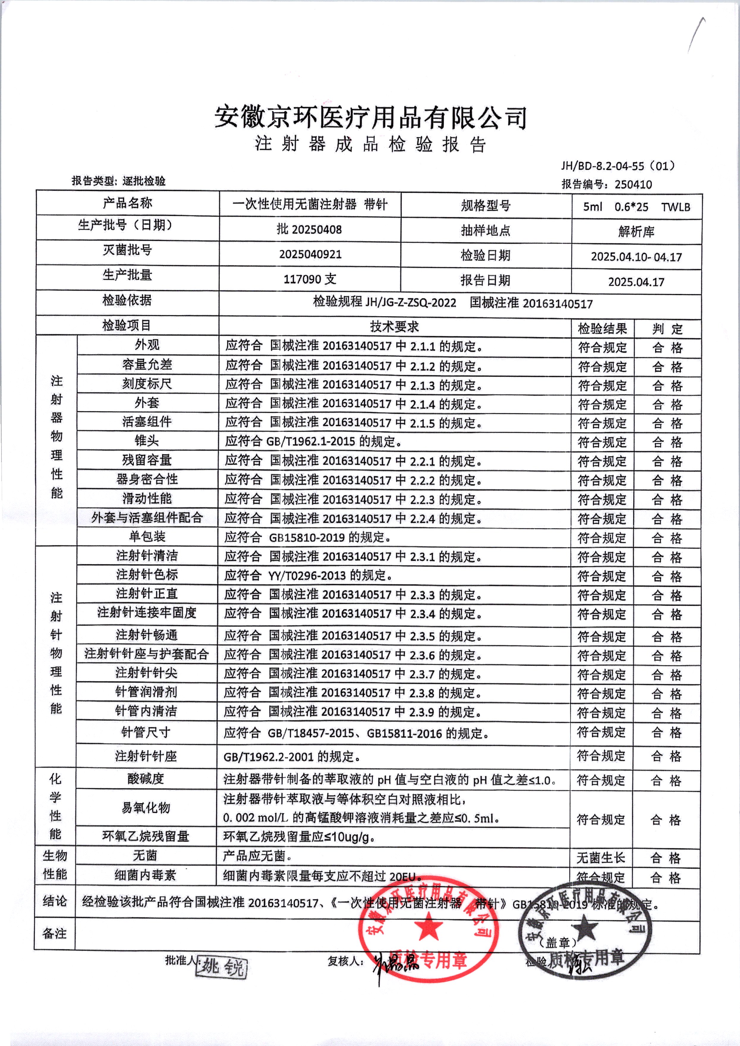 一次性使用无菌注射器带针 | 5ml*0.6*25 | 20250616 | 查看详情 |