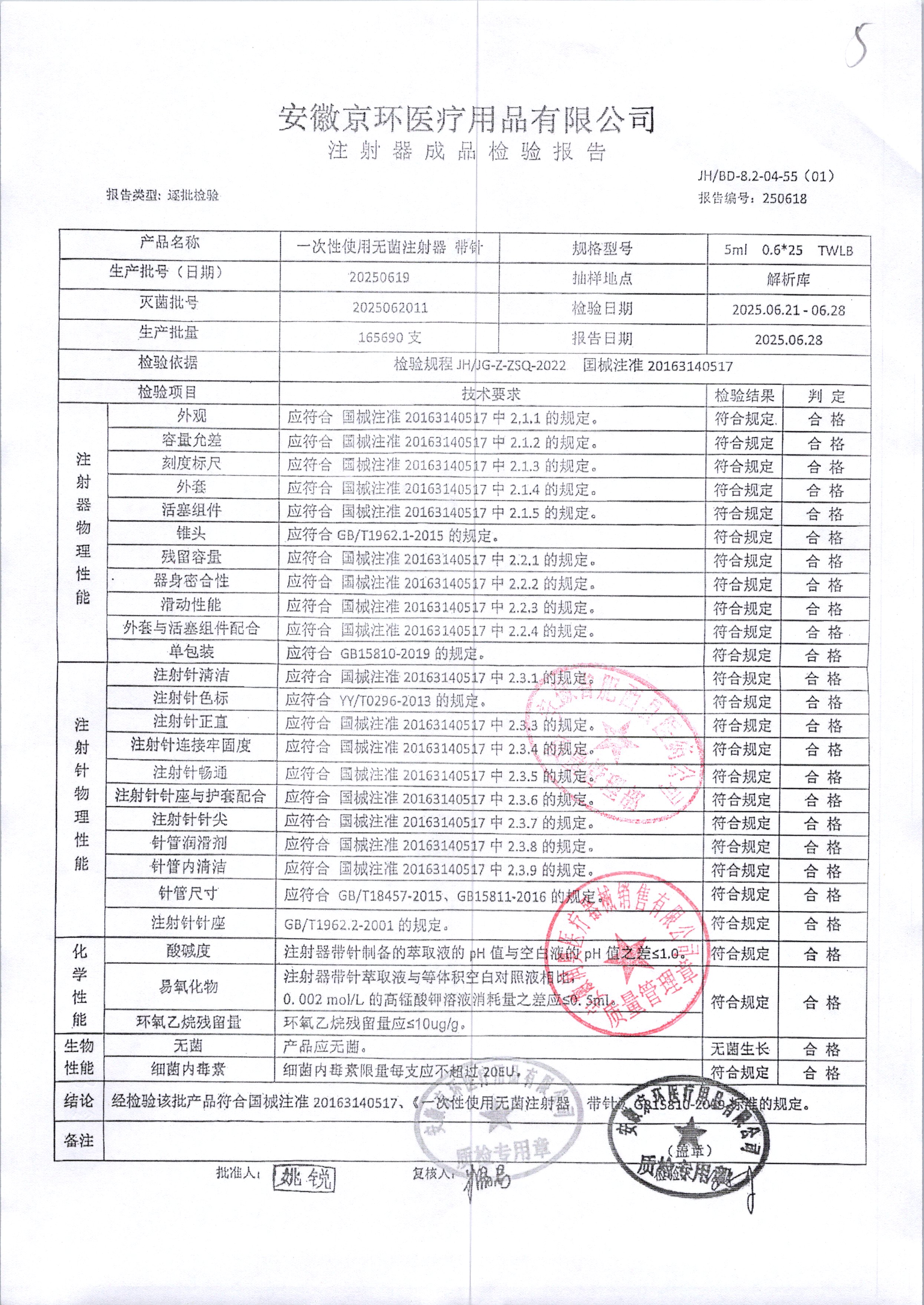 一次性使用无菌注射器带针 | 5ml*0.6*25 | 20250619 | 查看详情 |