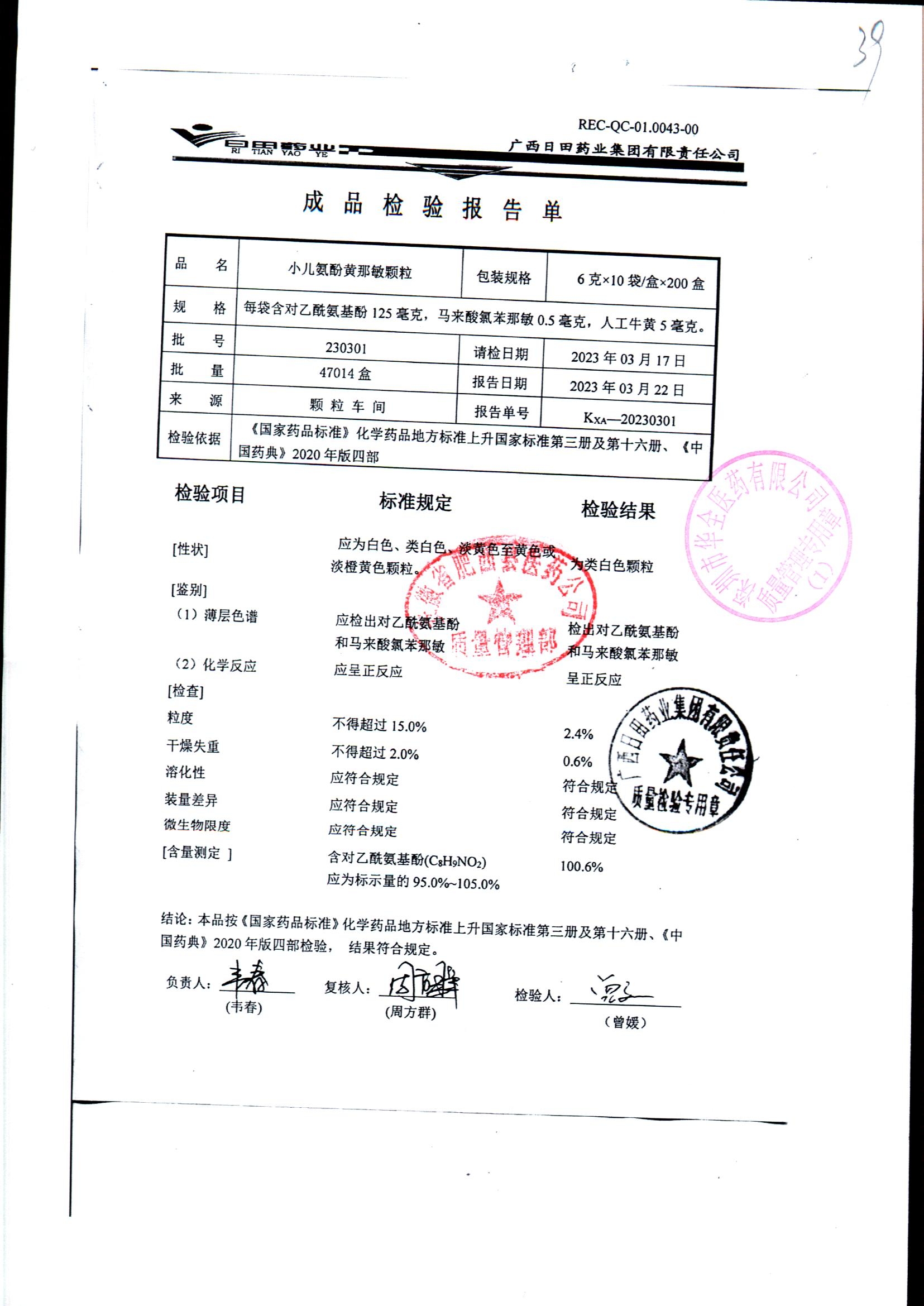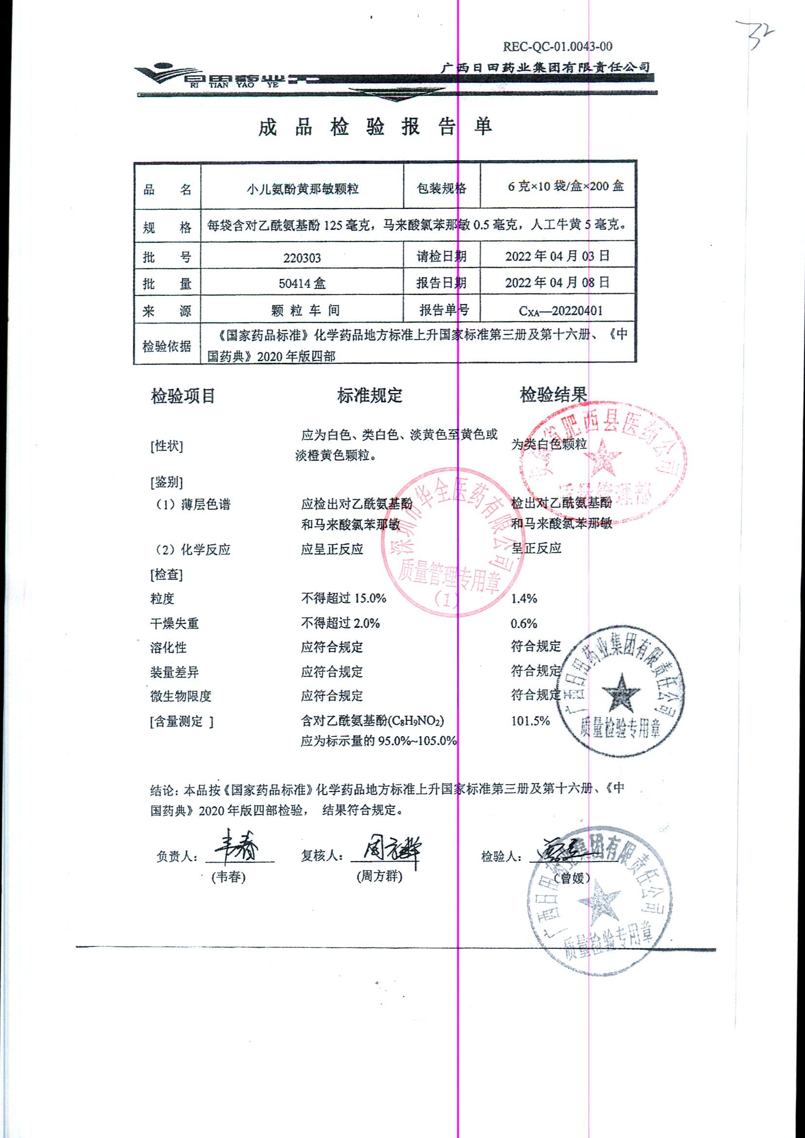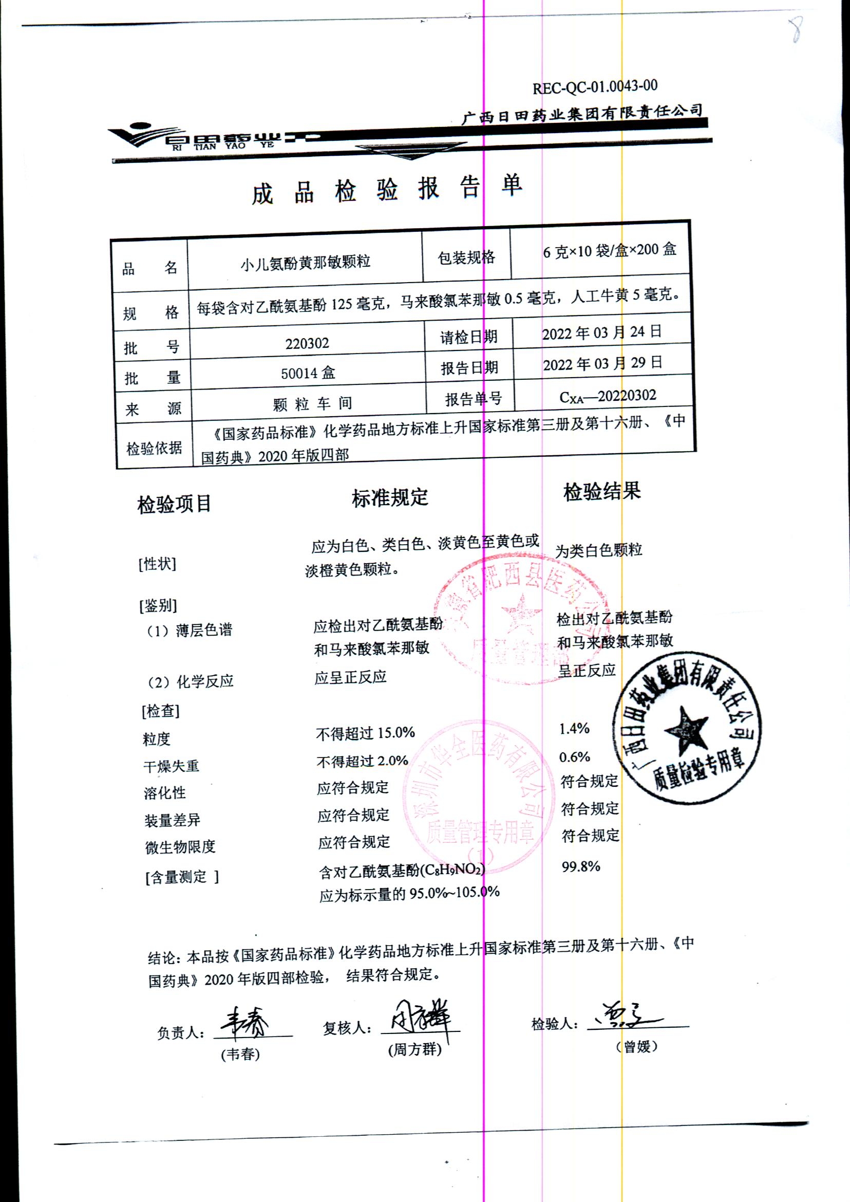 小儿氨酚黄那敏颗粒 | 125mg/6g*10袋/6g*15袋 | 220302 | 查看详情 |