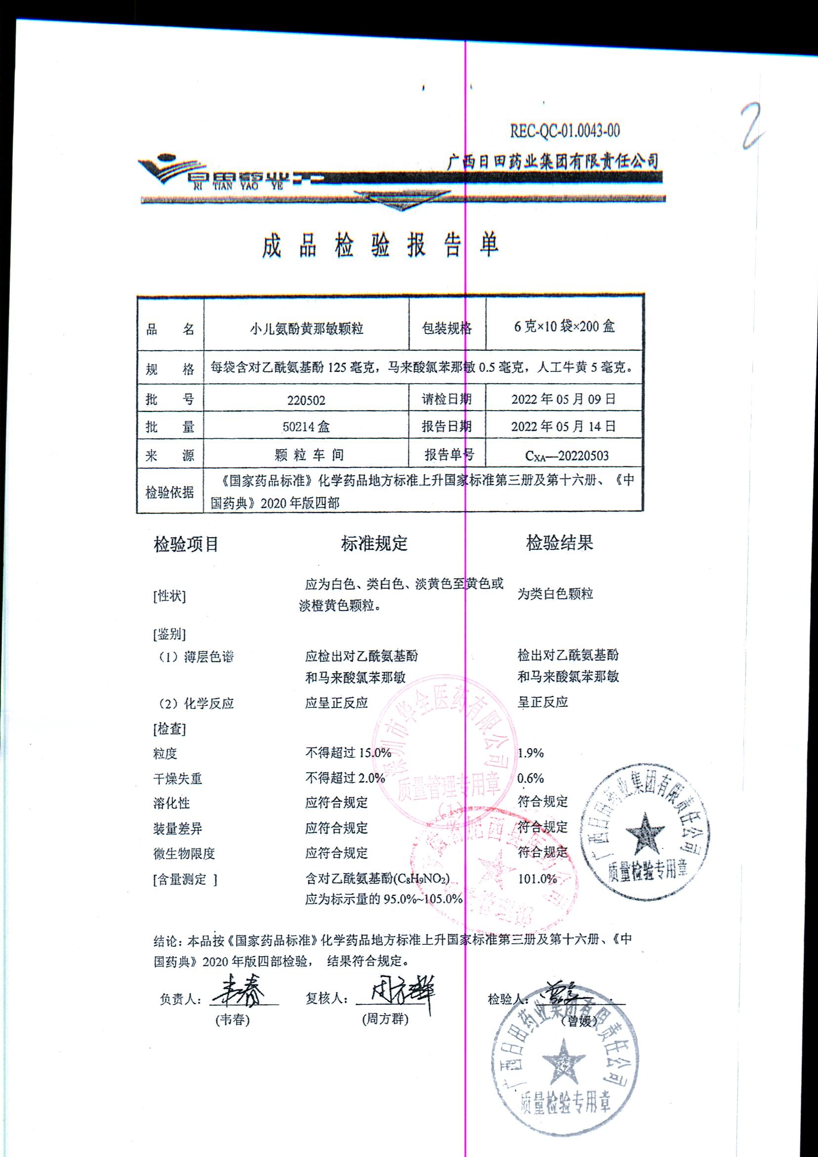 小儿氨酚黄那敏颗粒 | 125mg/6g*10袋/6g*15袋 | 220502 | 查看详情 |