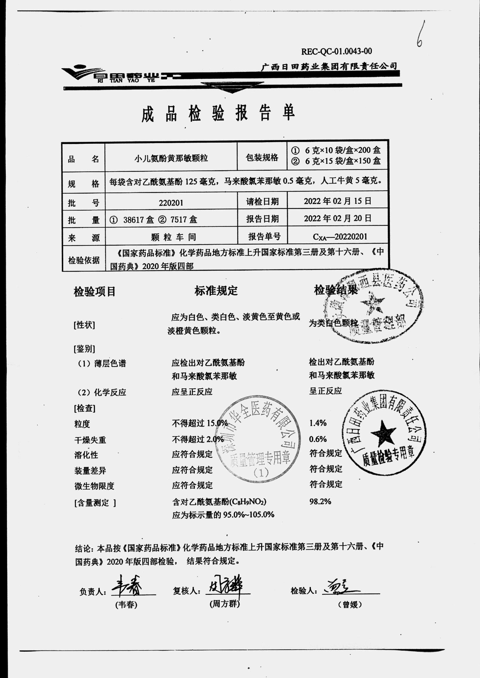 小儿氨酚黄那敏颗粒 | 125mg/6g*10袋/6g*15袋 | 220201 | 查看详情 |