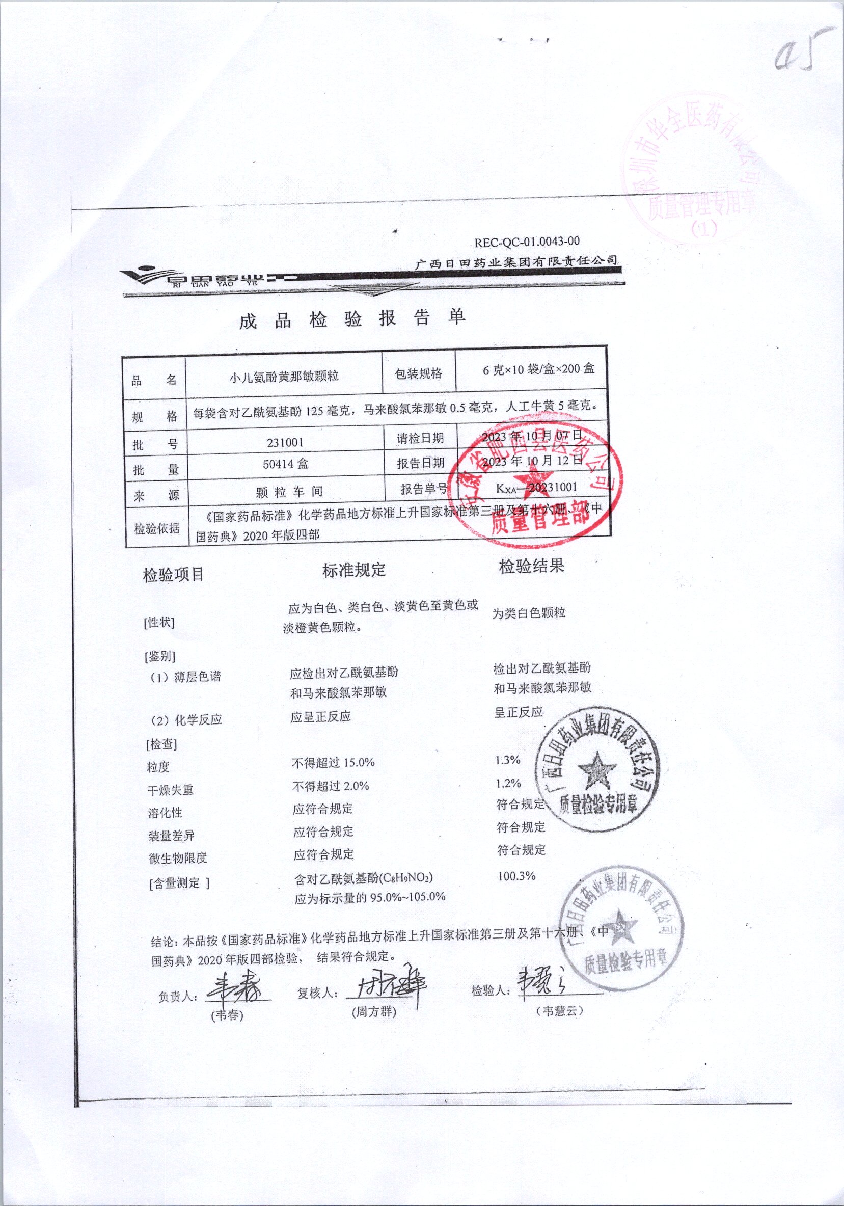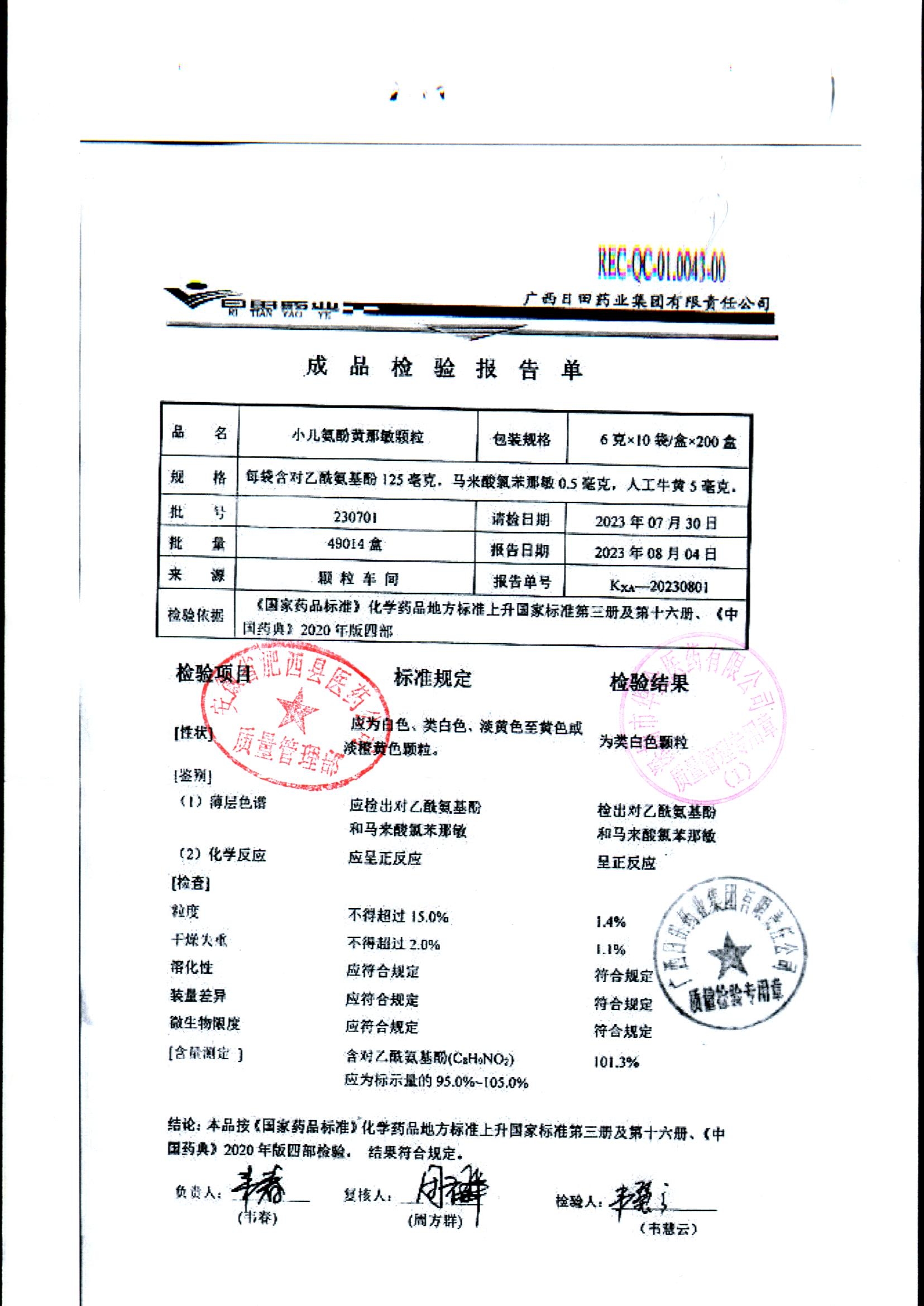 小儿氨酚黄那敏颗粒 | 125mg/6g*10袋/6g*15袋 | 230701 | 查看详情 |