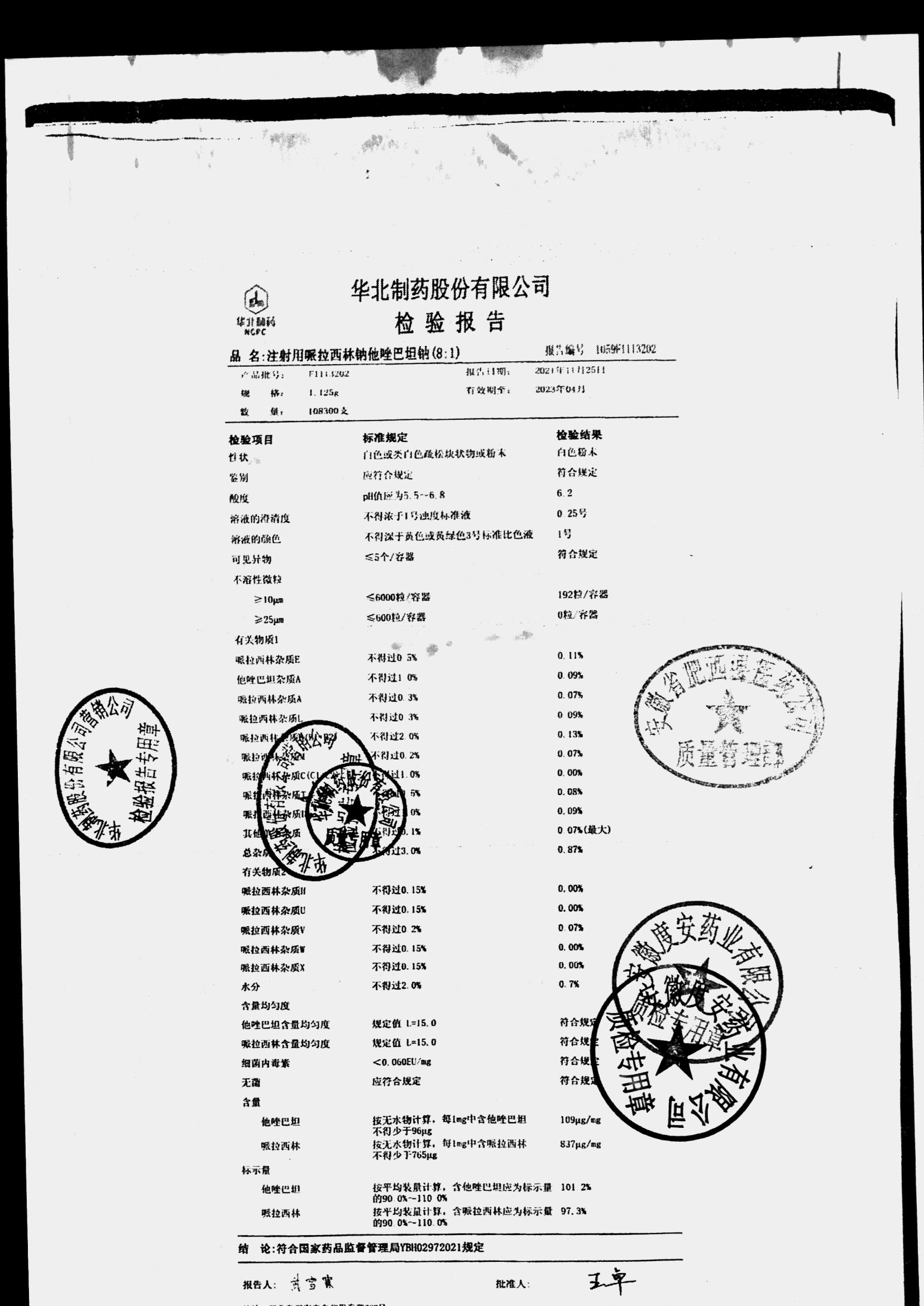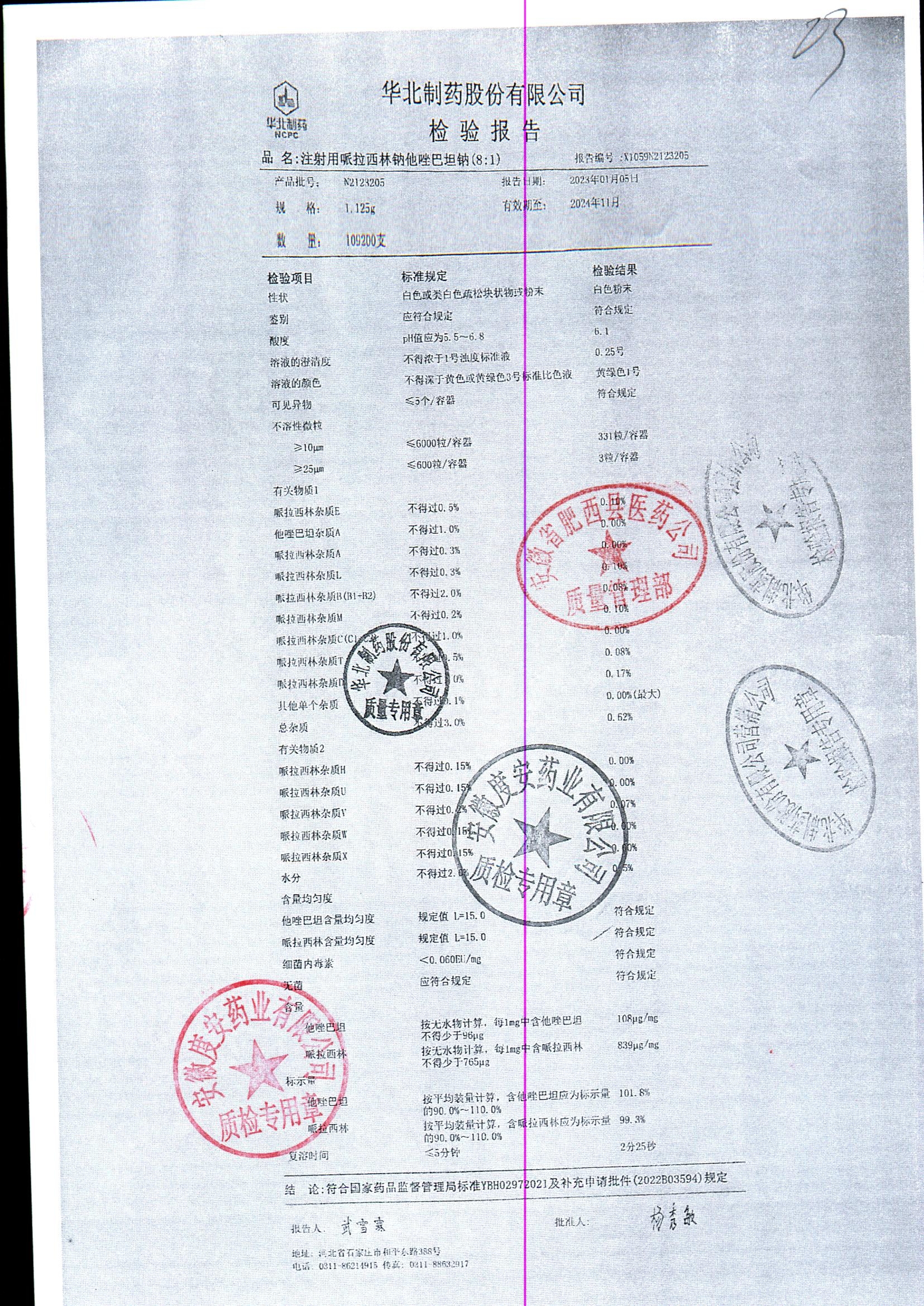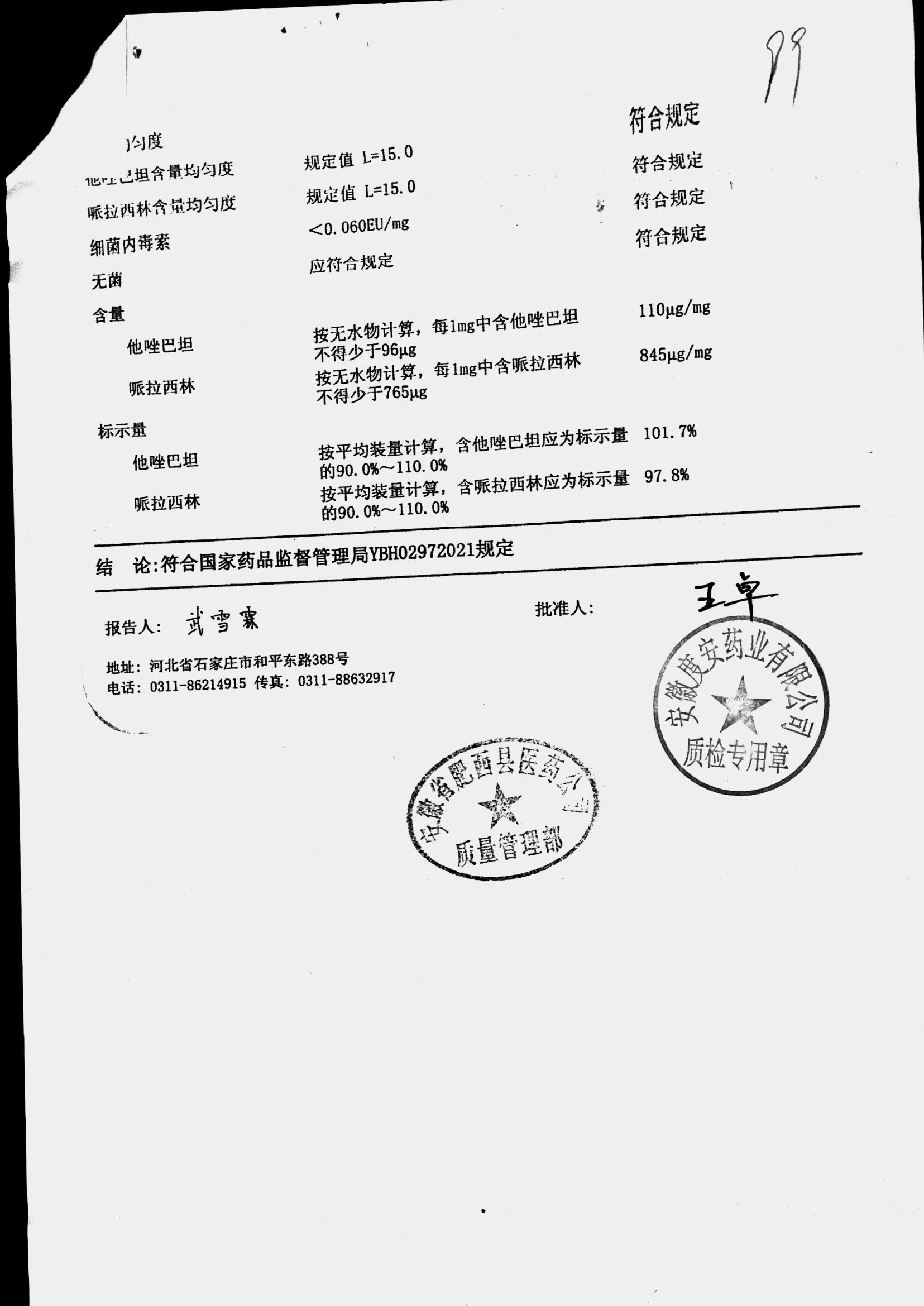 注射用哌拉西林钠他唑巴坦钠 | 1.125g | N2123205 | 查看详情 |