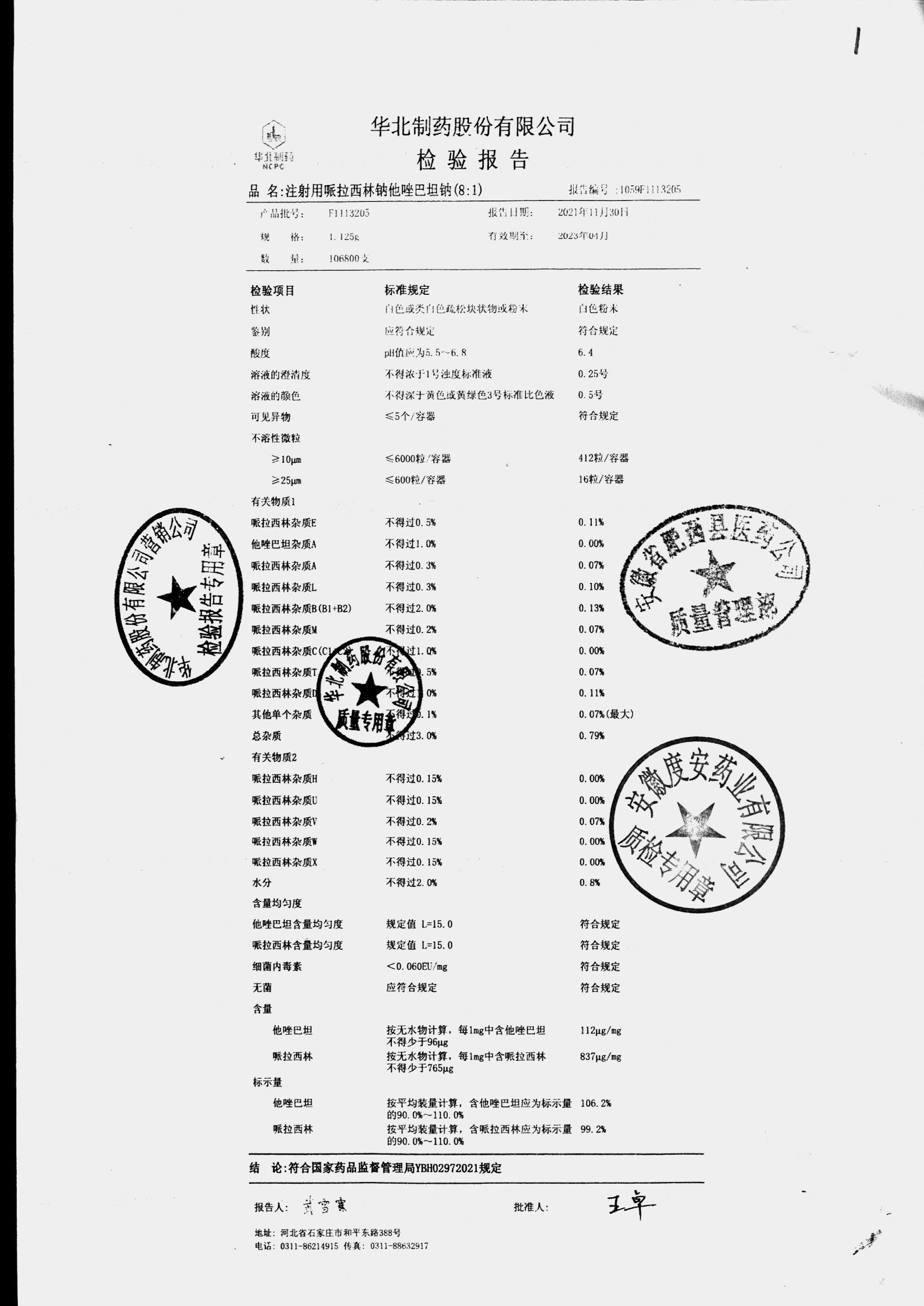 注射用哌拉西林钠他唑巴坦钠 | 1.125g | F1113202/1 | 查看详情 |
