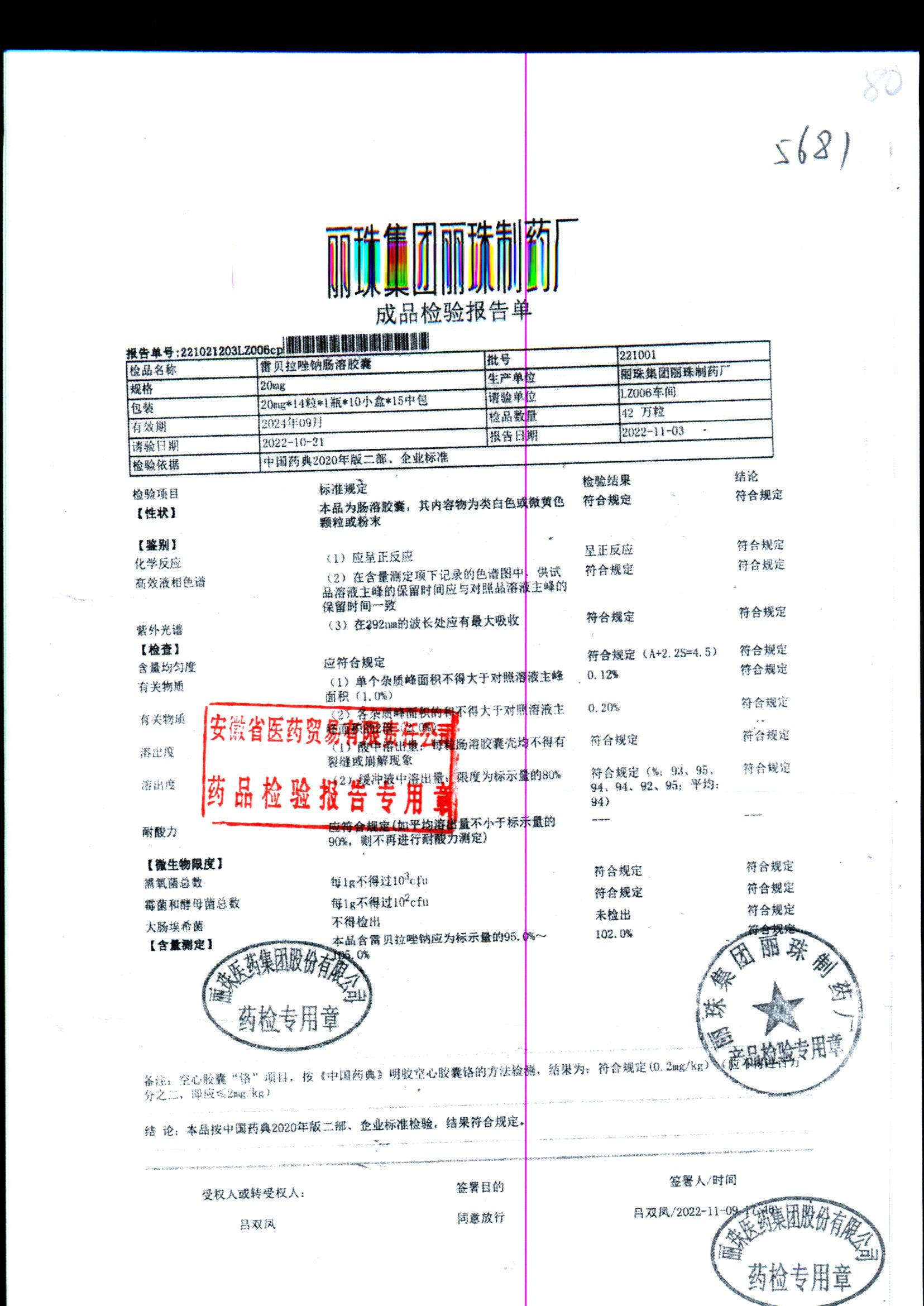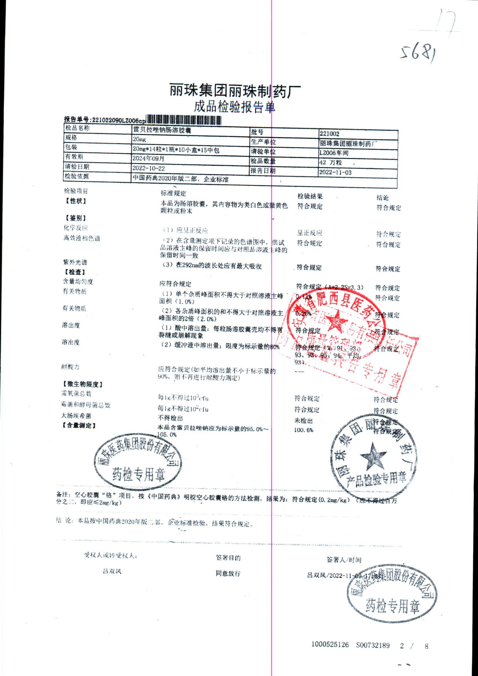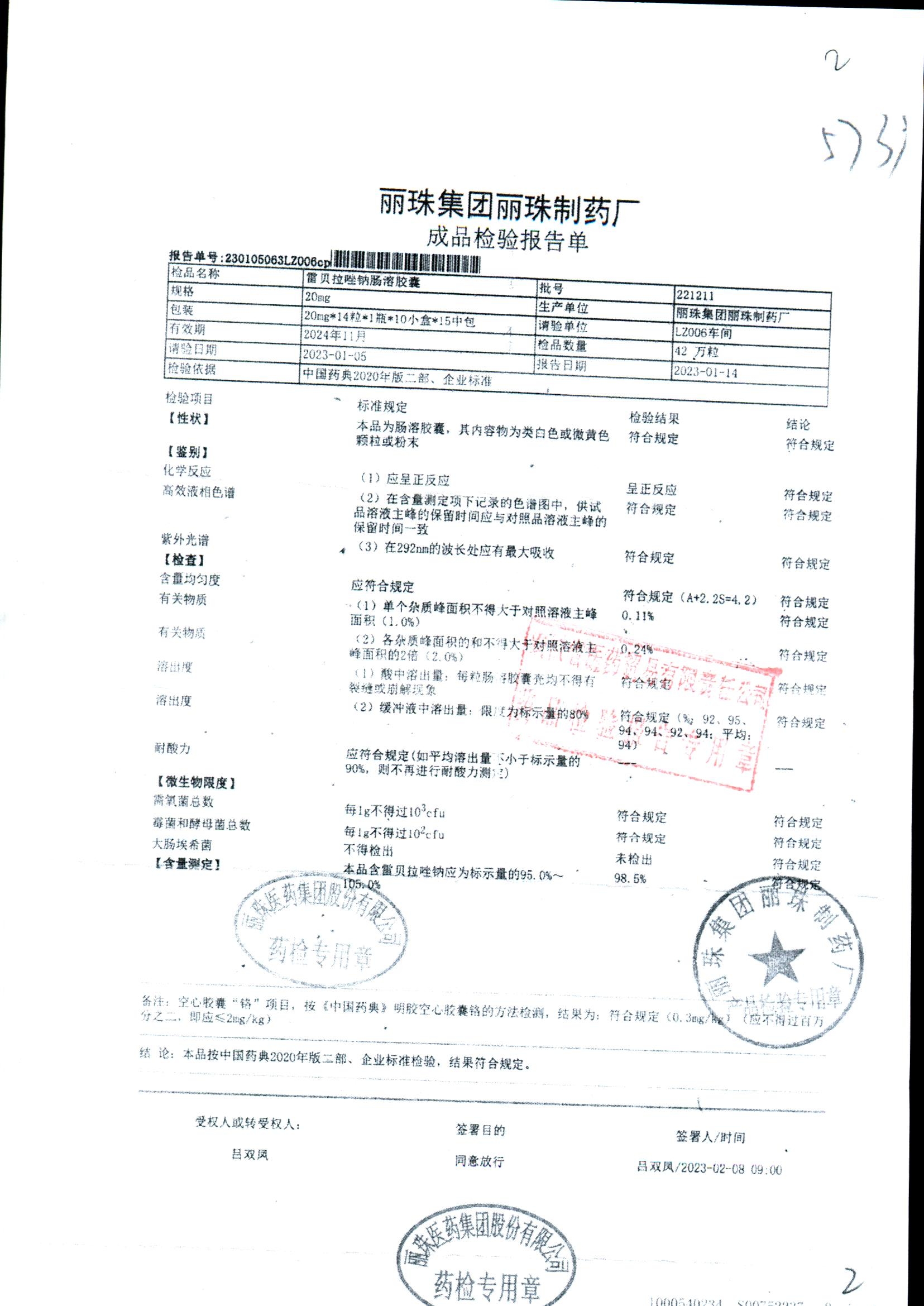 雷贝拉唑钠肠溶胶囊 | 20mg*14粒 | 220205 | 查看详情 |