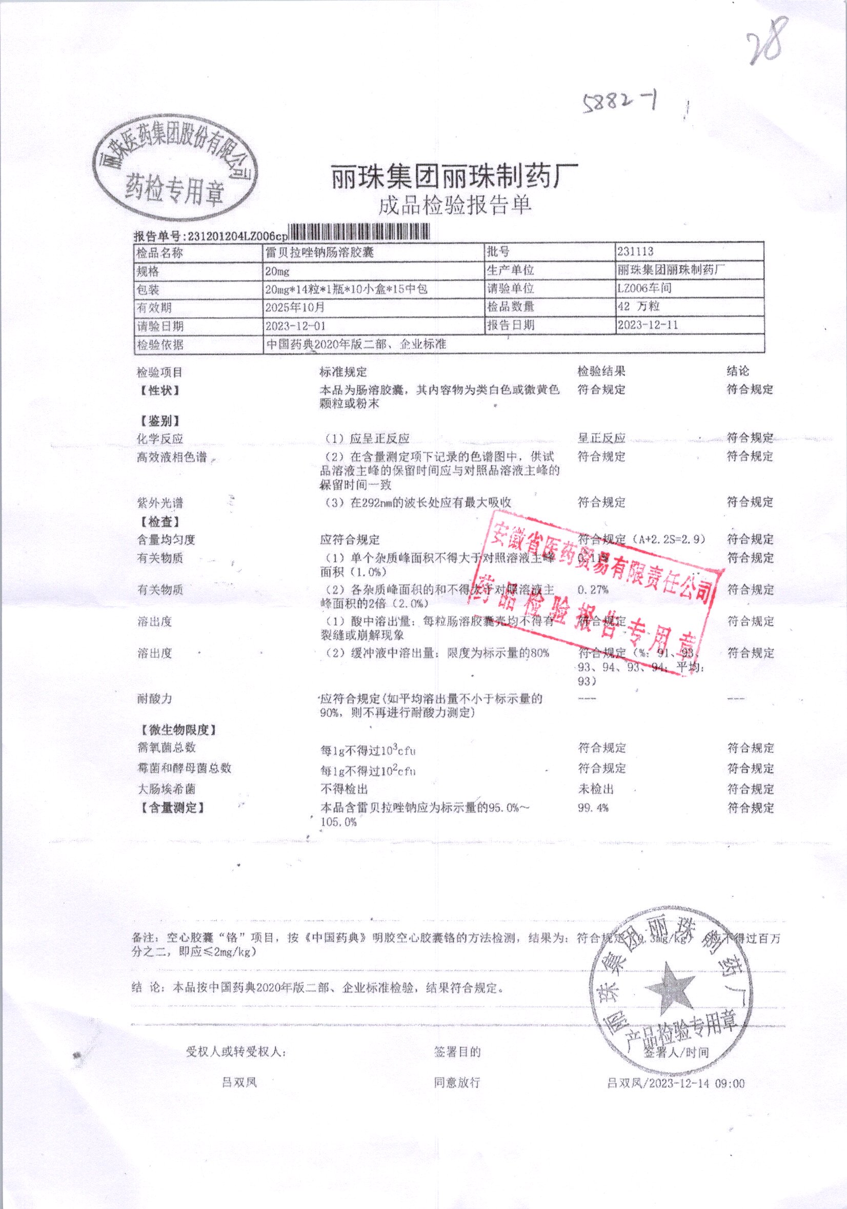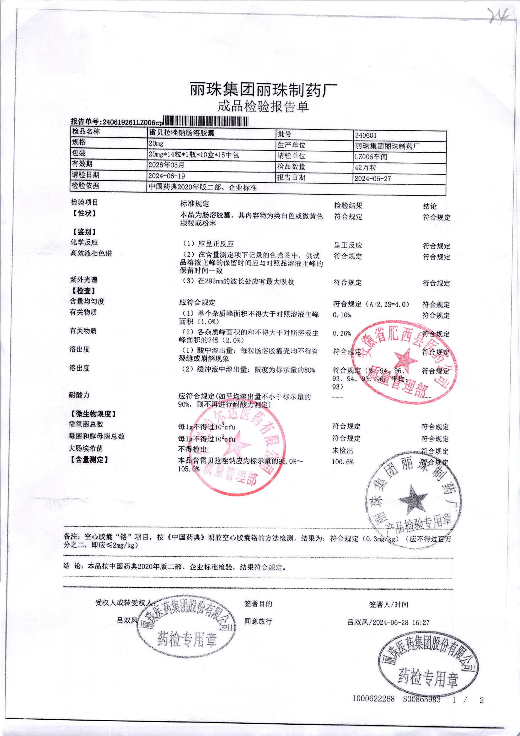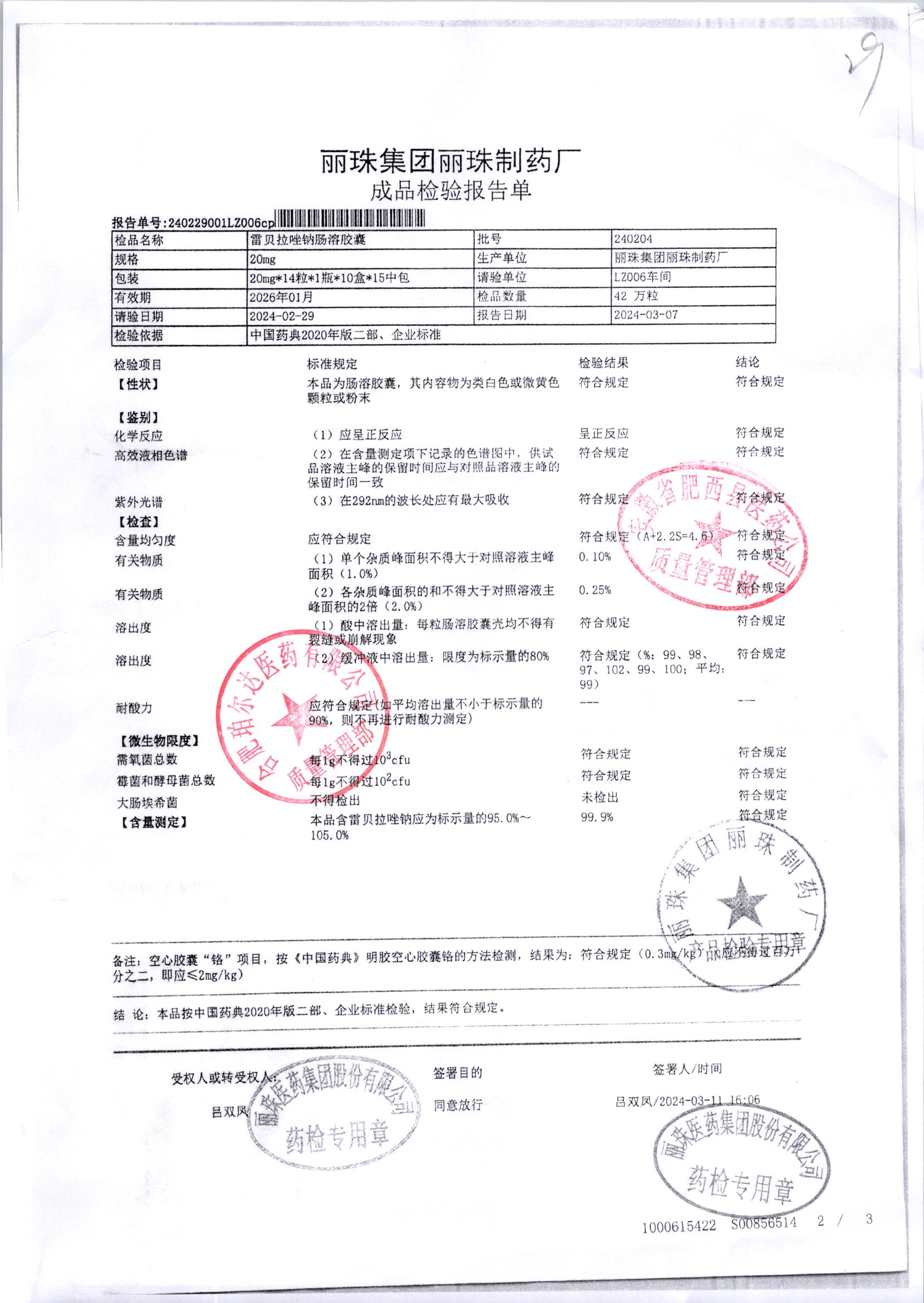 雷贝拉唑钠肠溶胶囊 | 20mg*14粒 | 240601 | 查看详情 |