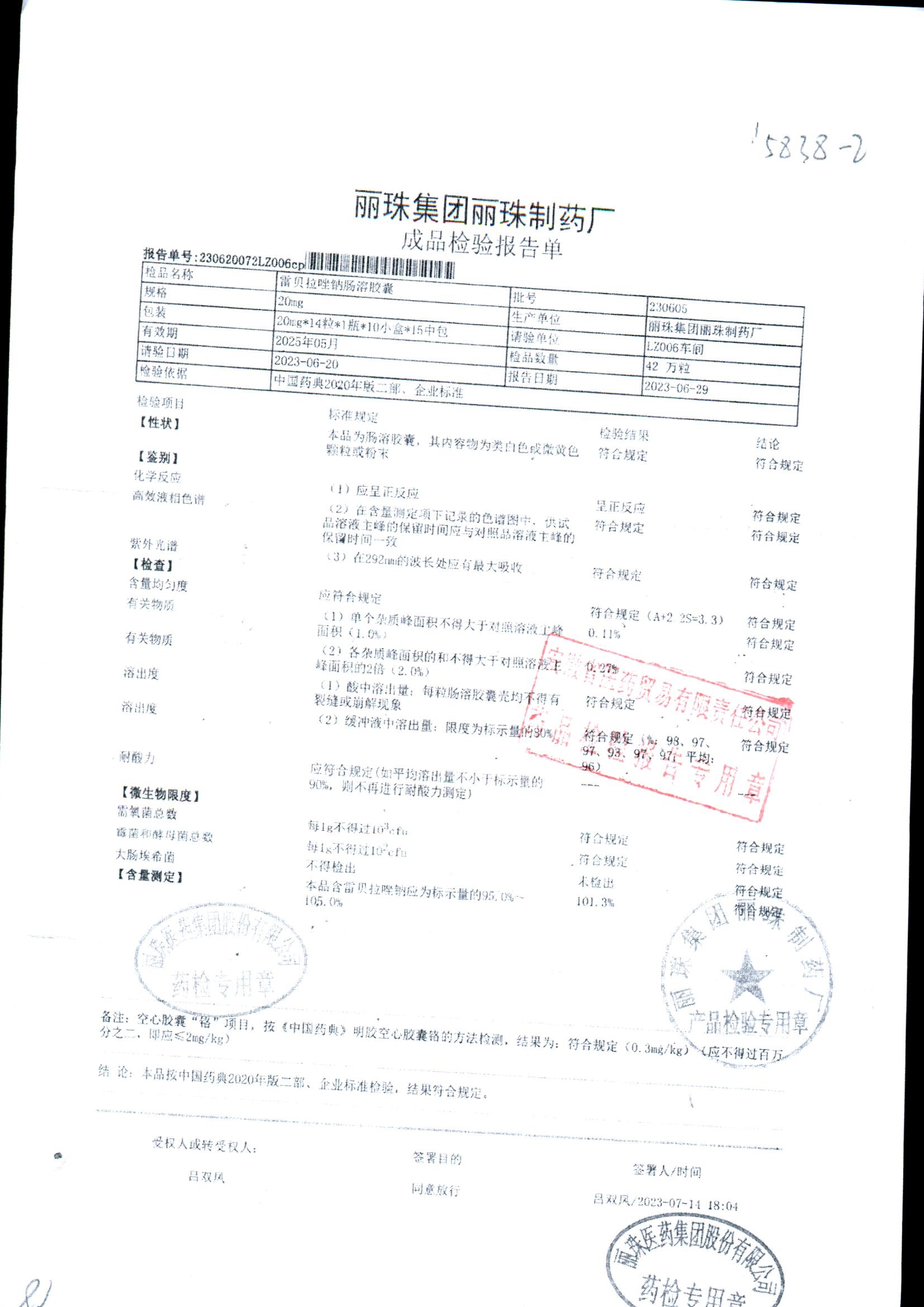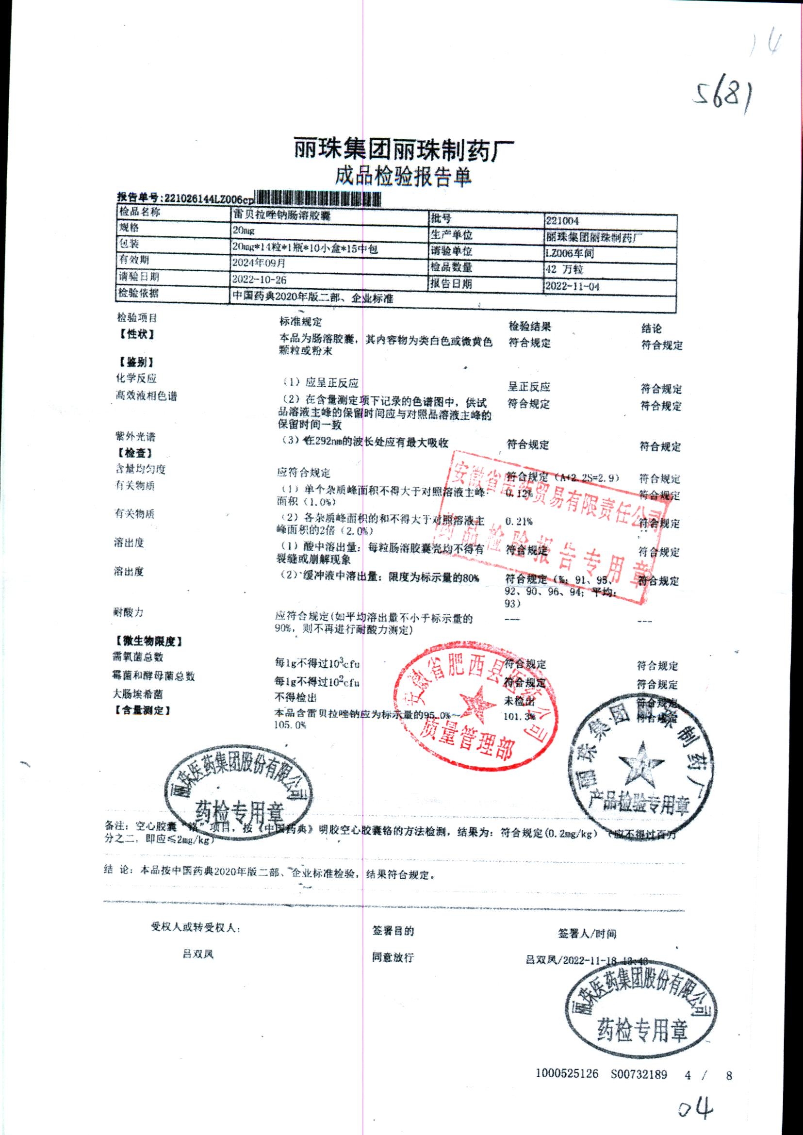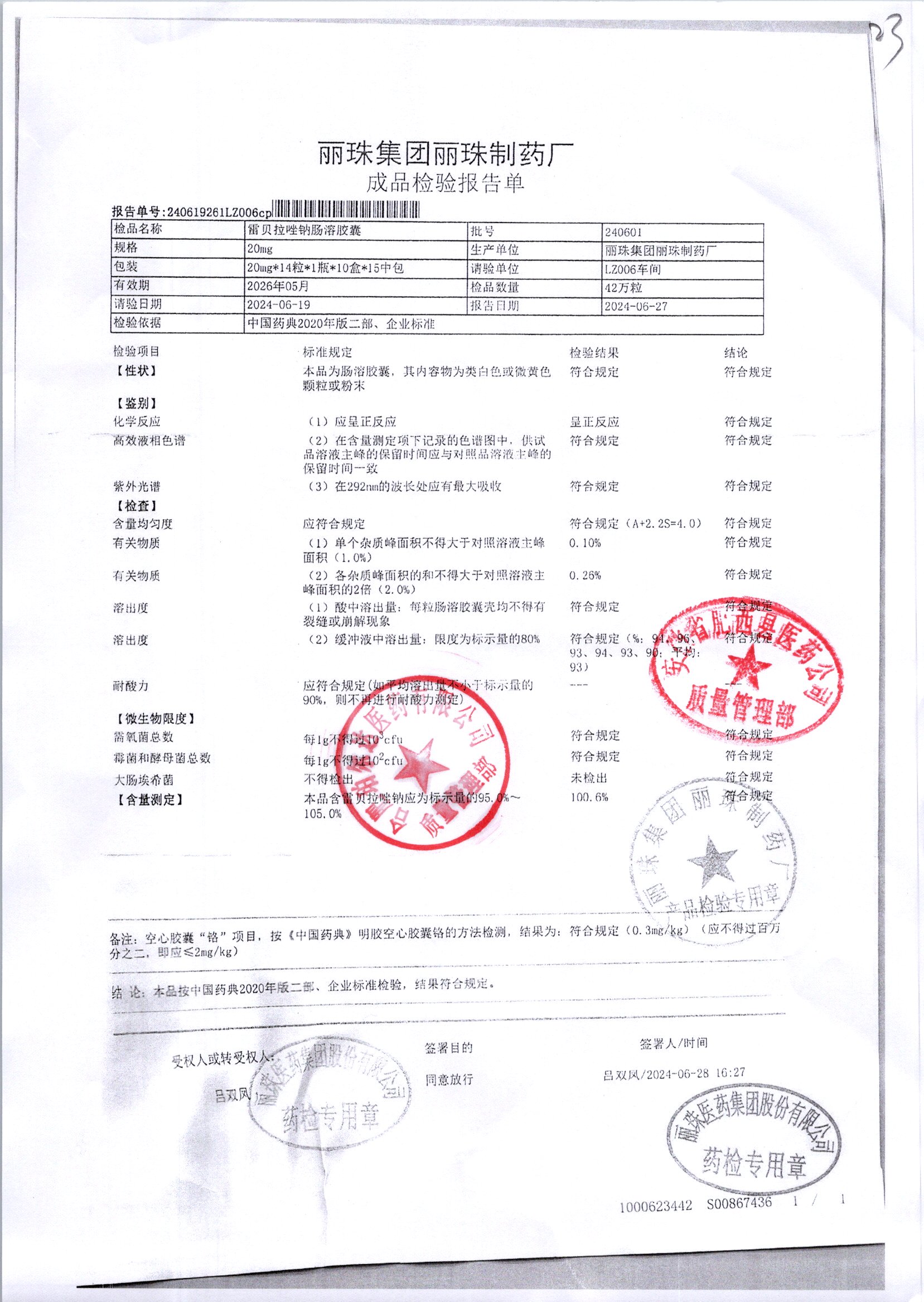 雷贝拉唑钠肠溶胶囊 | 20mg*14粒 | 240601 | 查看详情 |