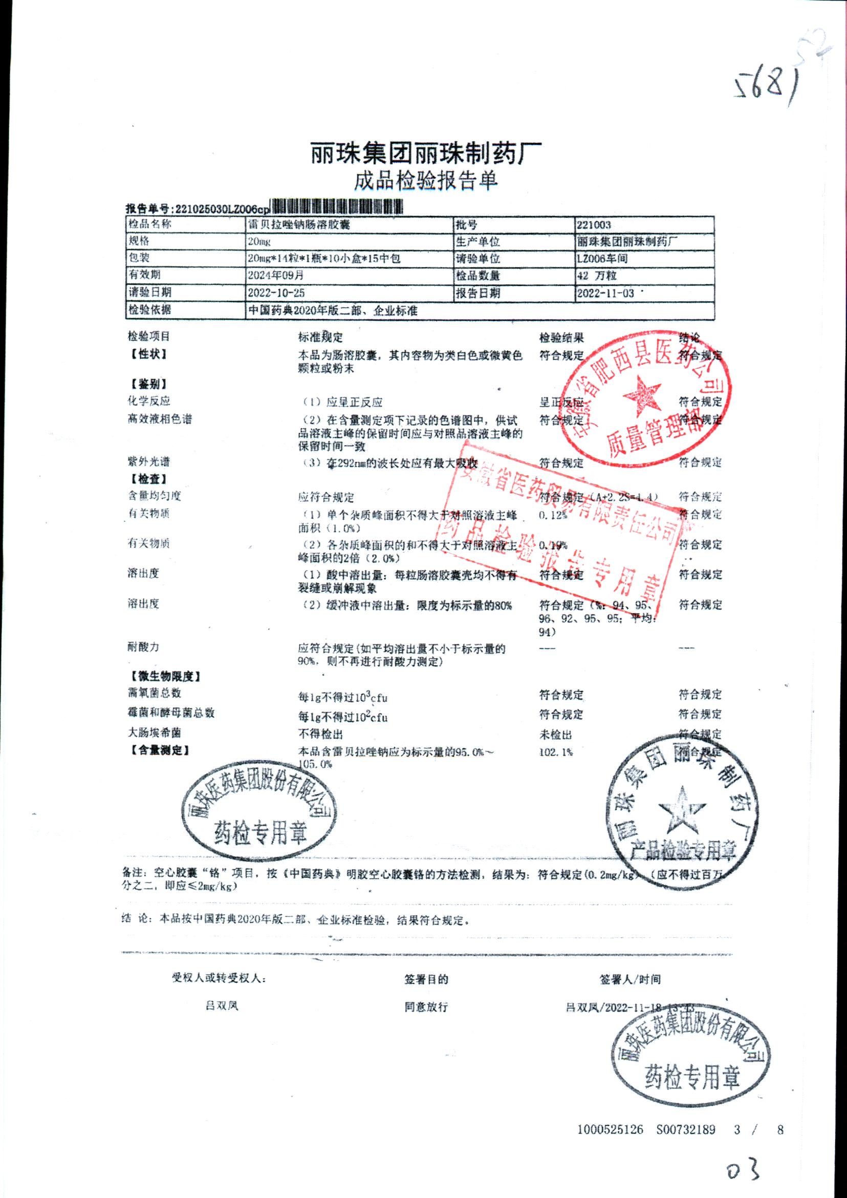 雷贝拉唑钠肠溶胶囊 | 20mg*14粒 | 221003 | 查看详情 |