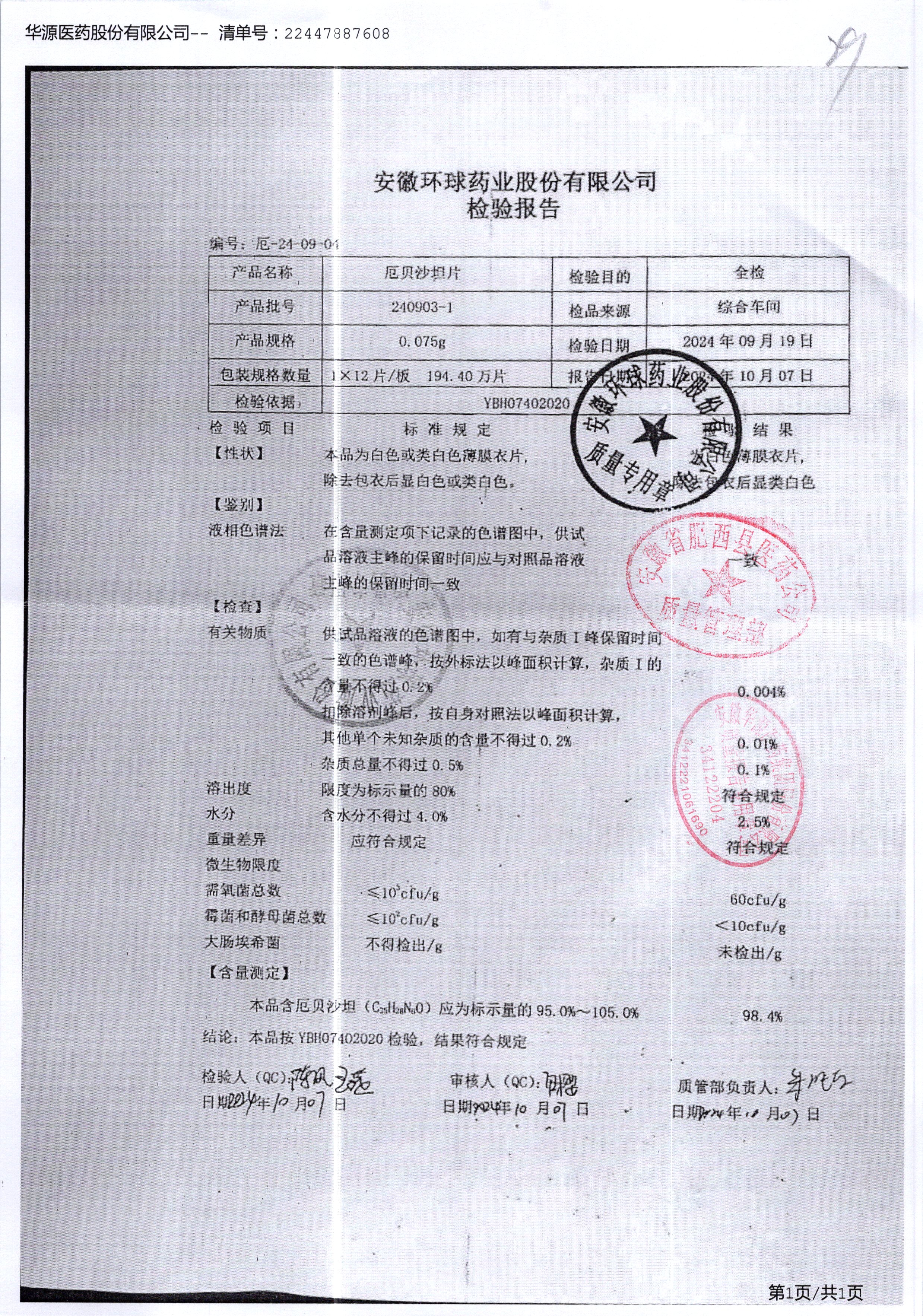 厄贝沙坦片 | 0.075g | 240903-1 | 查看详情 |