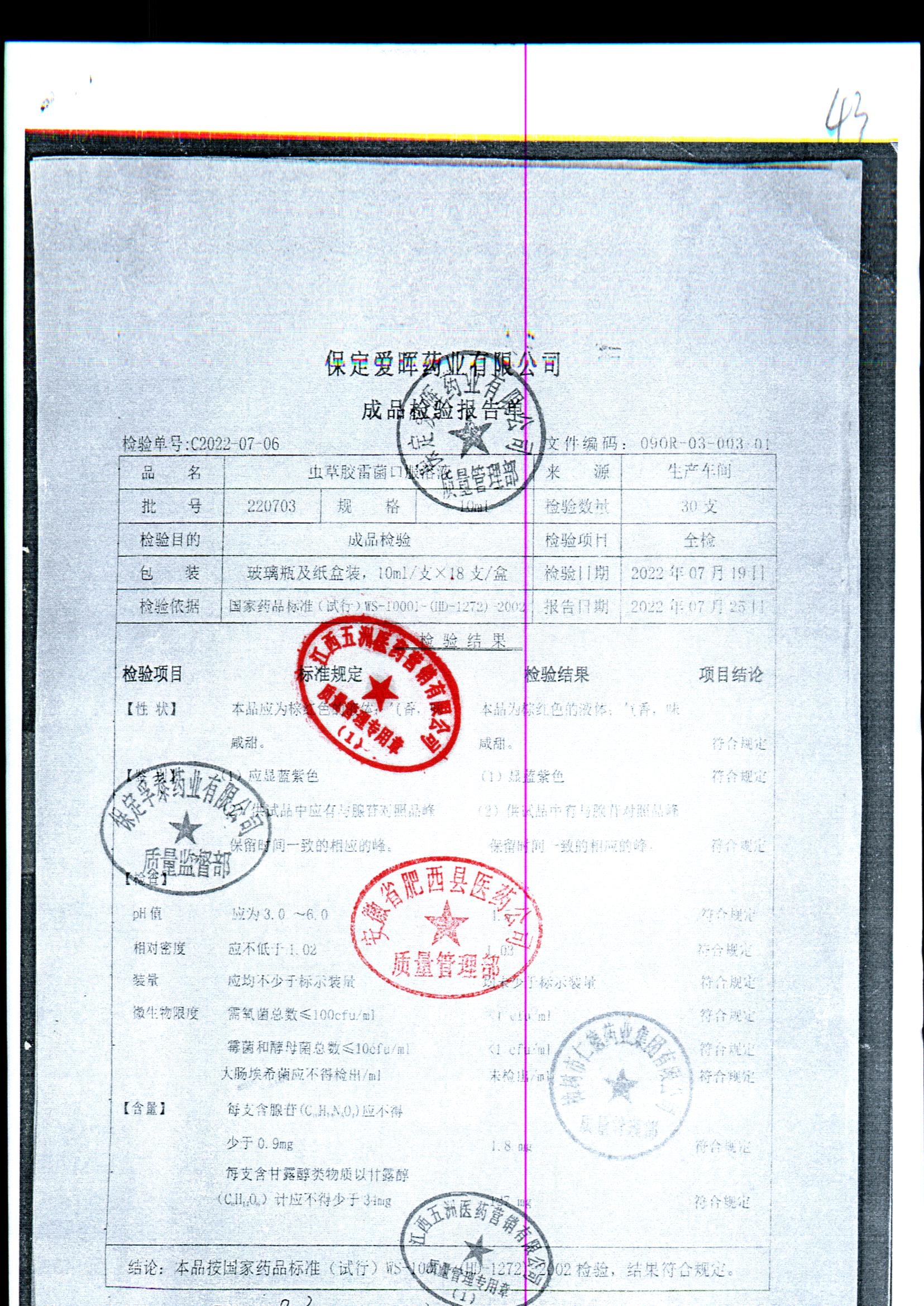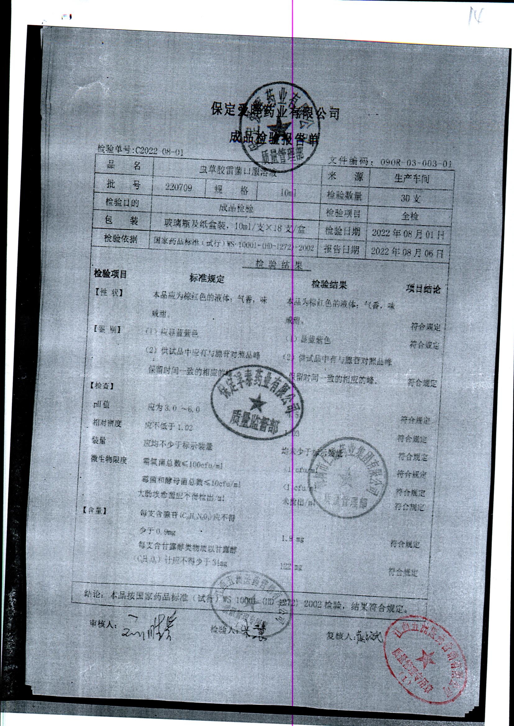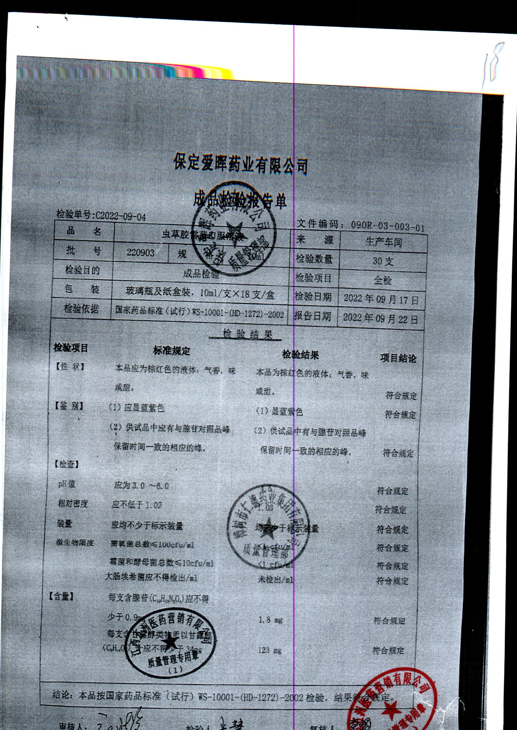 虫草胶雷菌口服溶液 | 10ml*18支 | 220809 | 查看详情 |