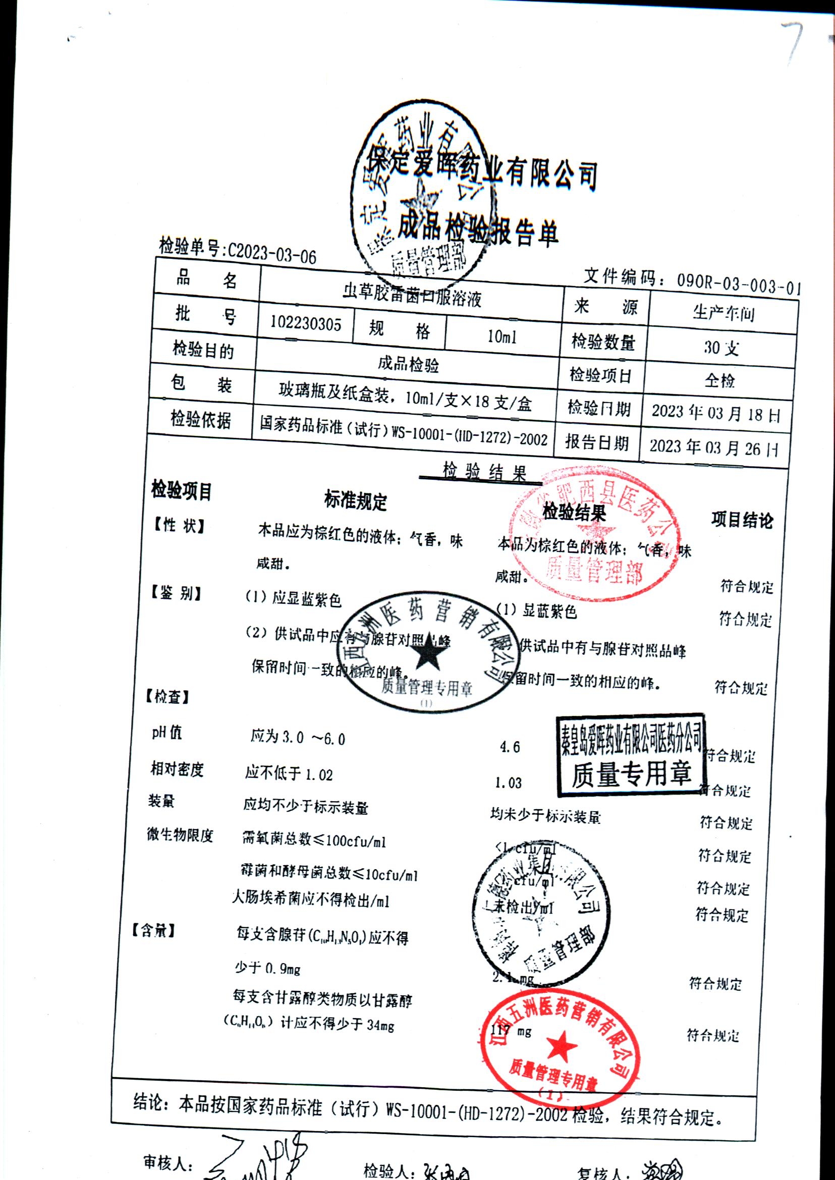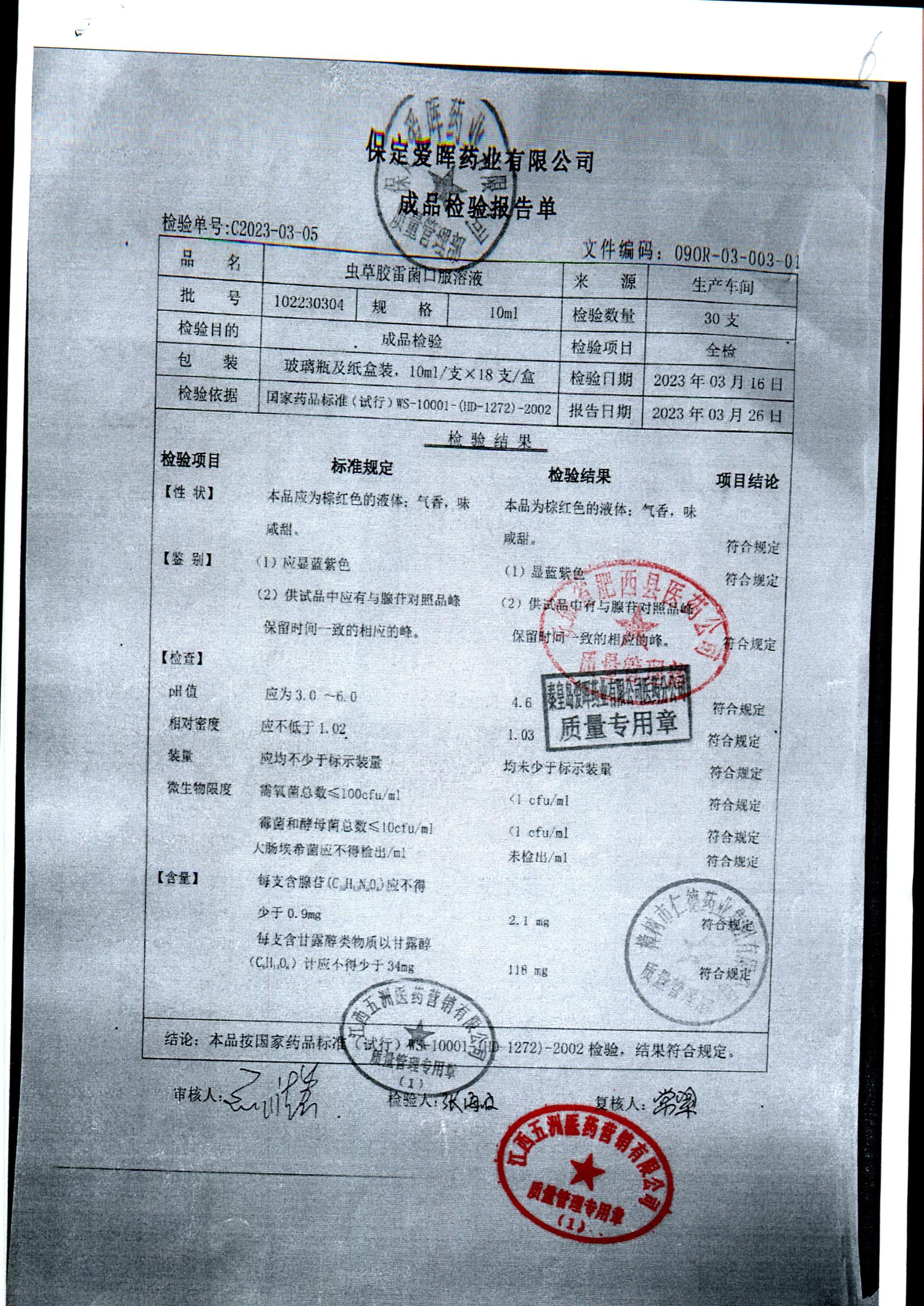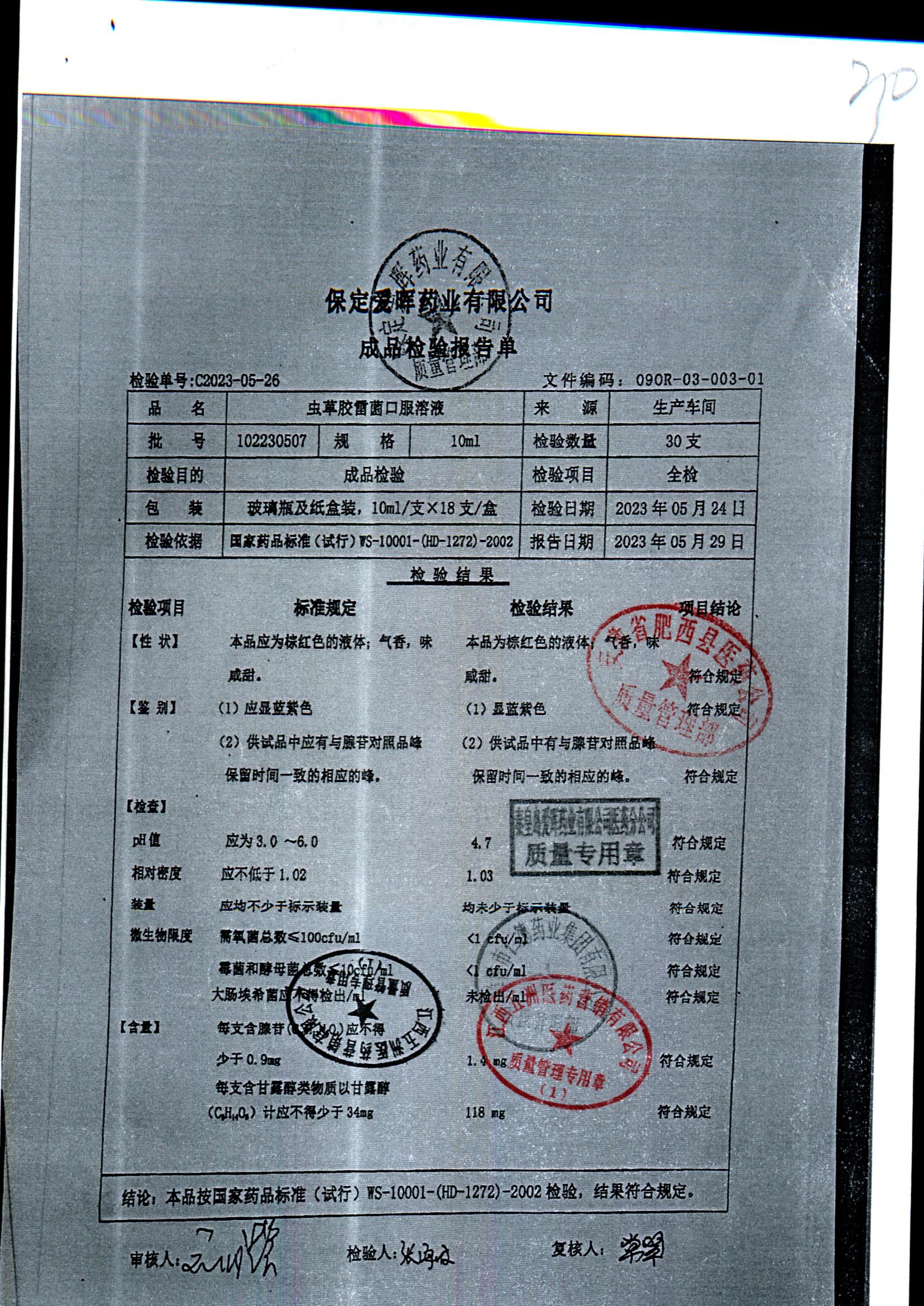 虫草胶雷菌口服溶液 | 10ml*18支 | 220503 | 查看详情 |
