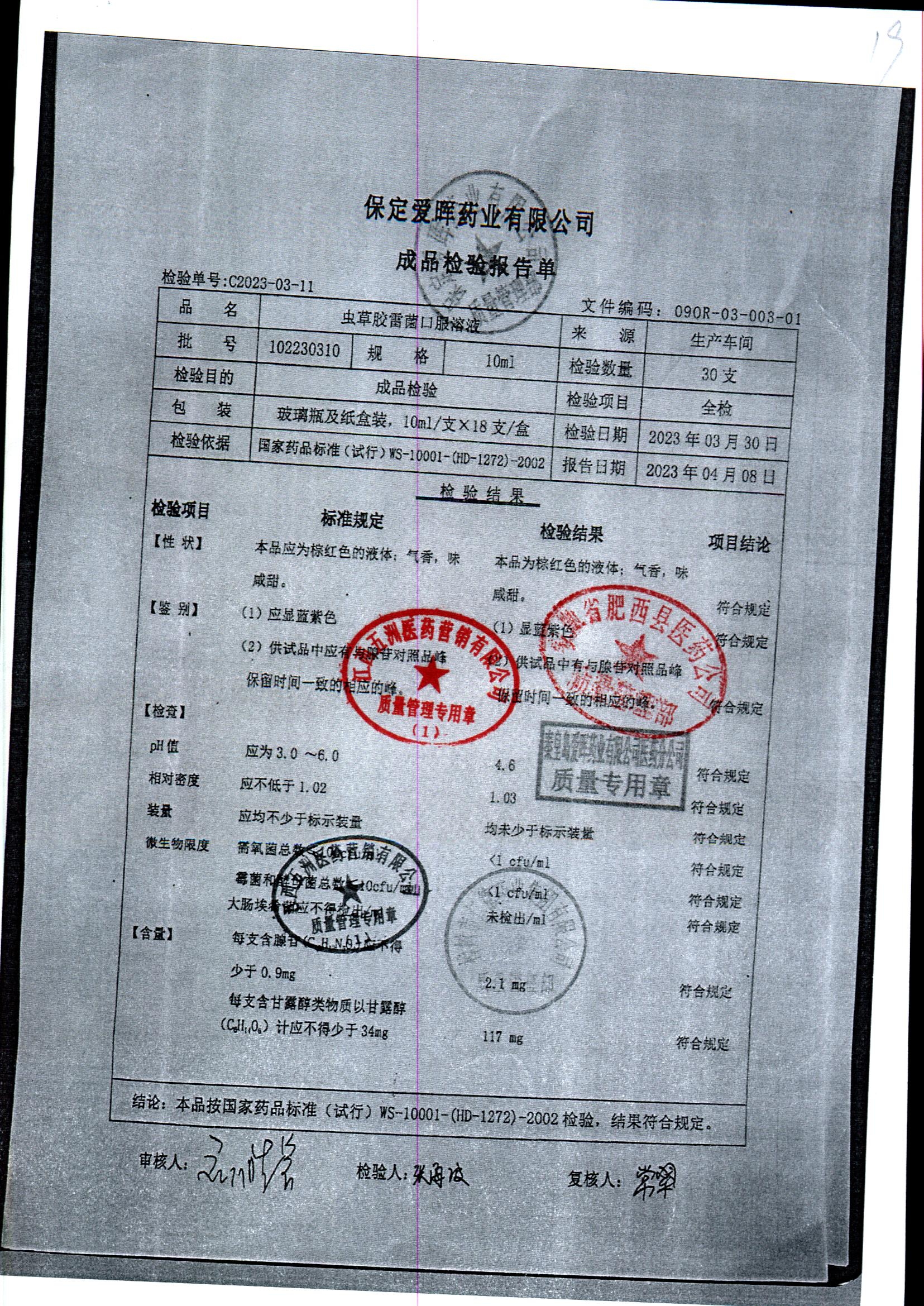 虫草胶雷菌口服溶液 | 10ml*18支 | 220307 | 查看详情 |