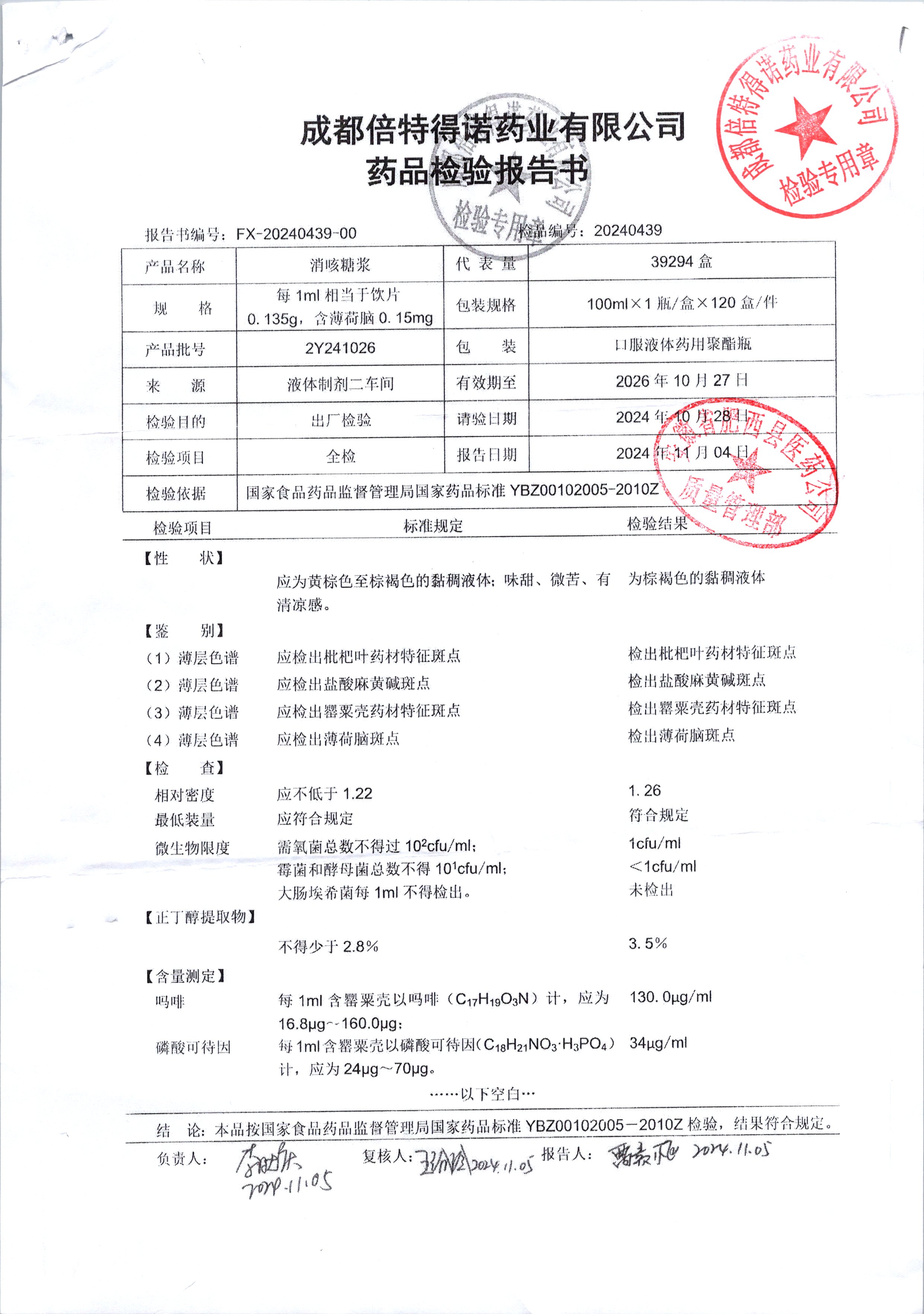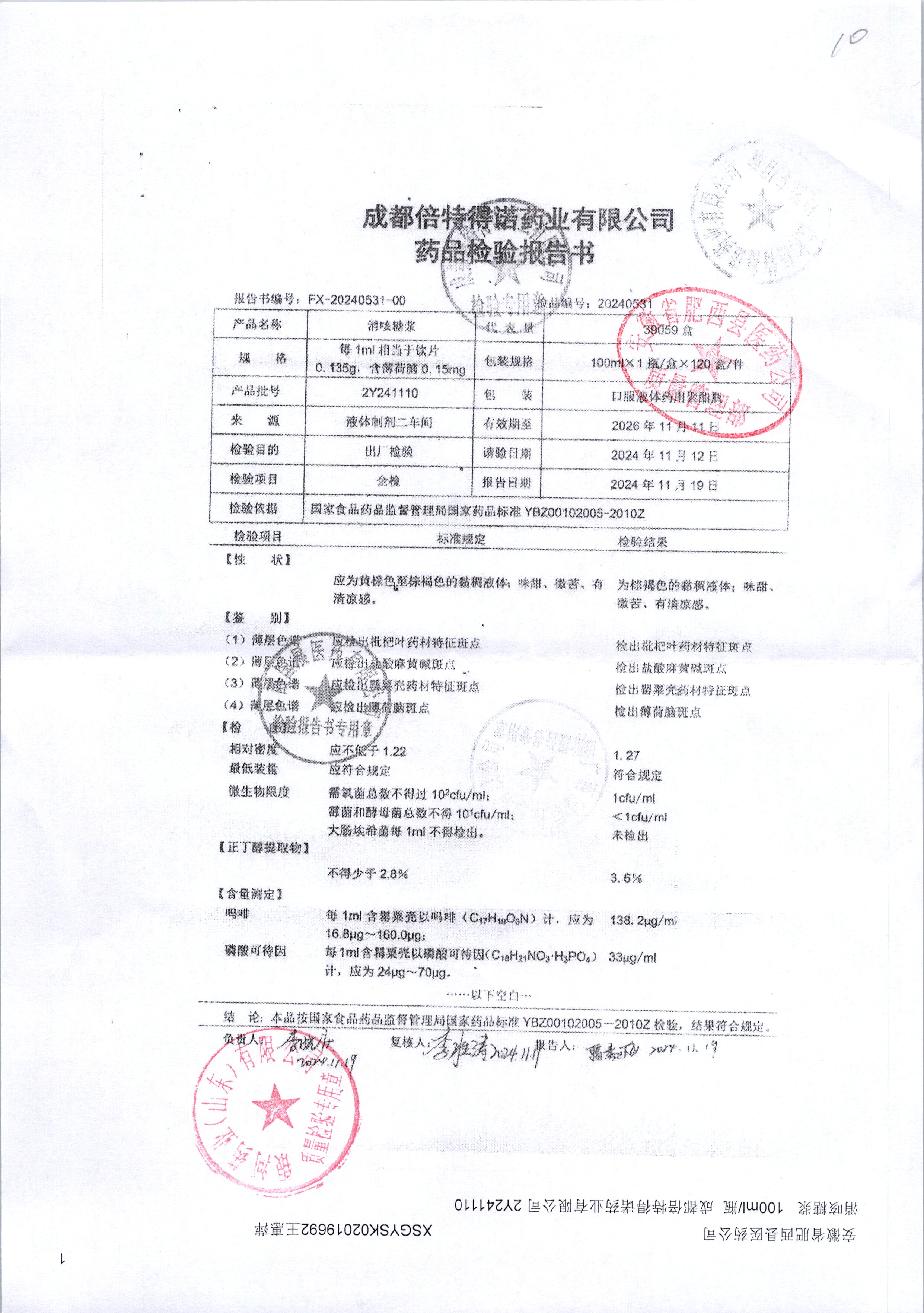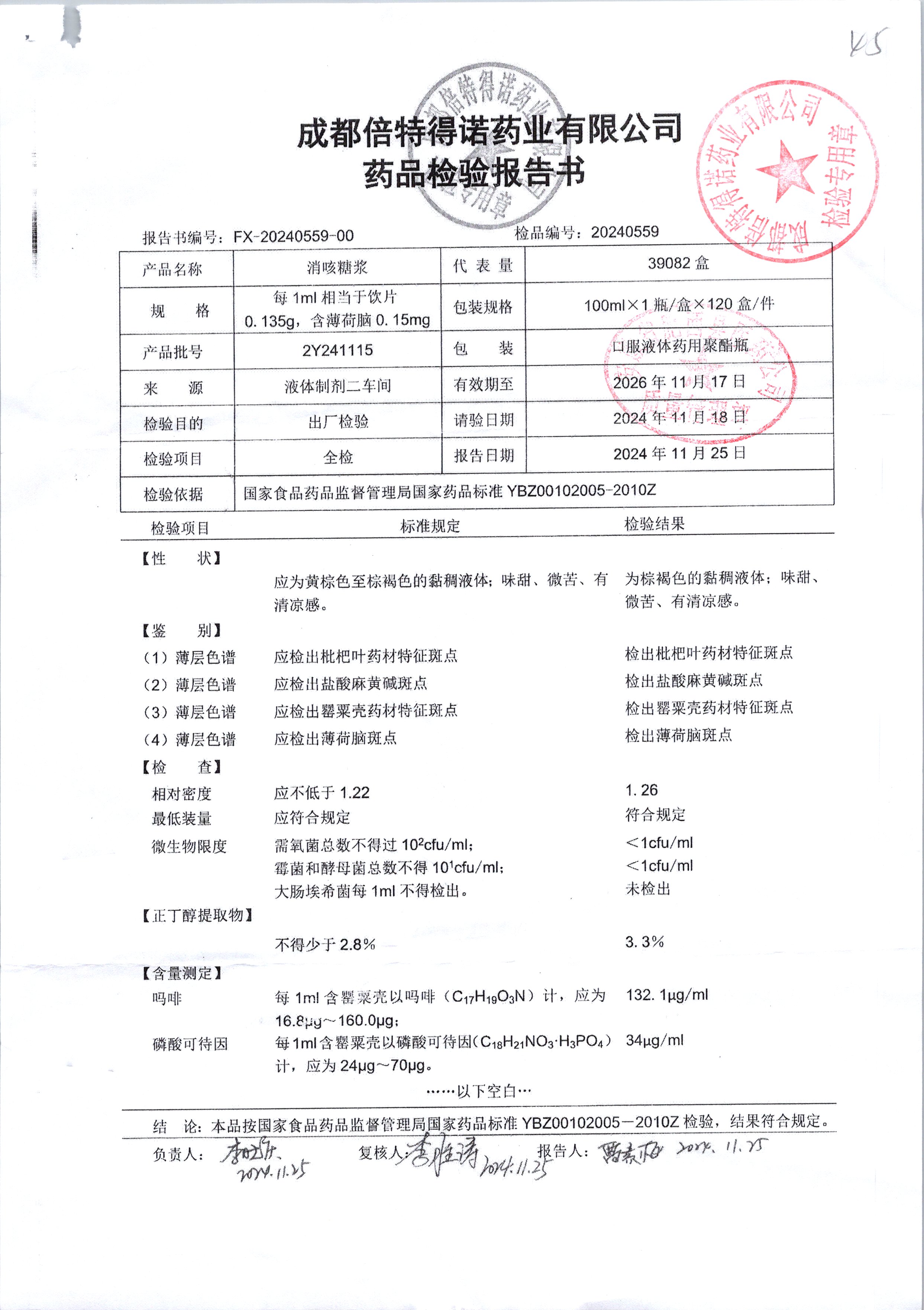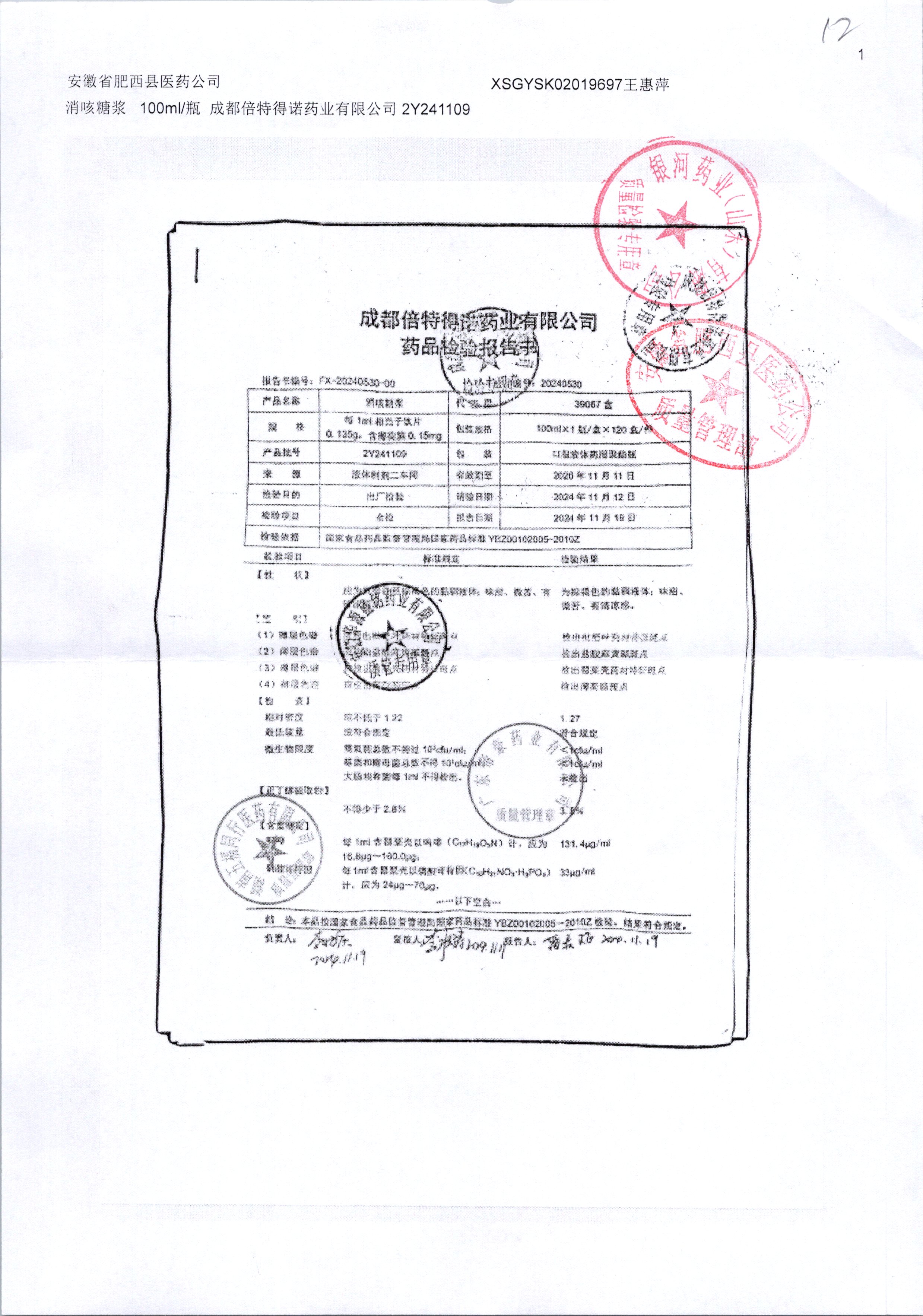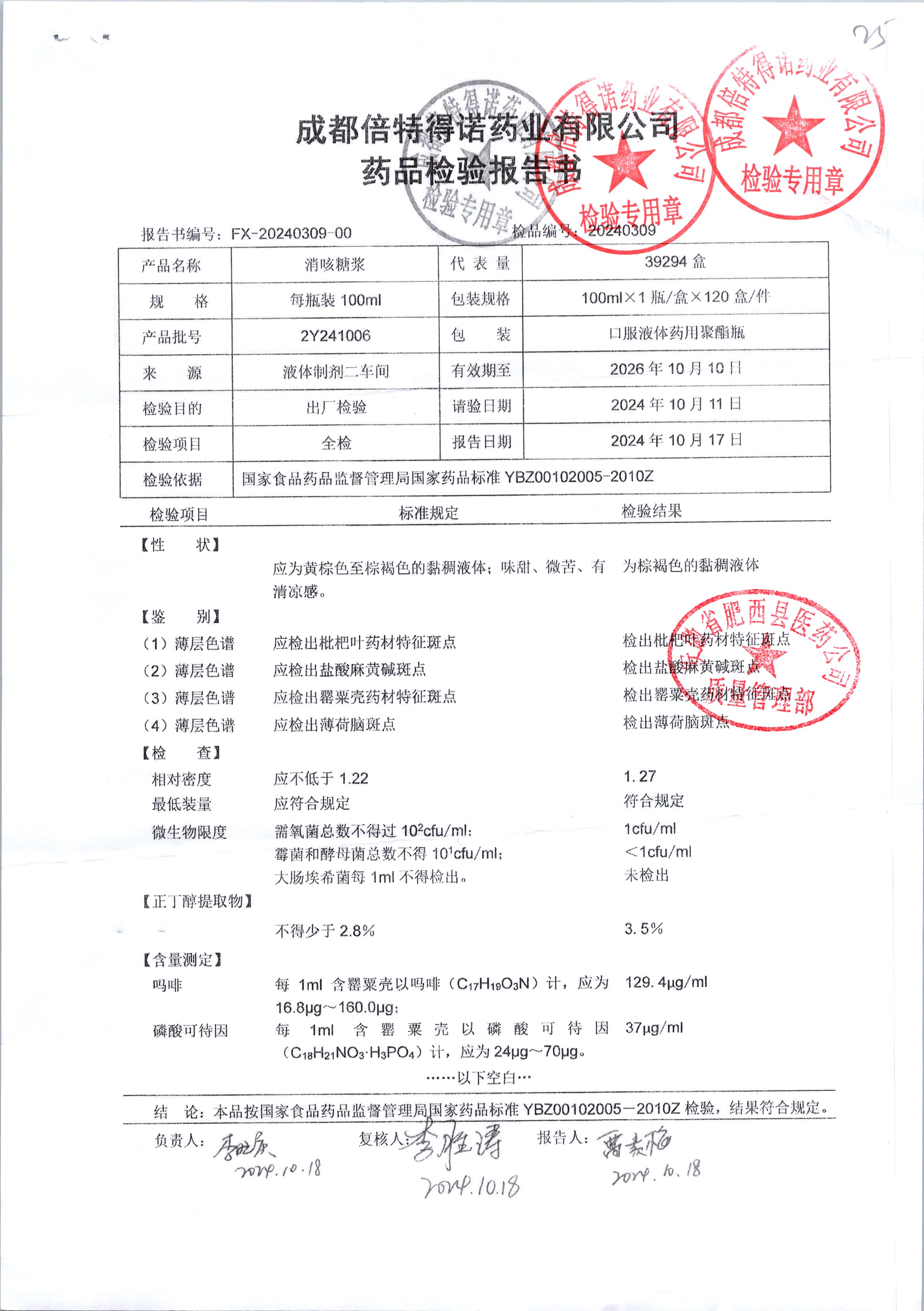 | 消咳糖浆 | 100ml | 2Y241109 | 查看详情 |