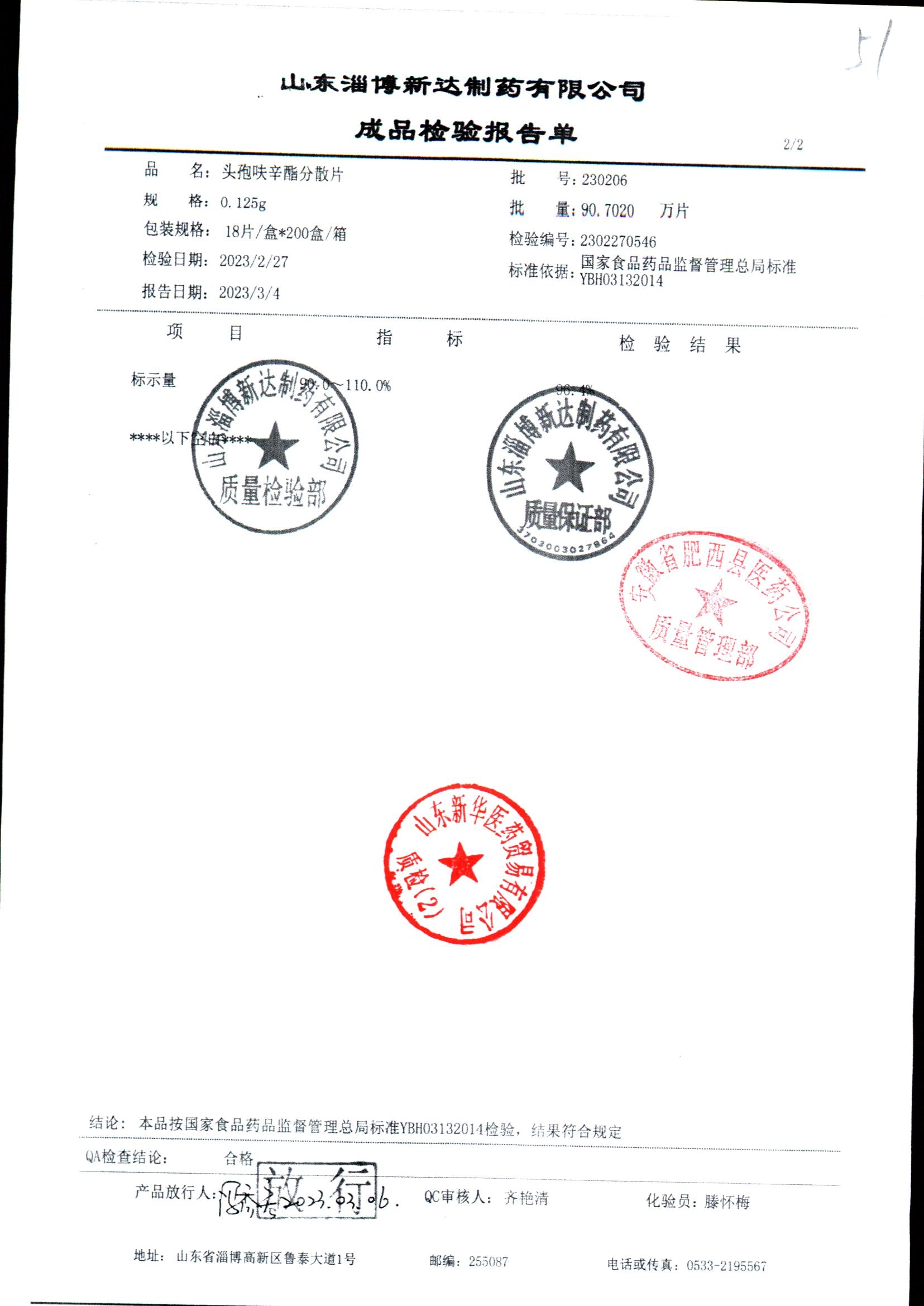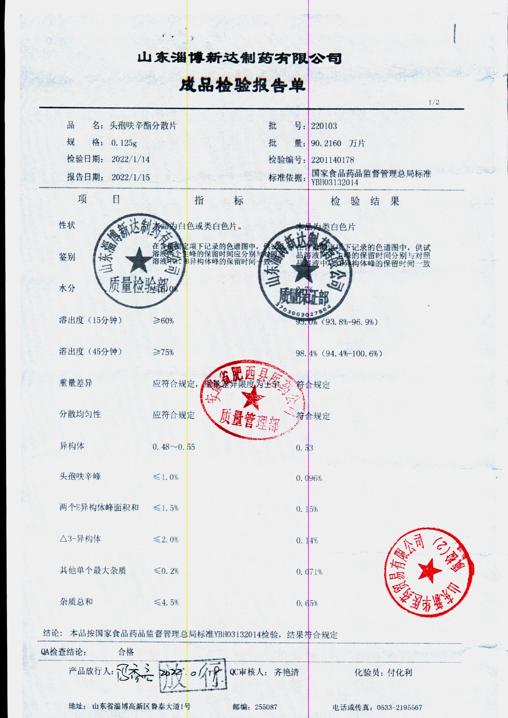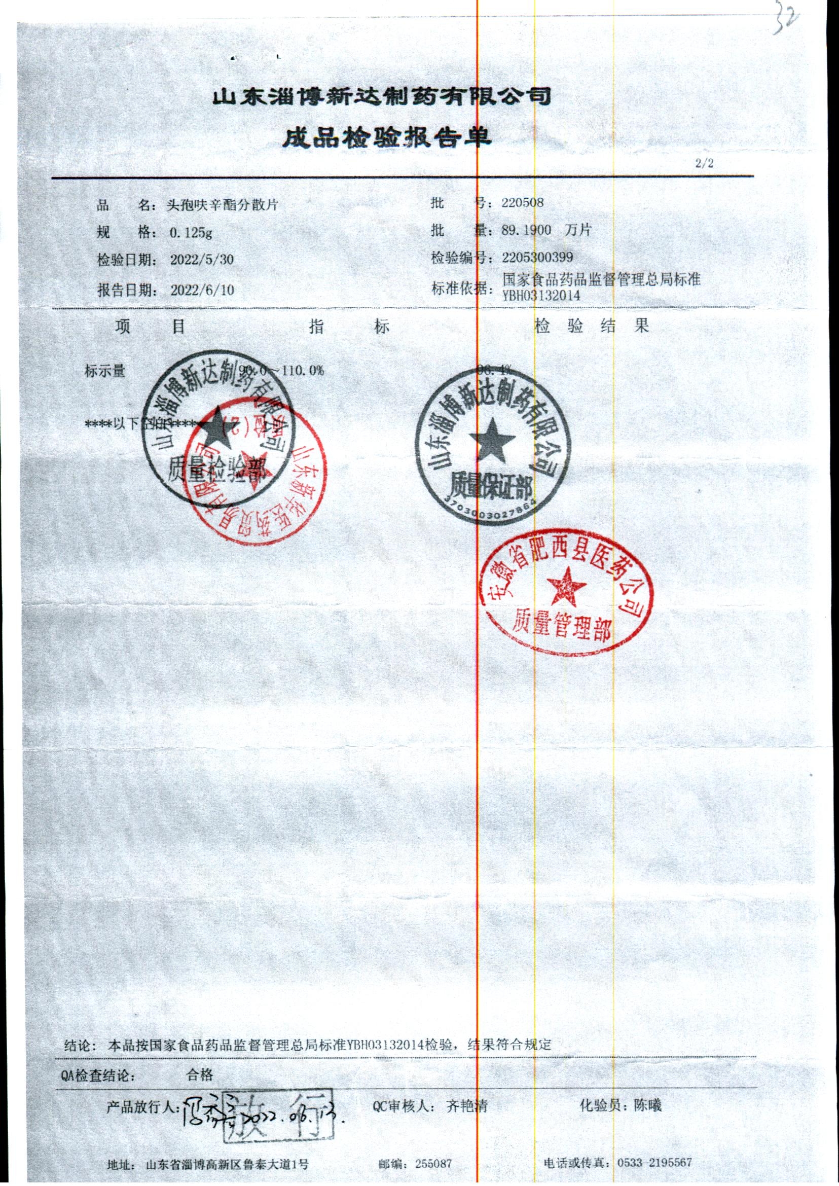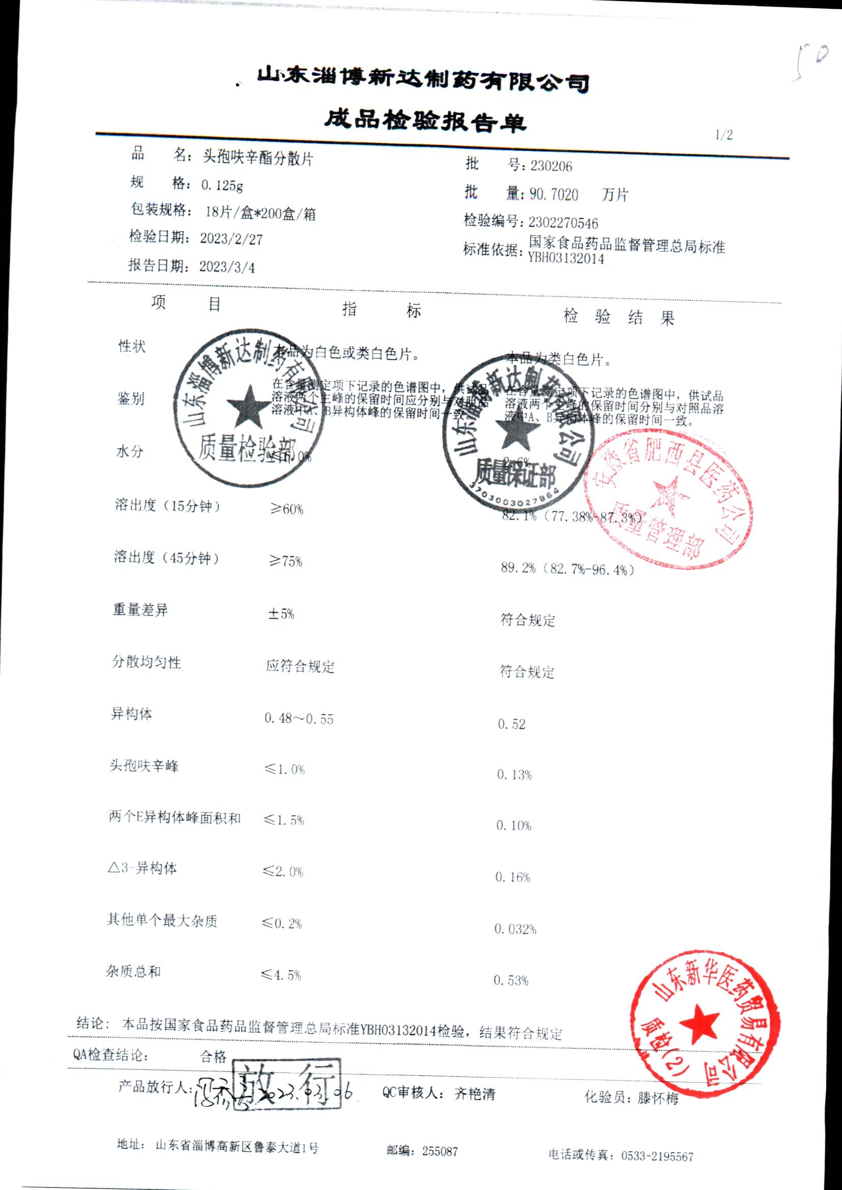 头孢呋辛酯分散片 | 0.125g | 230206/2 | 查看详情 |