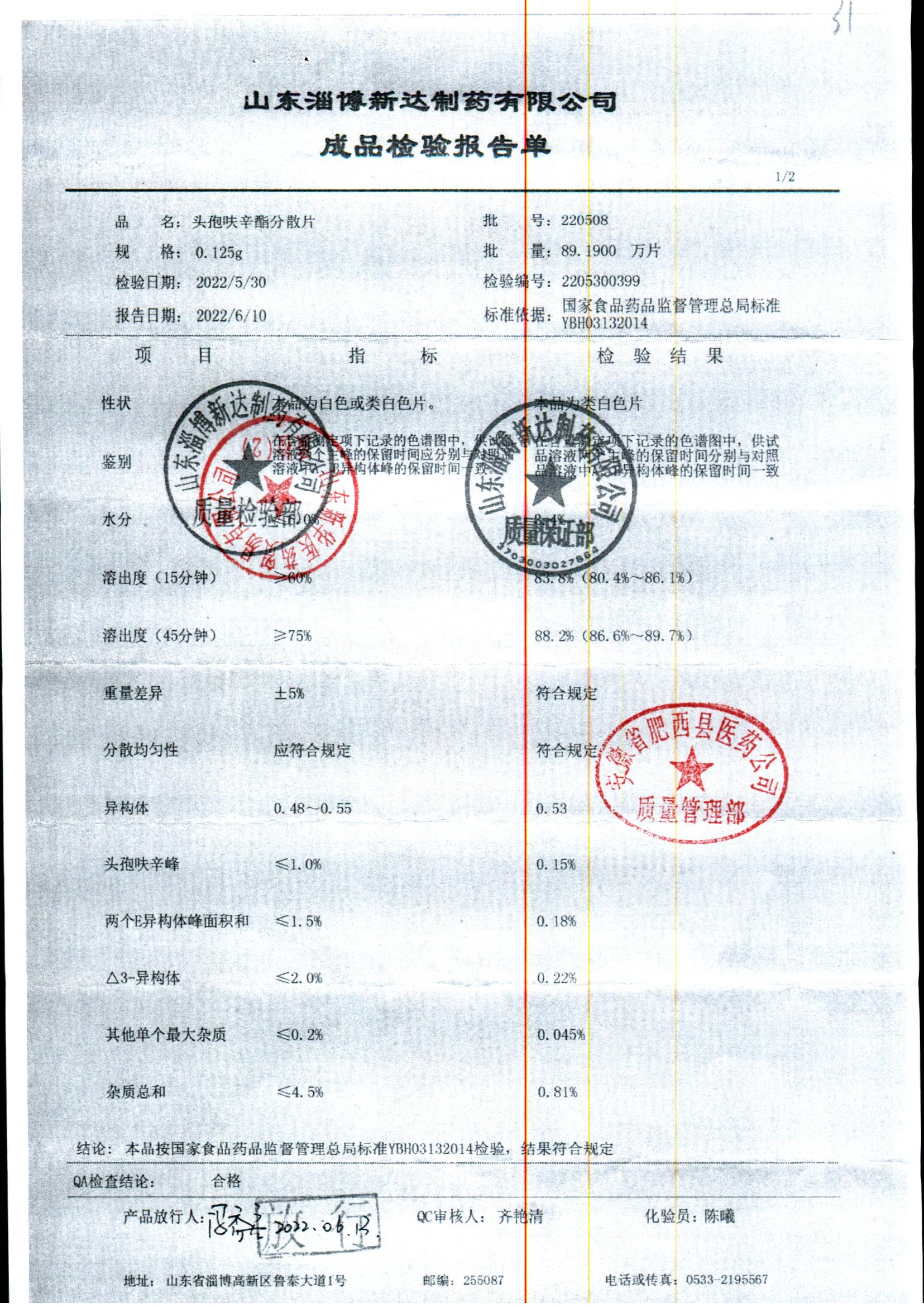 头孢呋辛酯分散片 | 0.125g | 220508/2 | 查看详情 |