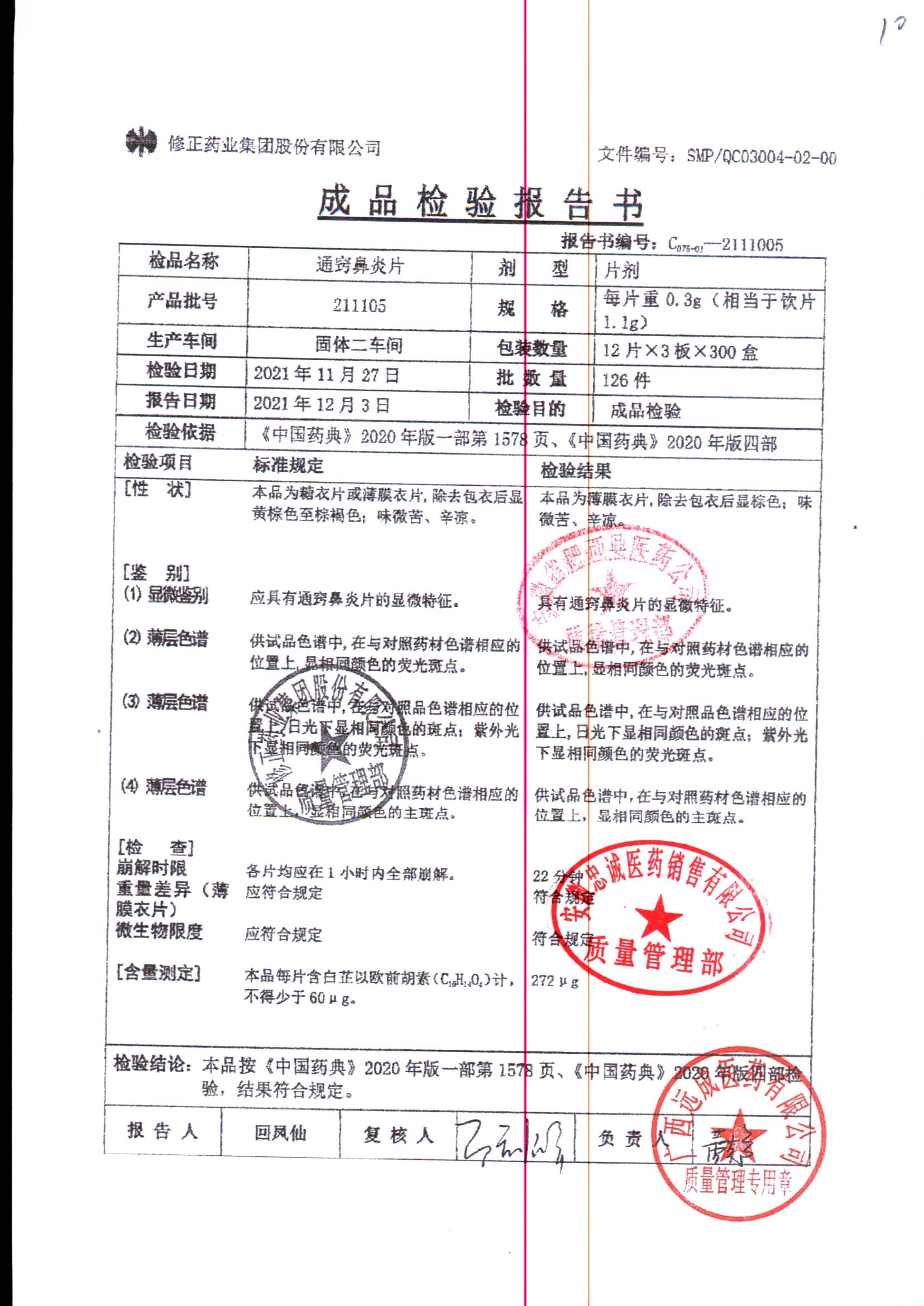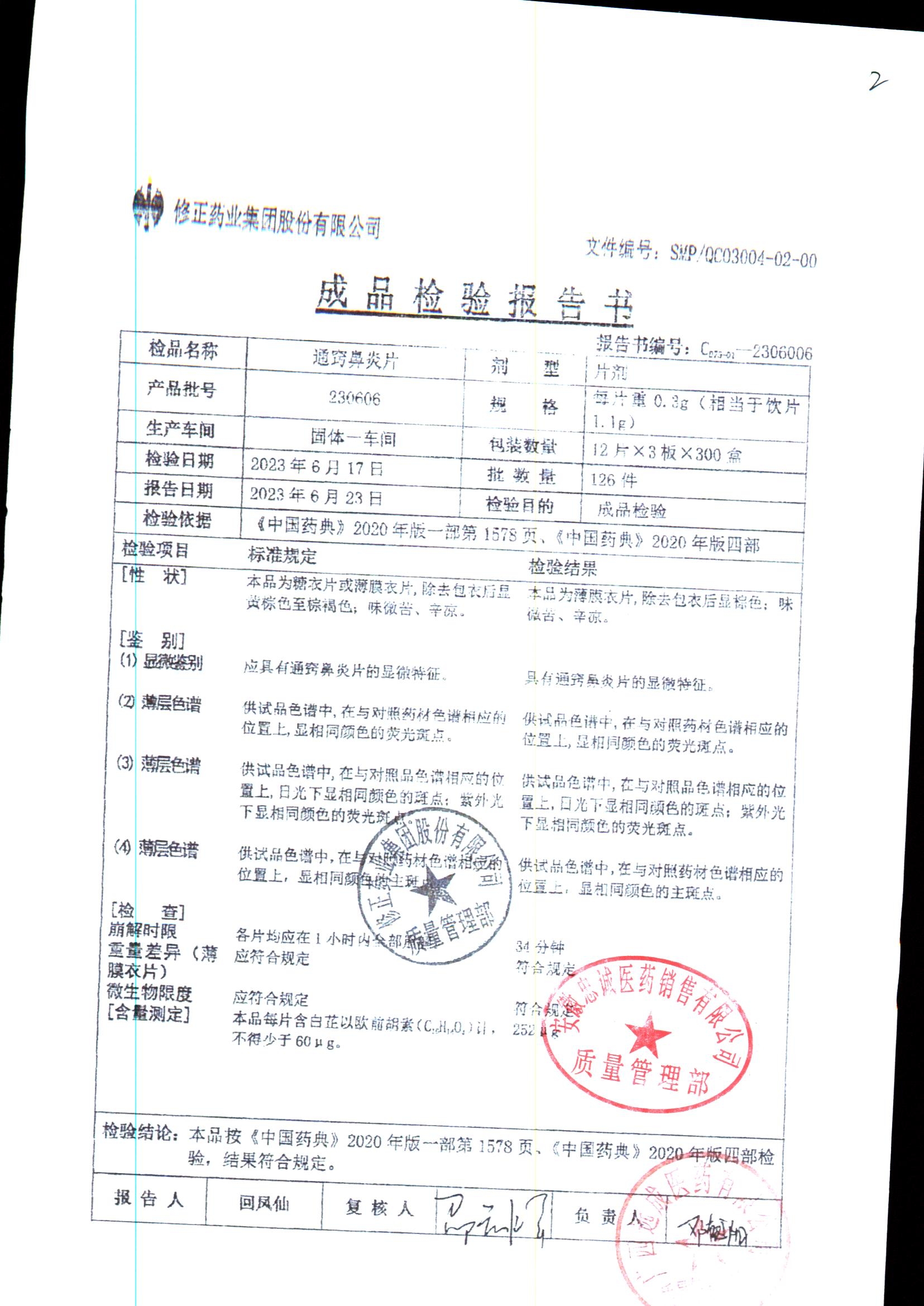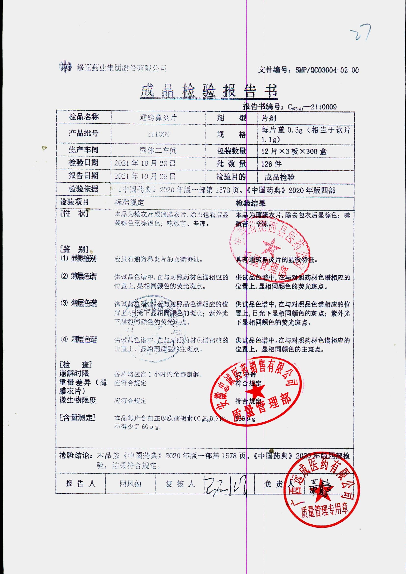 通窍鼻炎片 | 0.3g*12片*3板 | 211105 | 查看详情 |