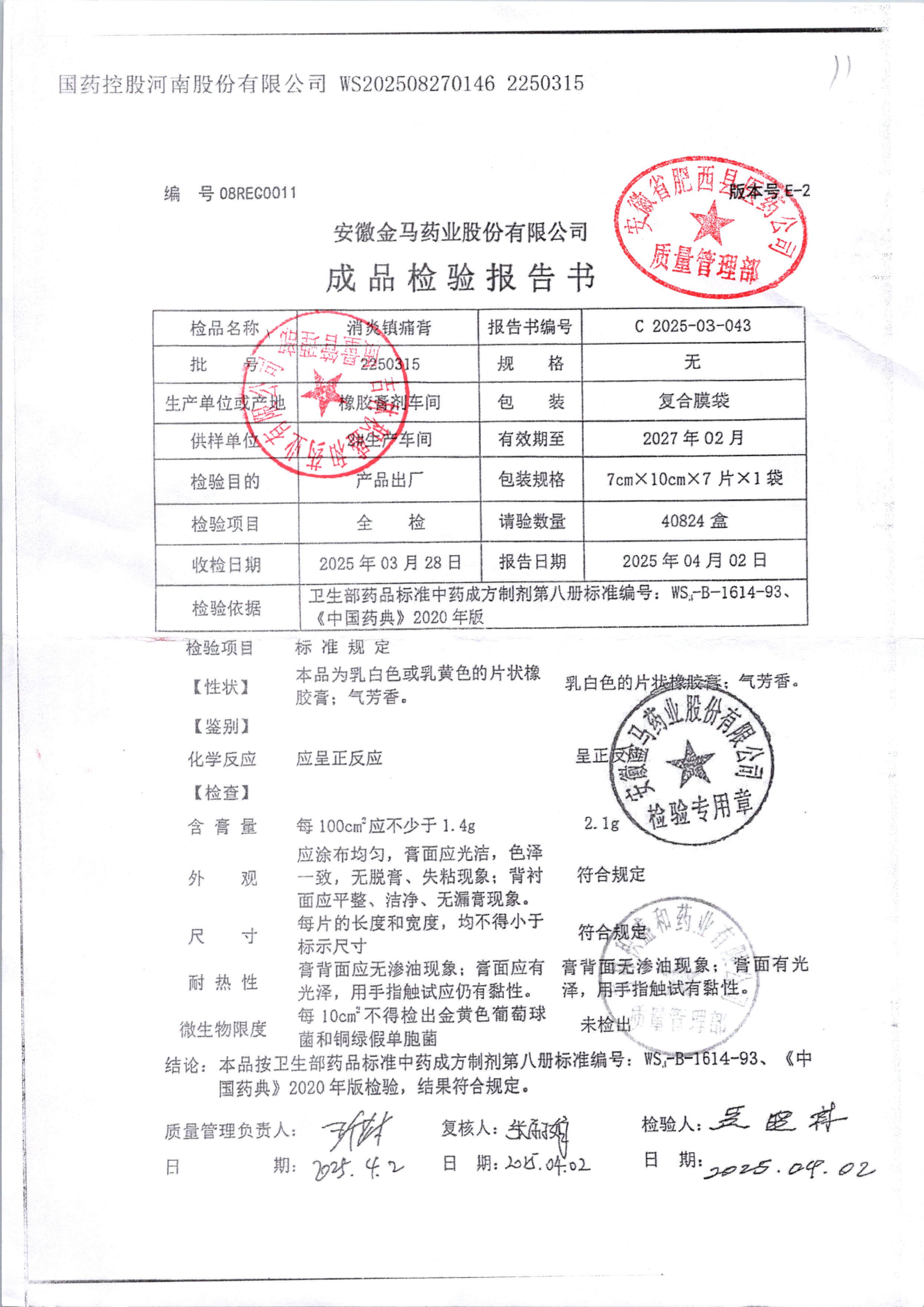 | 消炎镇痛膏 | 7cmx10cmx7片 | 20210902 | 查看详情 |