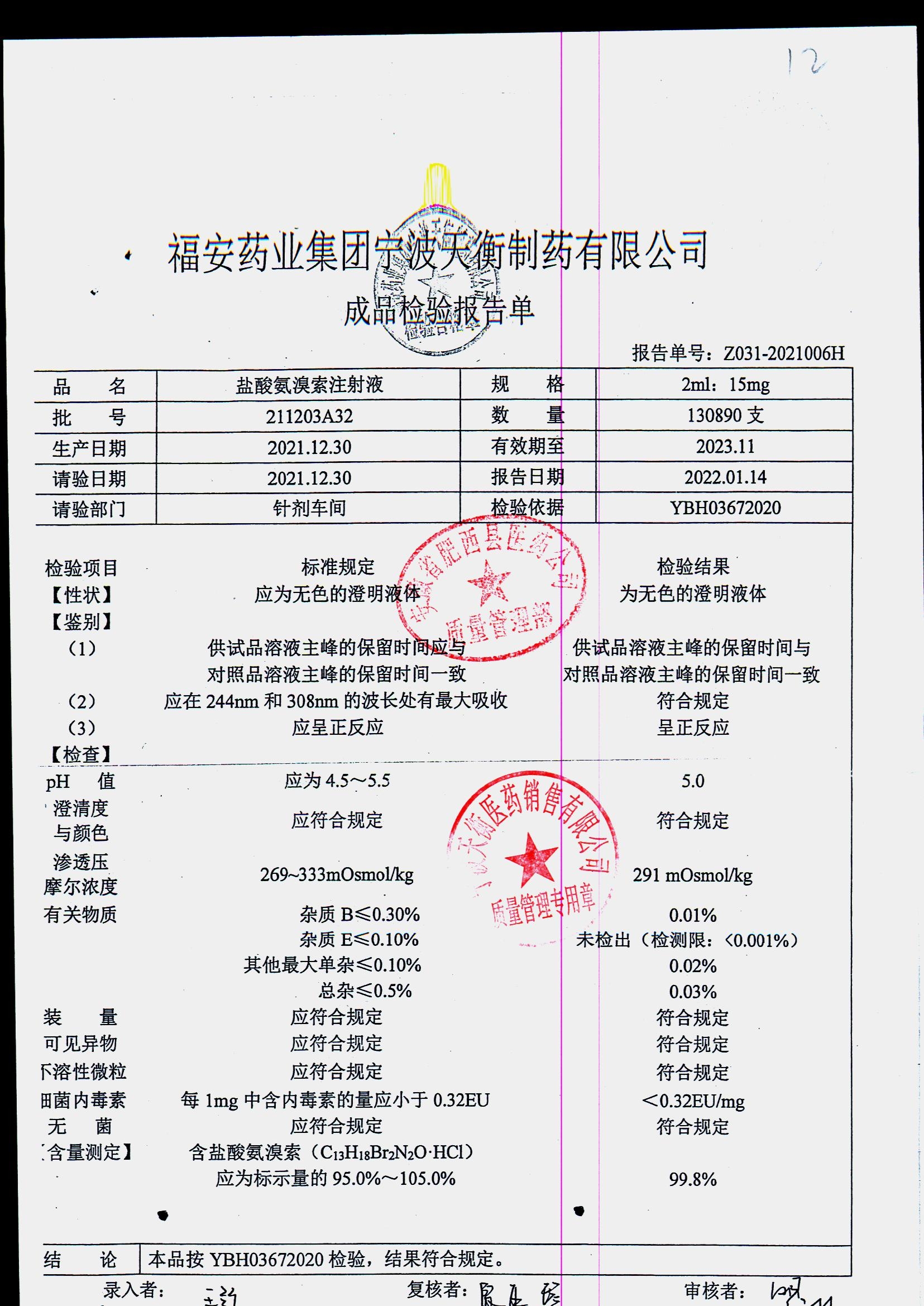 盐酸氨溴索注射液 | 2ml:15mg | 221202A32 | 查看详情 |