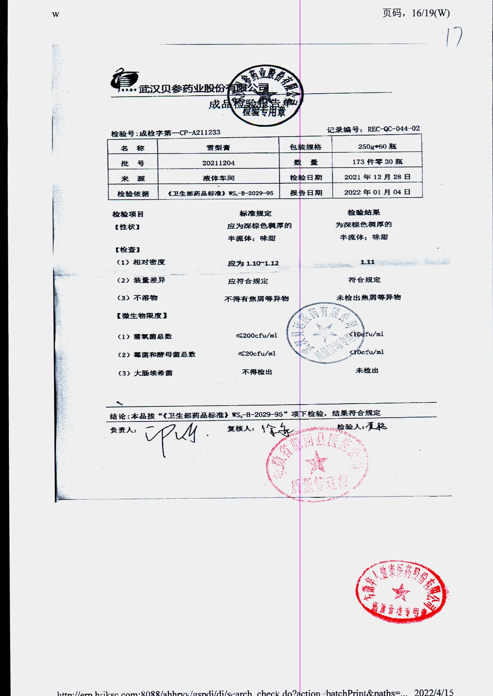 雪梨膏 | 250g *60瓶 | 20211204 | 查看详情 |
