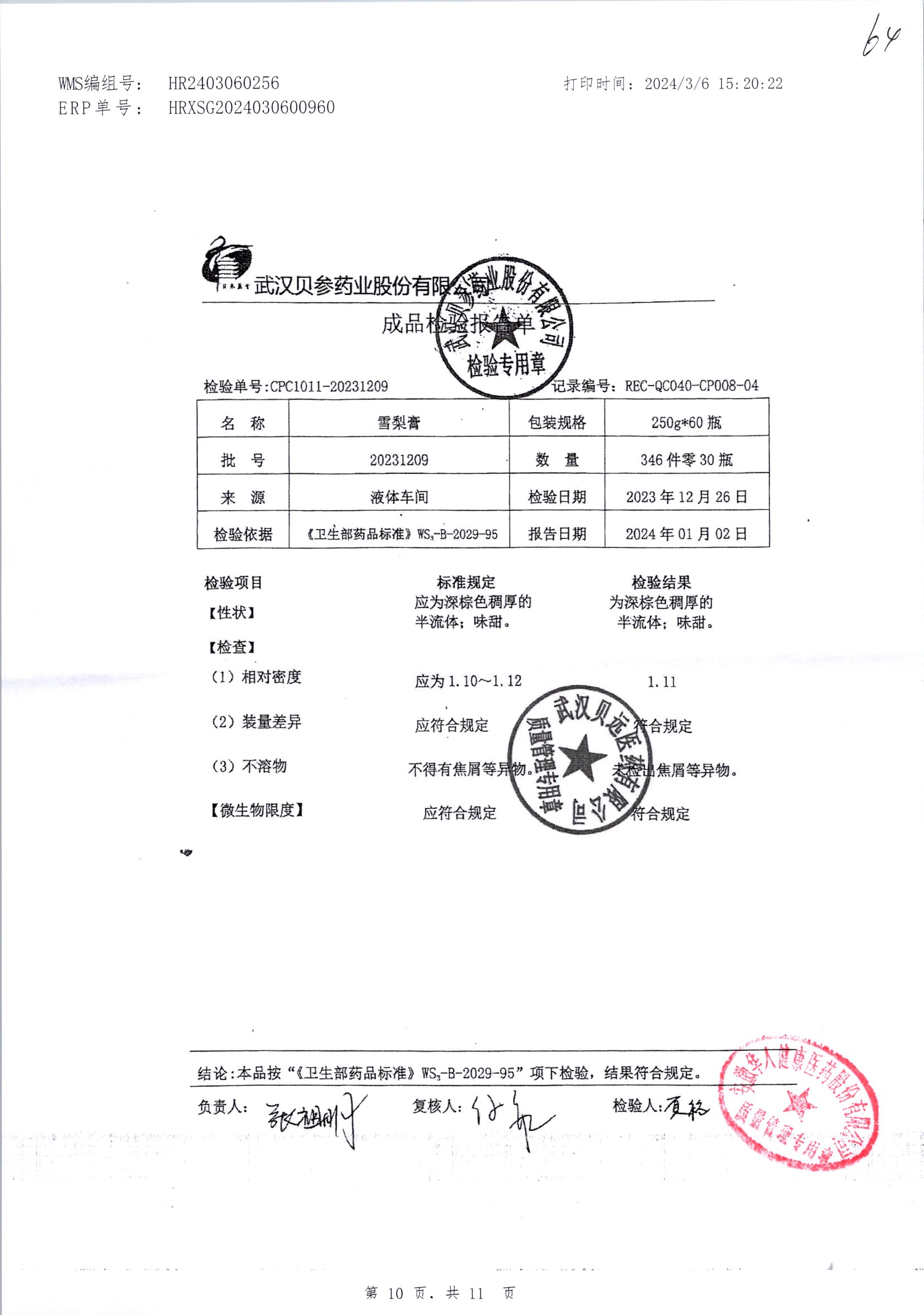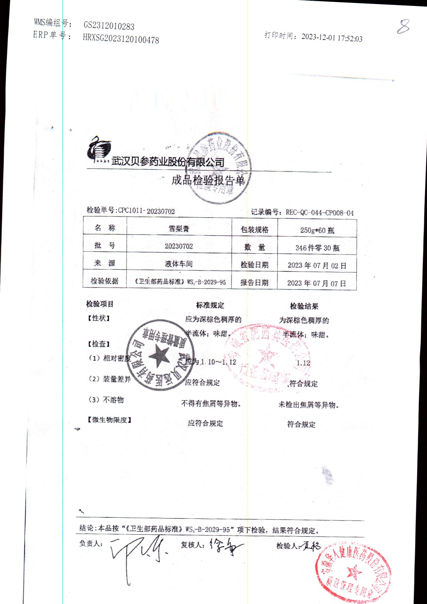 雪梨膏 | 250g *60瓶 | 20231207 | 查看详情 |