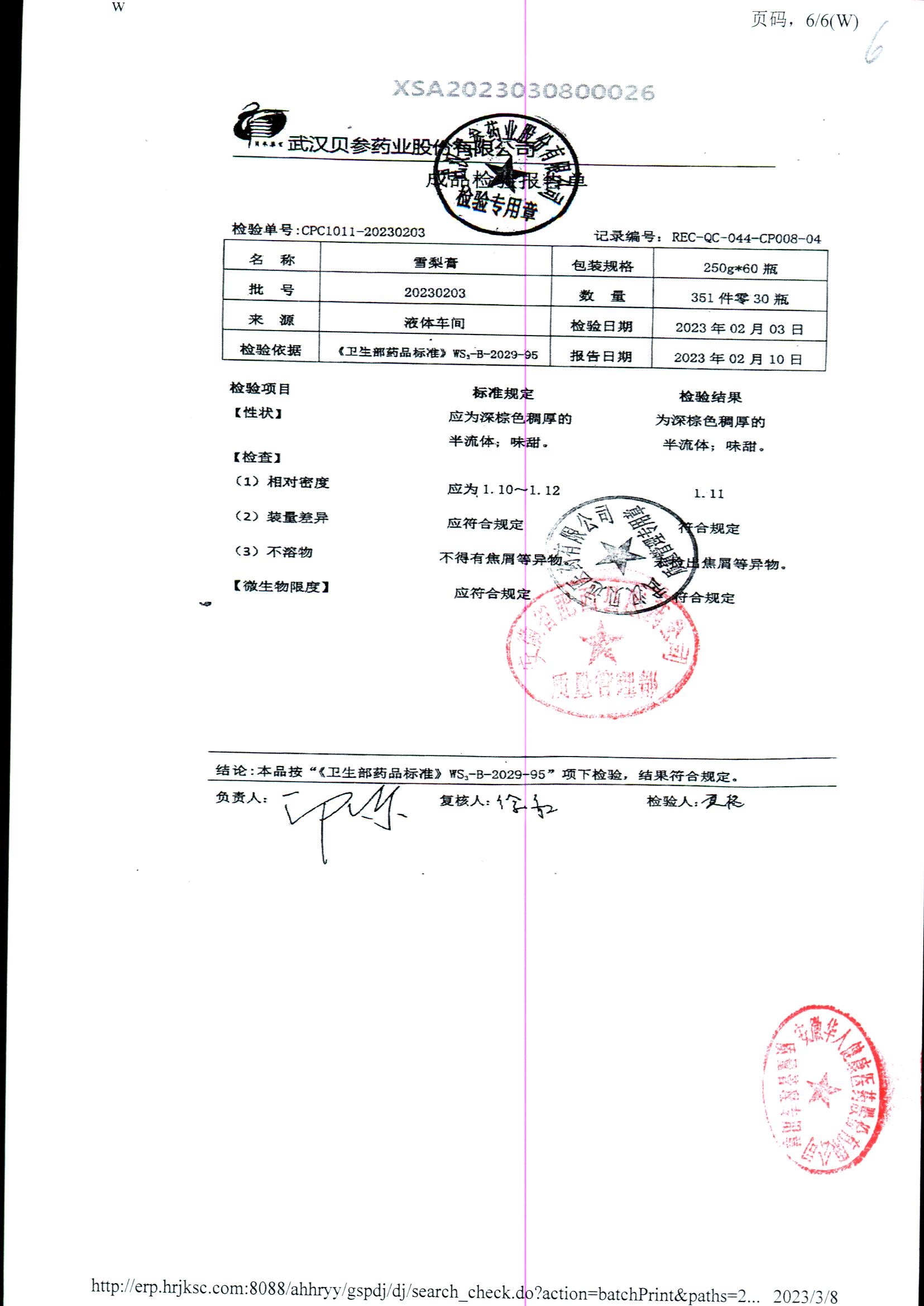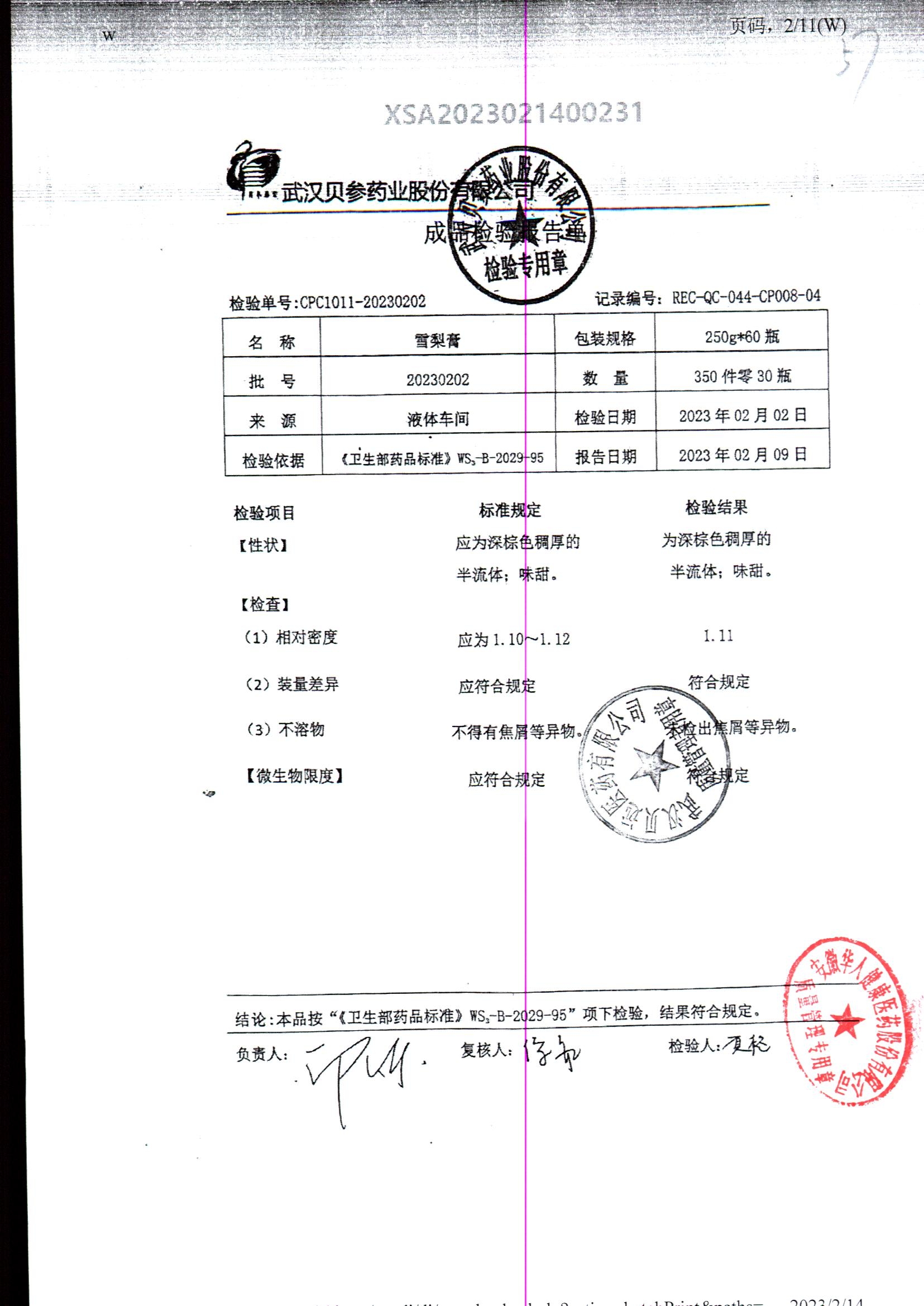 雪梨膏 | 250g *60瓶 | 20230202 | 查看详情 |