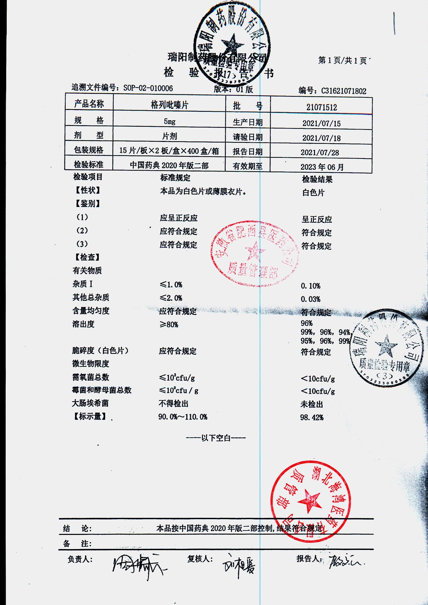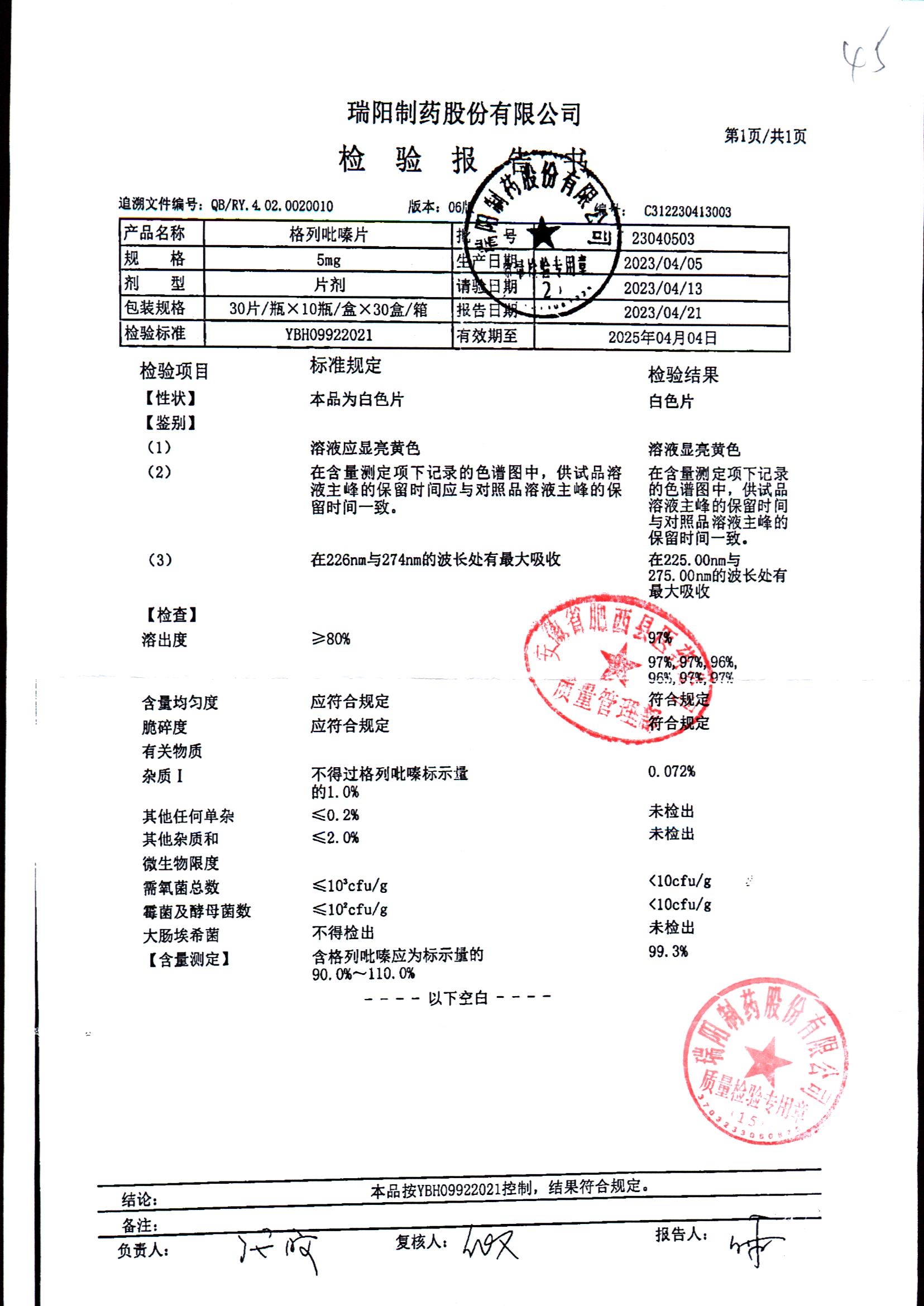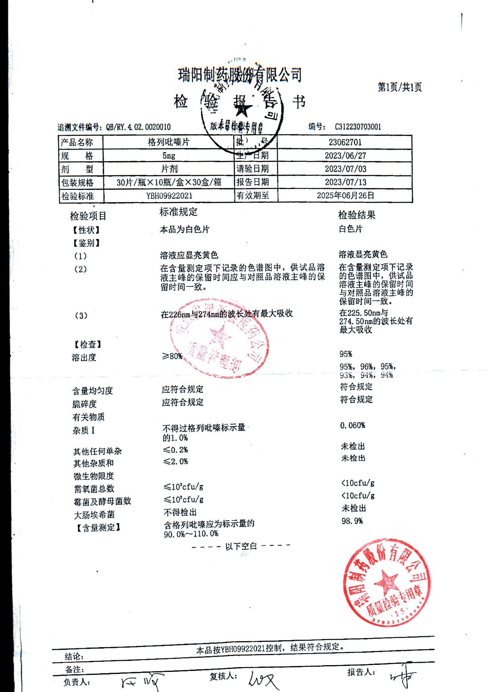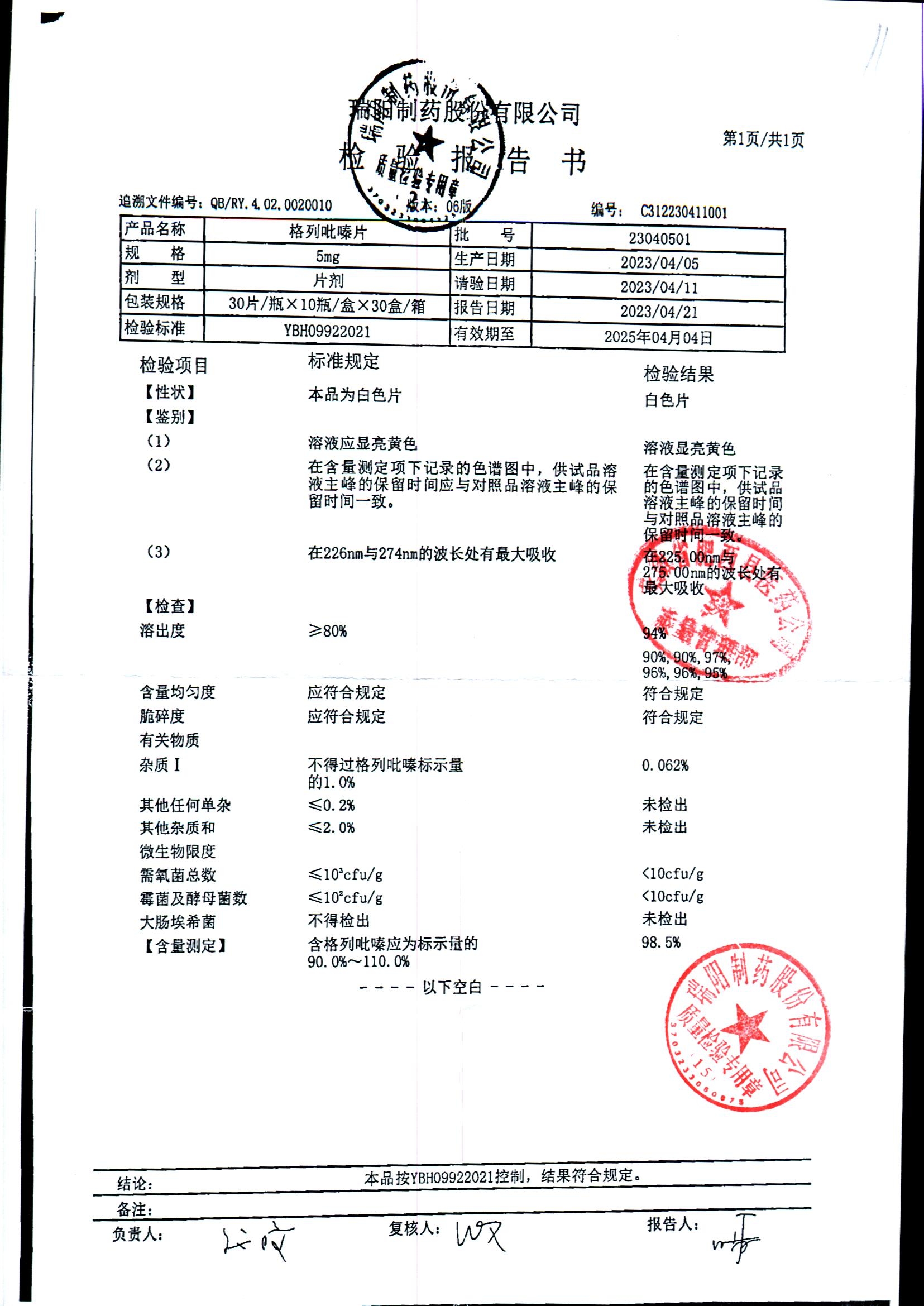 格列吡嗪片 | 5mg | 23040501 | 查看详情 |