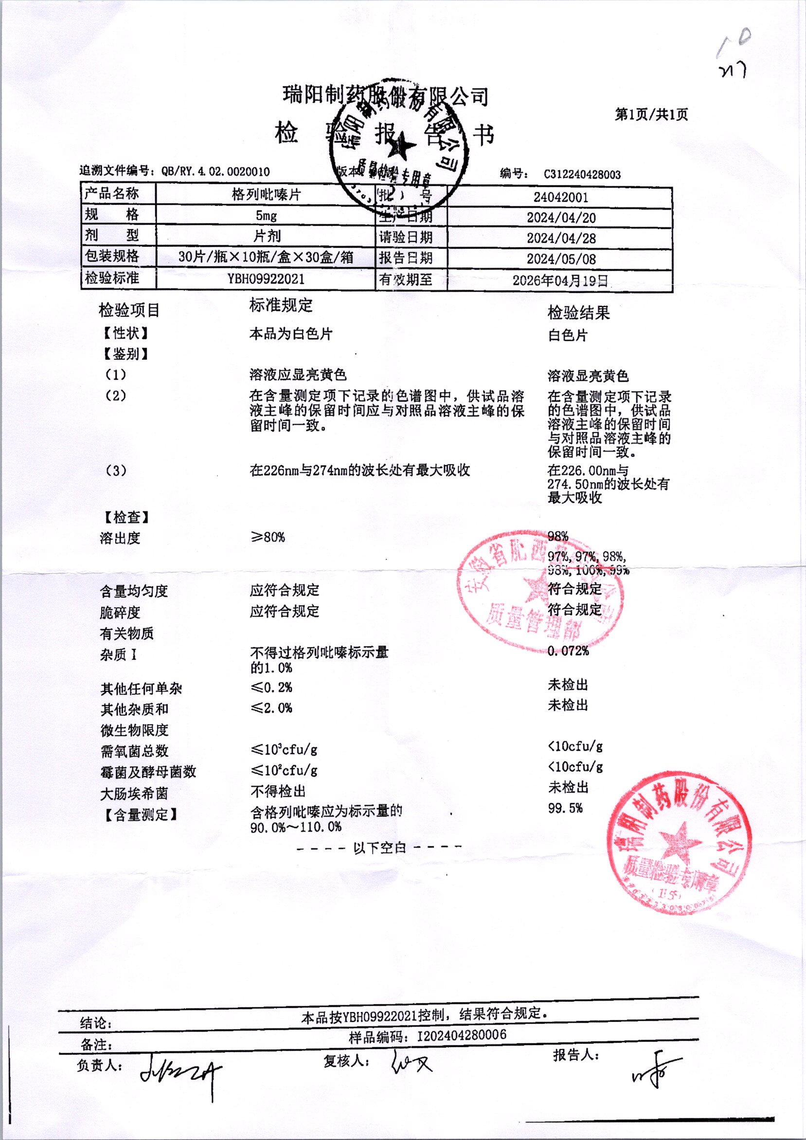 格列吡嗪片 | 5mg | 24042001 | 查看详情 |