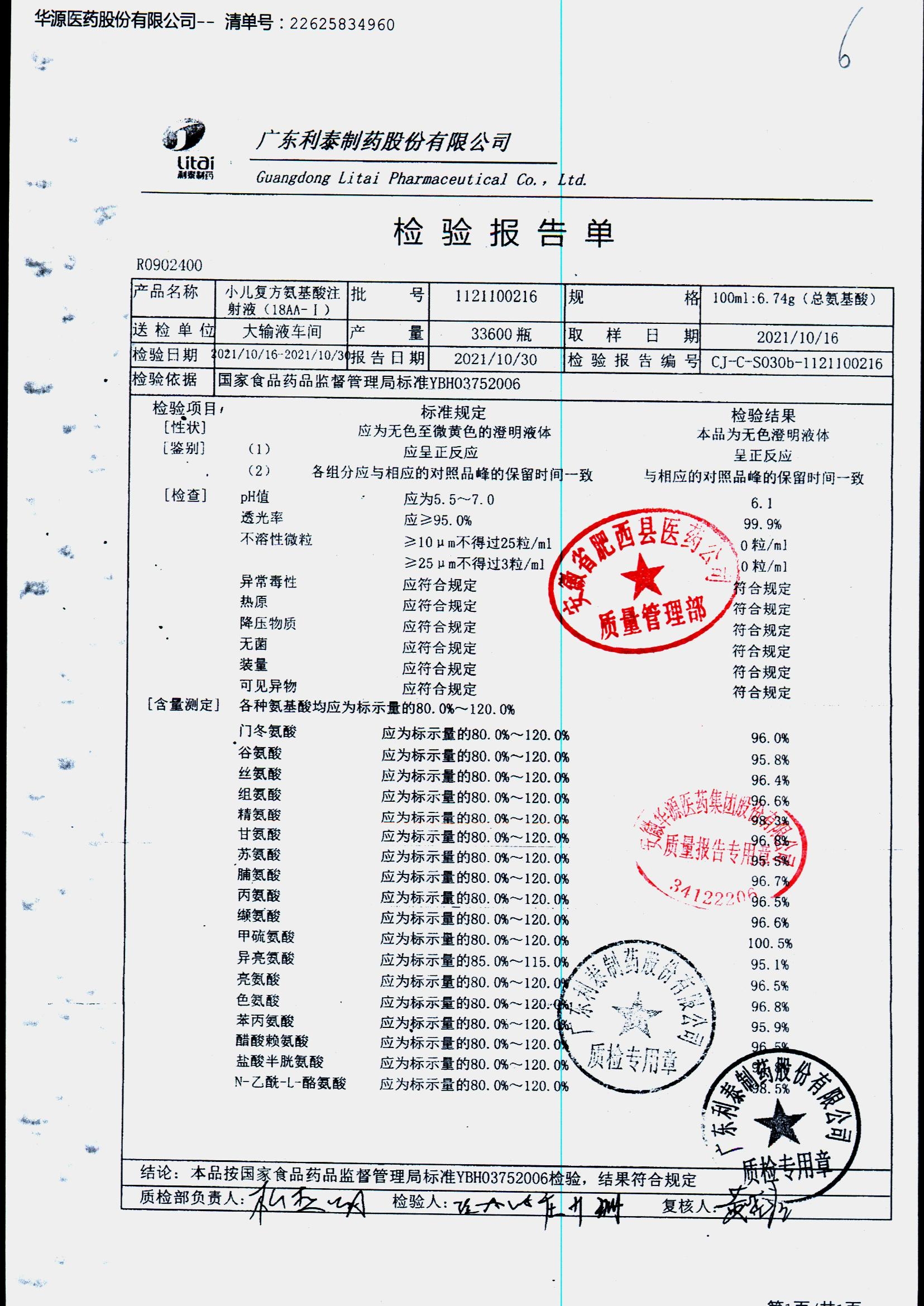 小儿复方氨基酸注射液(18AA-1) | 100ml:6.74g | 1121100216 | 查看详情 |