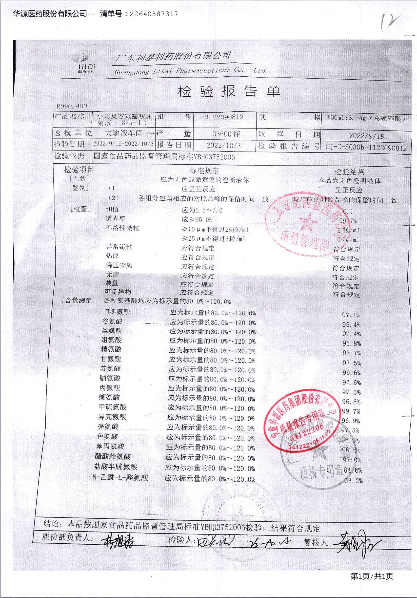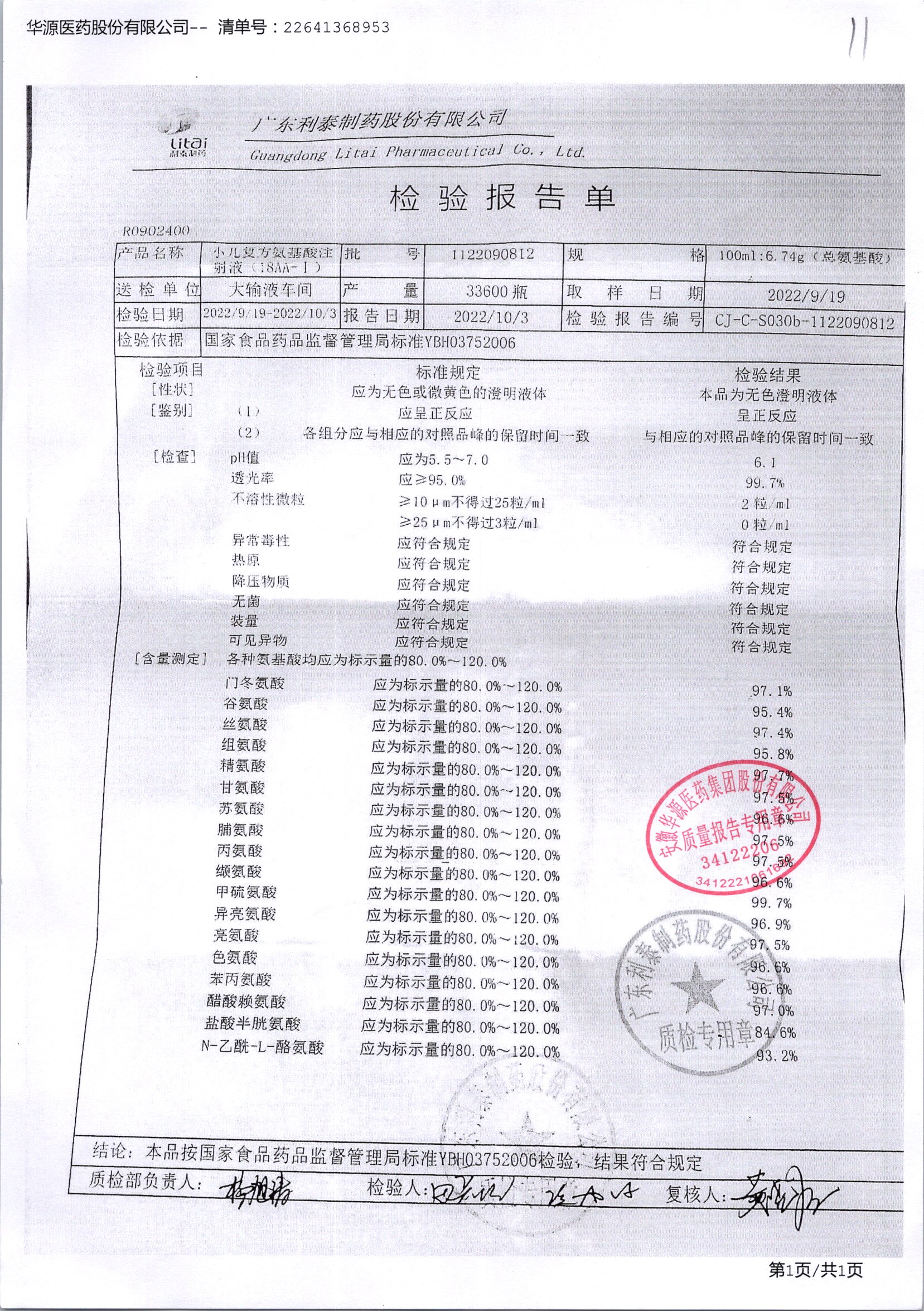 小儿复方氨基酸注射液(18AA-1) | 100ml:6.74g | 1122090812 | 查看详情 |