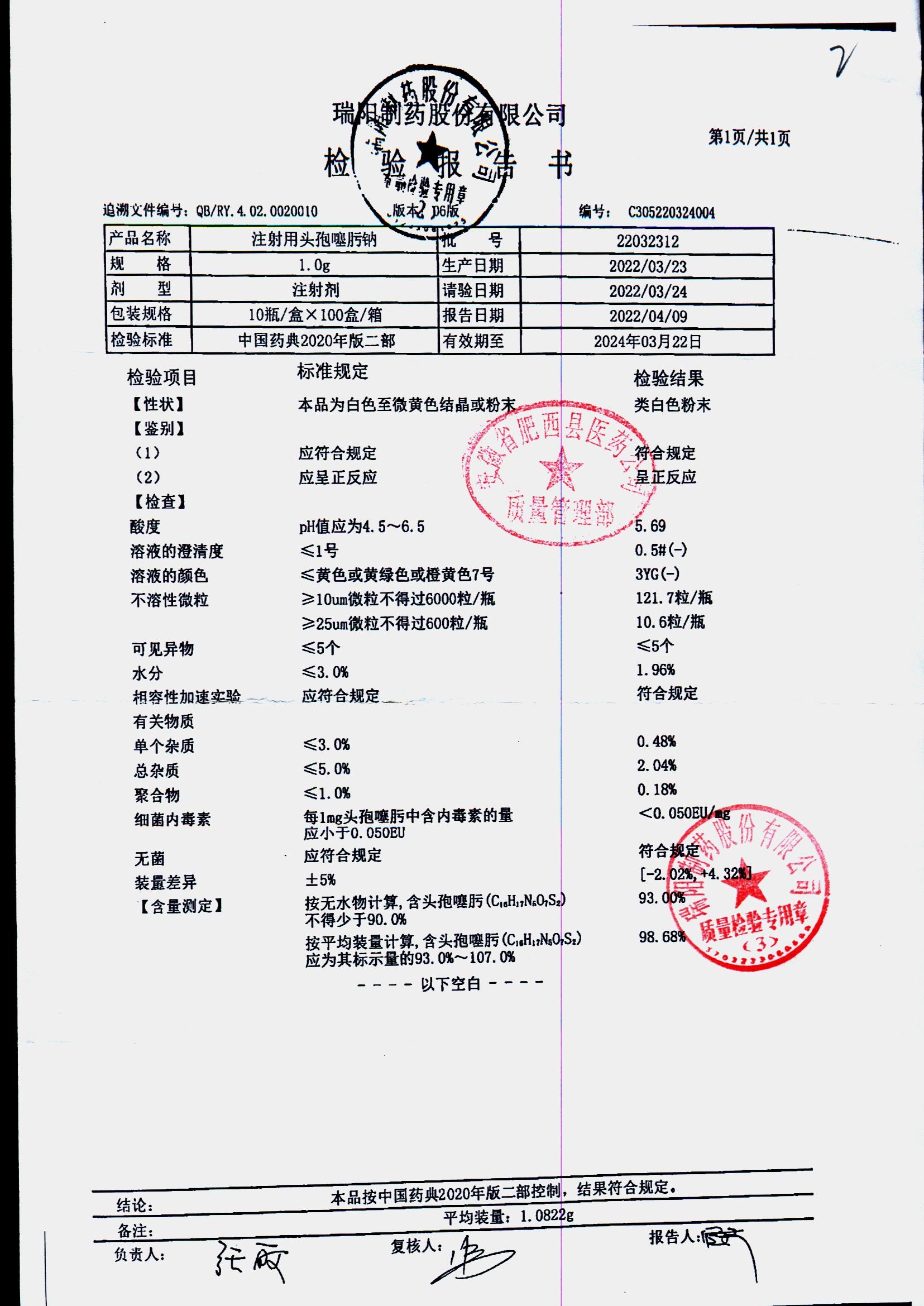 注射用头孢噻肟钠 | 1.0g*10瓶 | 22032312 | 查看详情 |