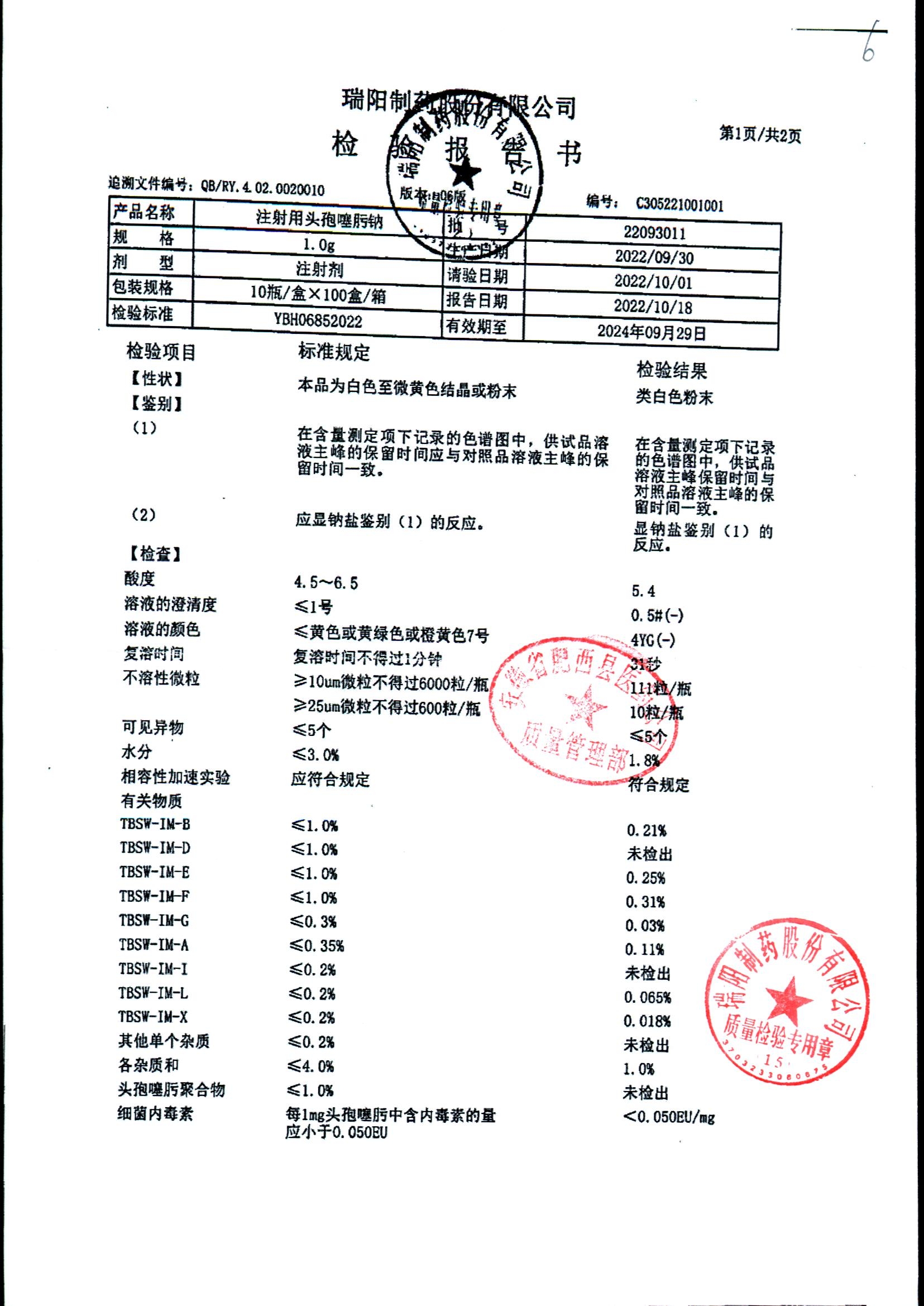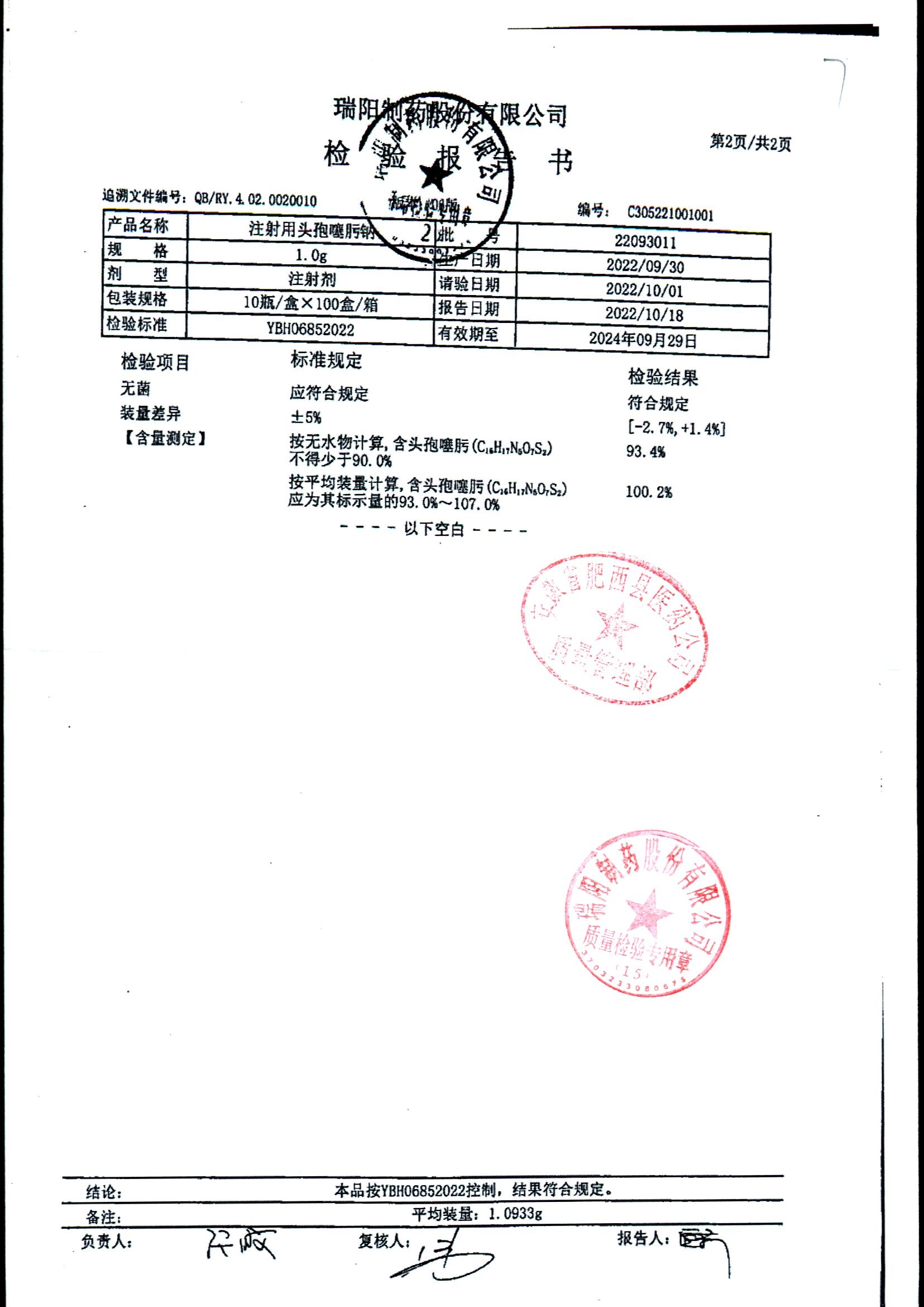 注射用头孢噻肟钠 | 1.0g*10瓶 | 22093011/2 | 查看详情 |