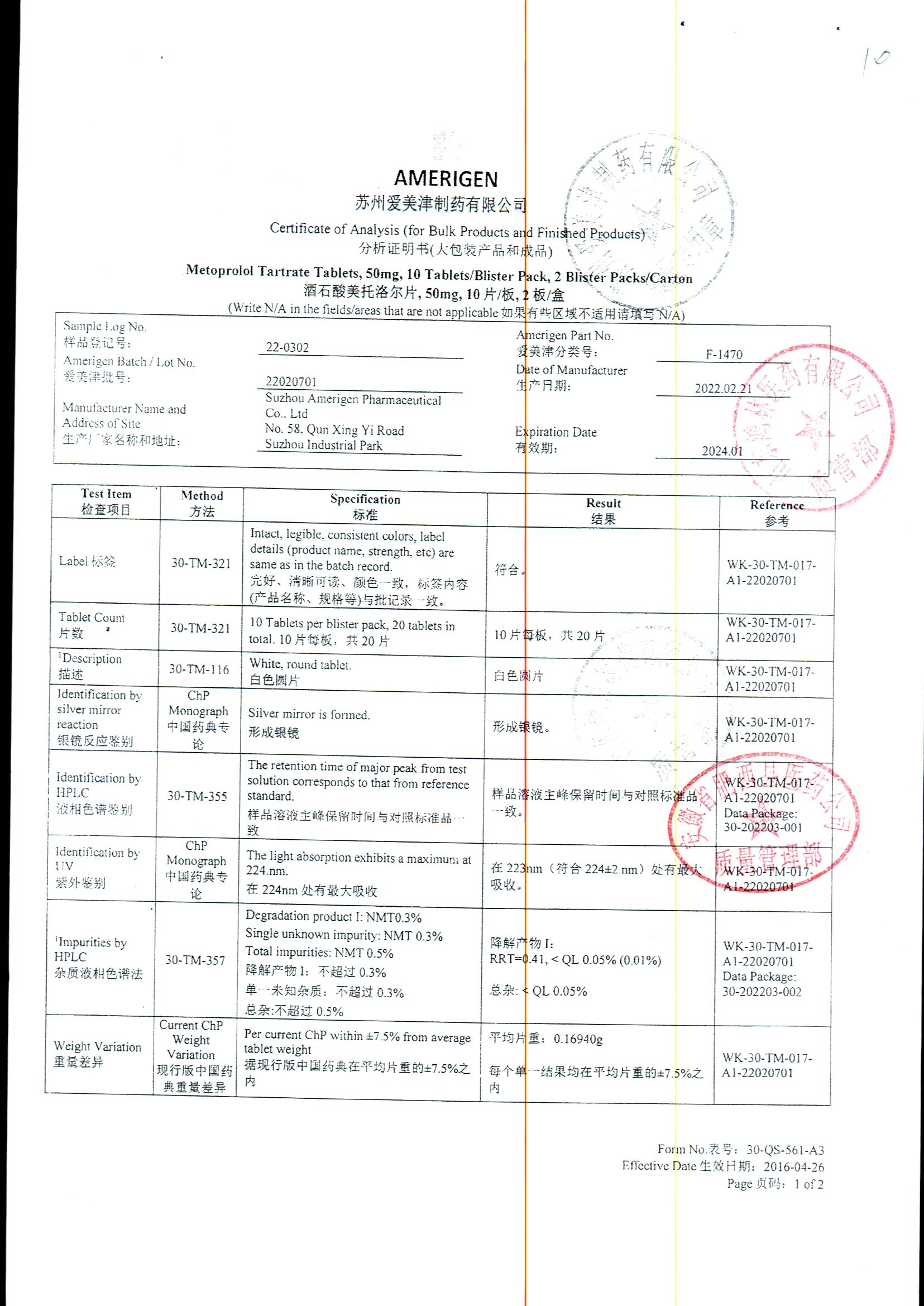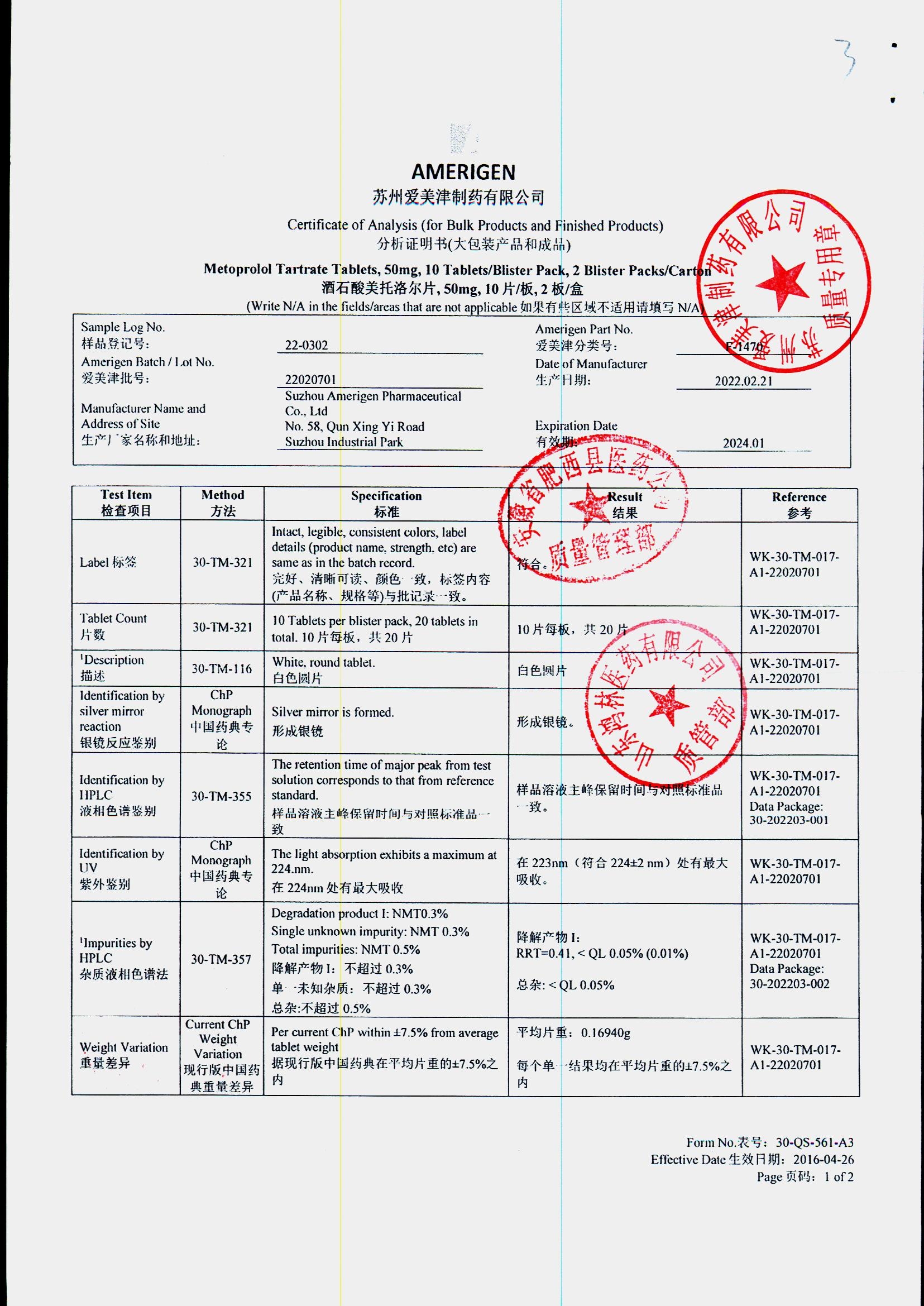 酒石酸美托洛尔片 | 50mg*20s | 22020701/1 | 查看详情 |