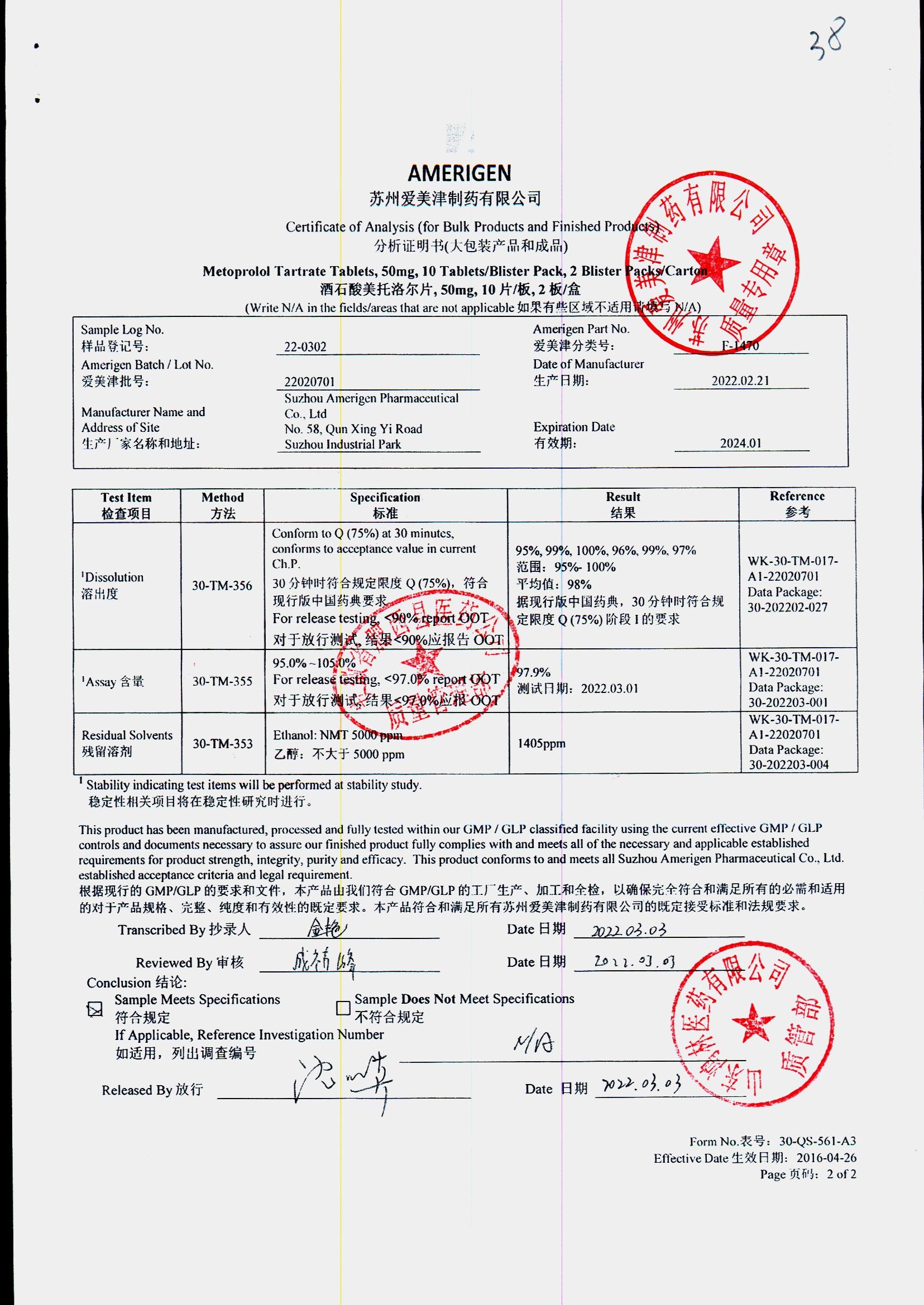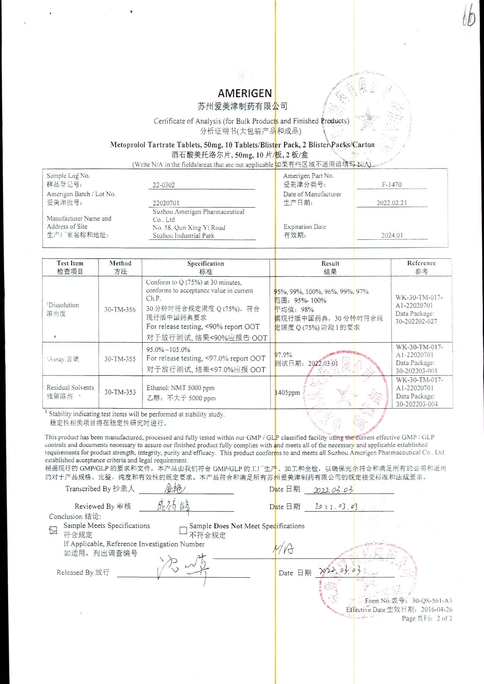 酒石酸美托洛尔片 | 50mg*20s | 22020701/2 | 查看详情 |