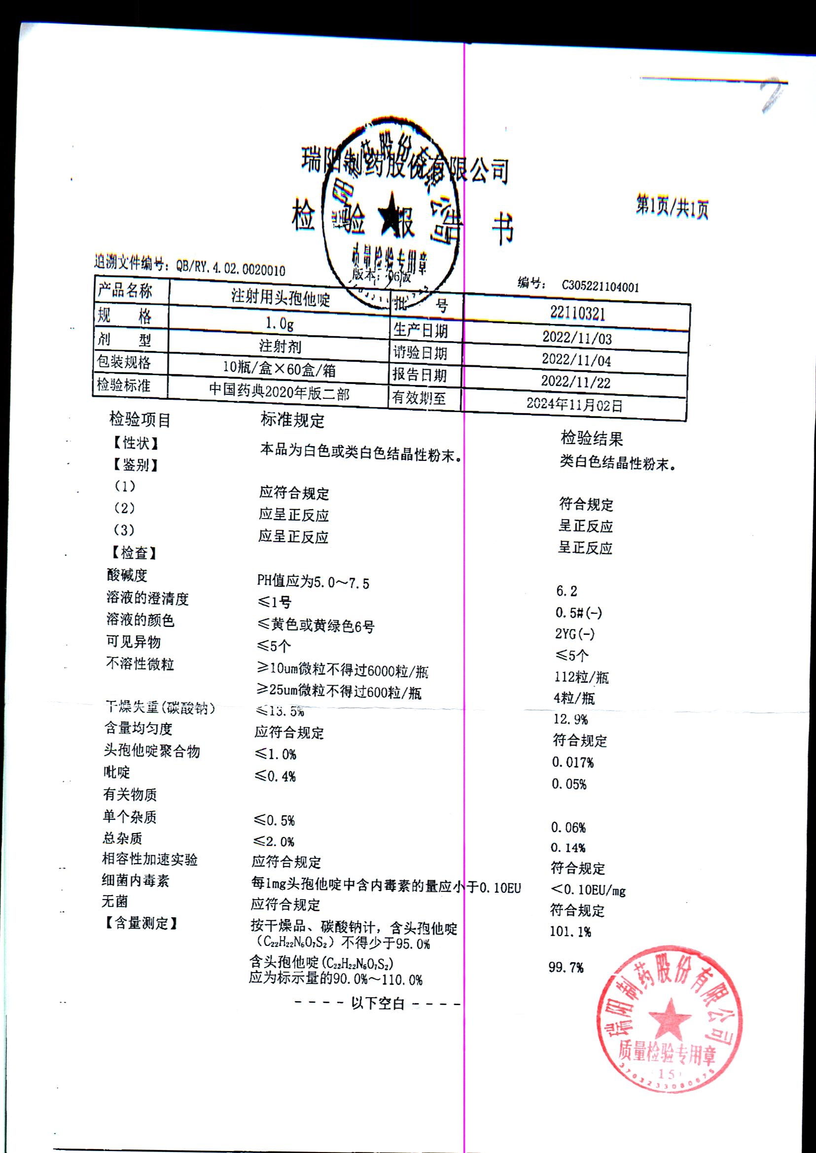 注射用头孢他啶 | 1.0g*10瓶 | 22110321 | 查看详情 |