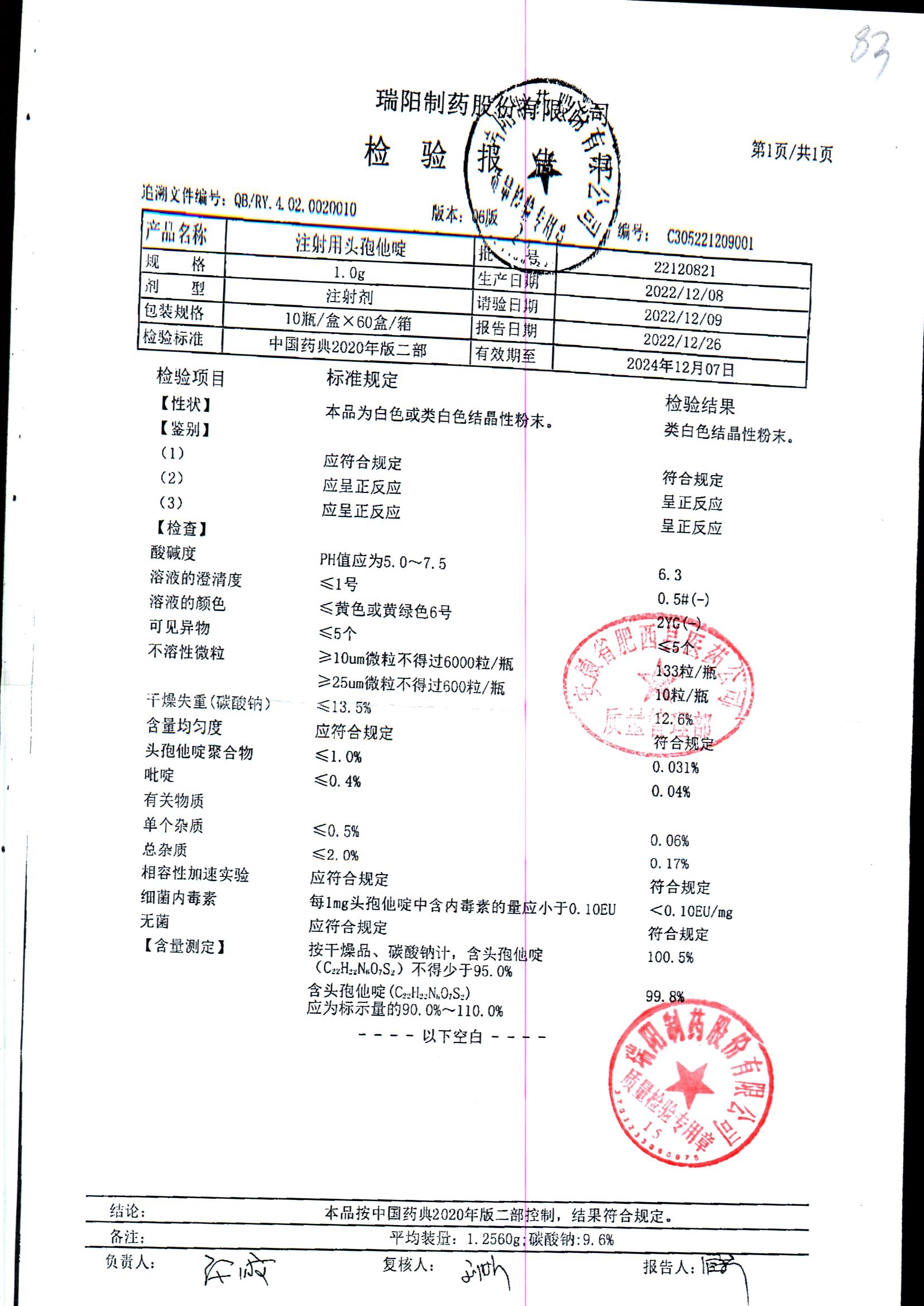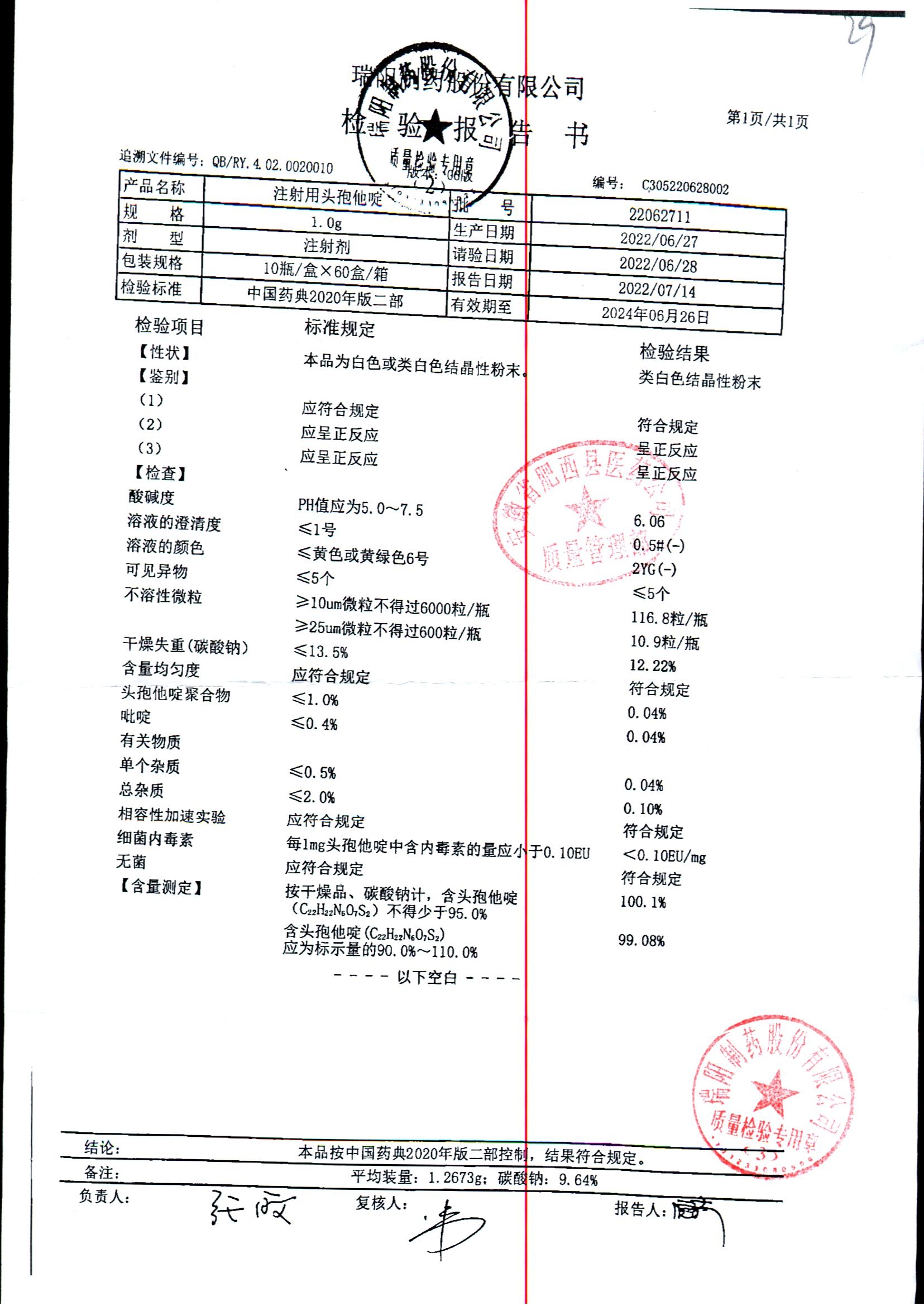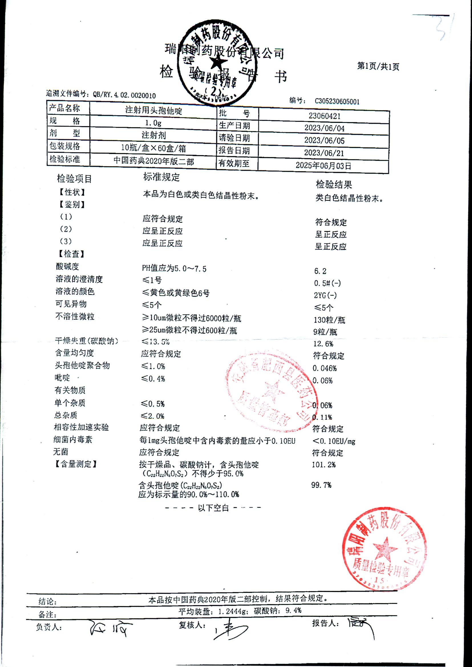 注射用头孢他啶 | 1.0g*10瓶 | 23060621 | 查看详情 |