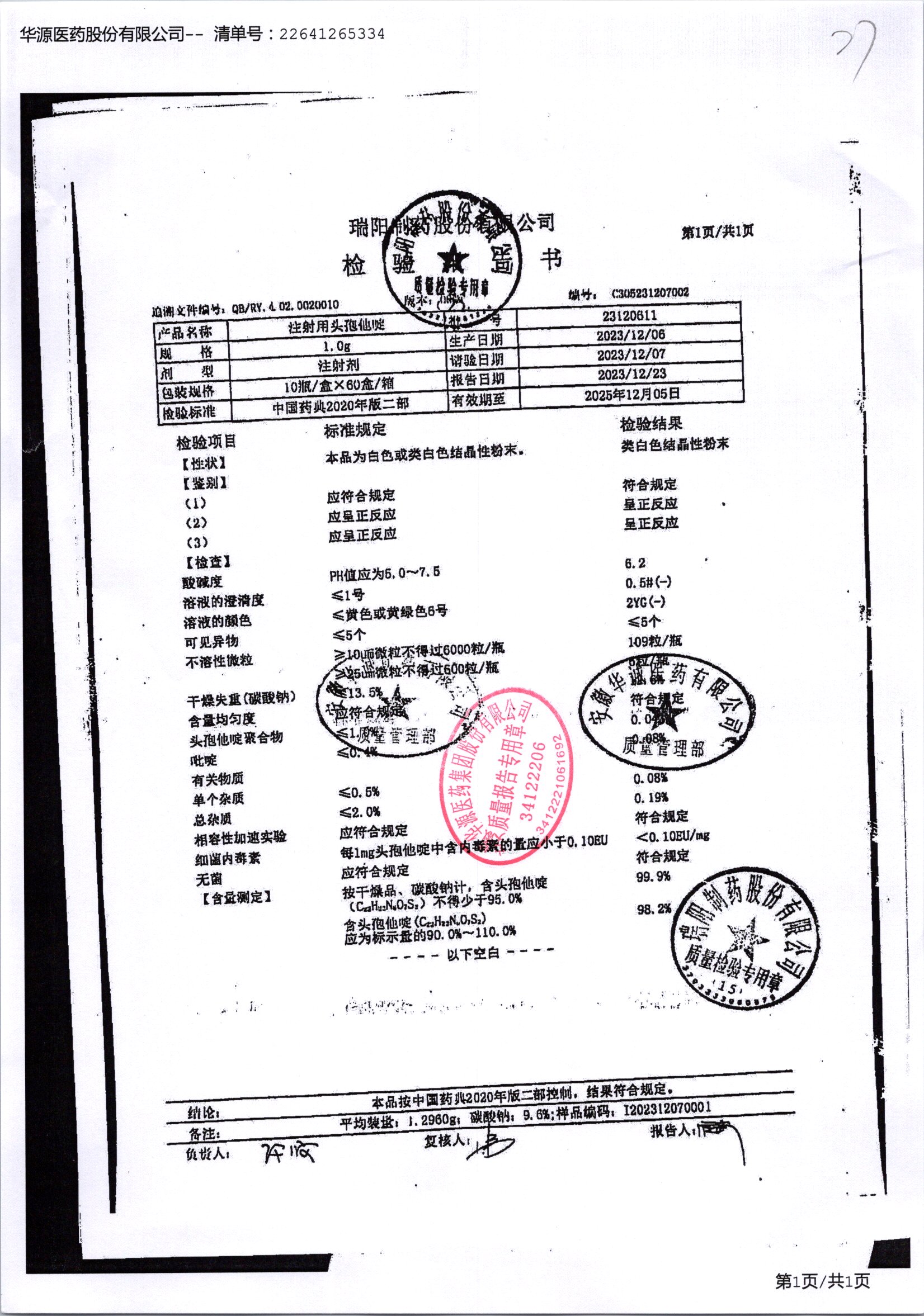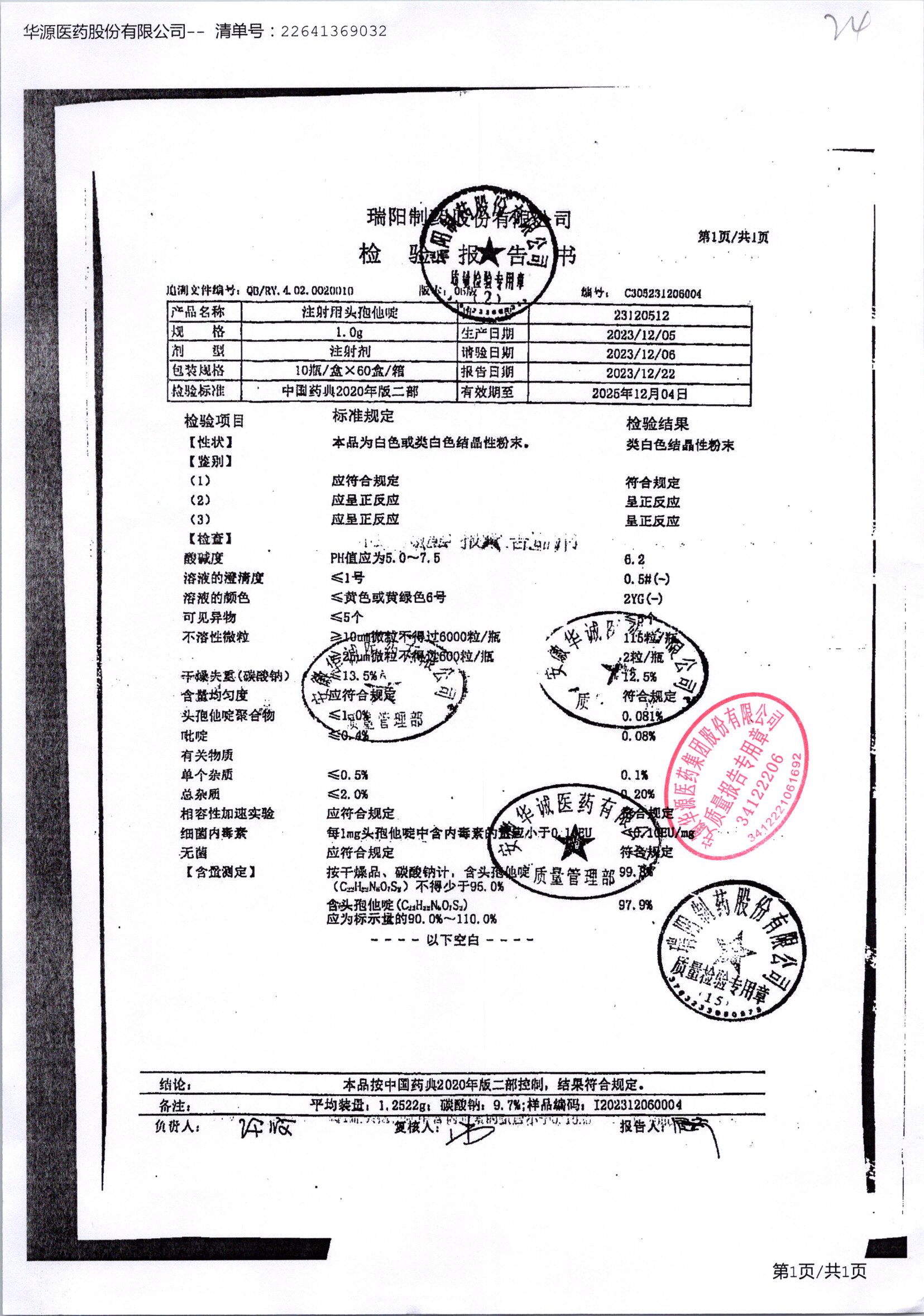 注射用头孢他啶 | 1.0g*10瓶 | 23120611 | 查看详情 |