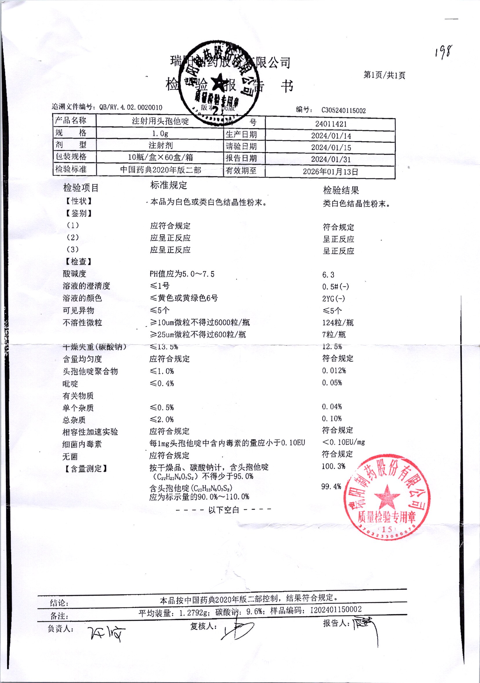 注射用头孢他啶 | 1.0g*10瓶 | 24011421 | 查看详情 |