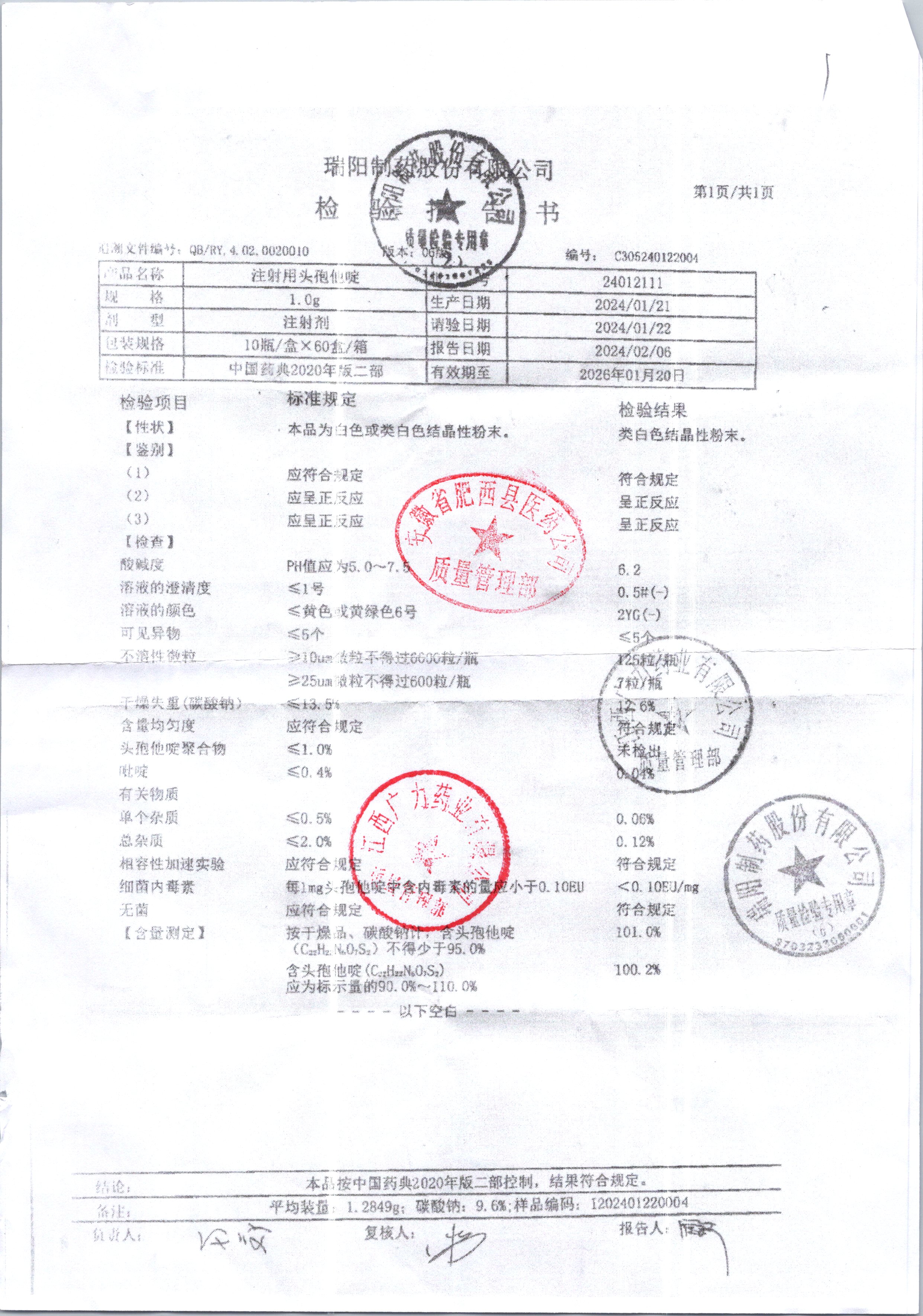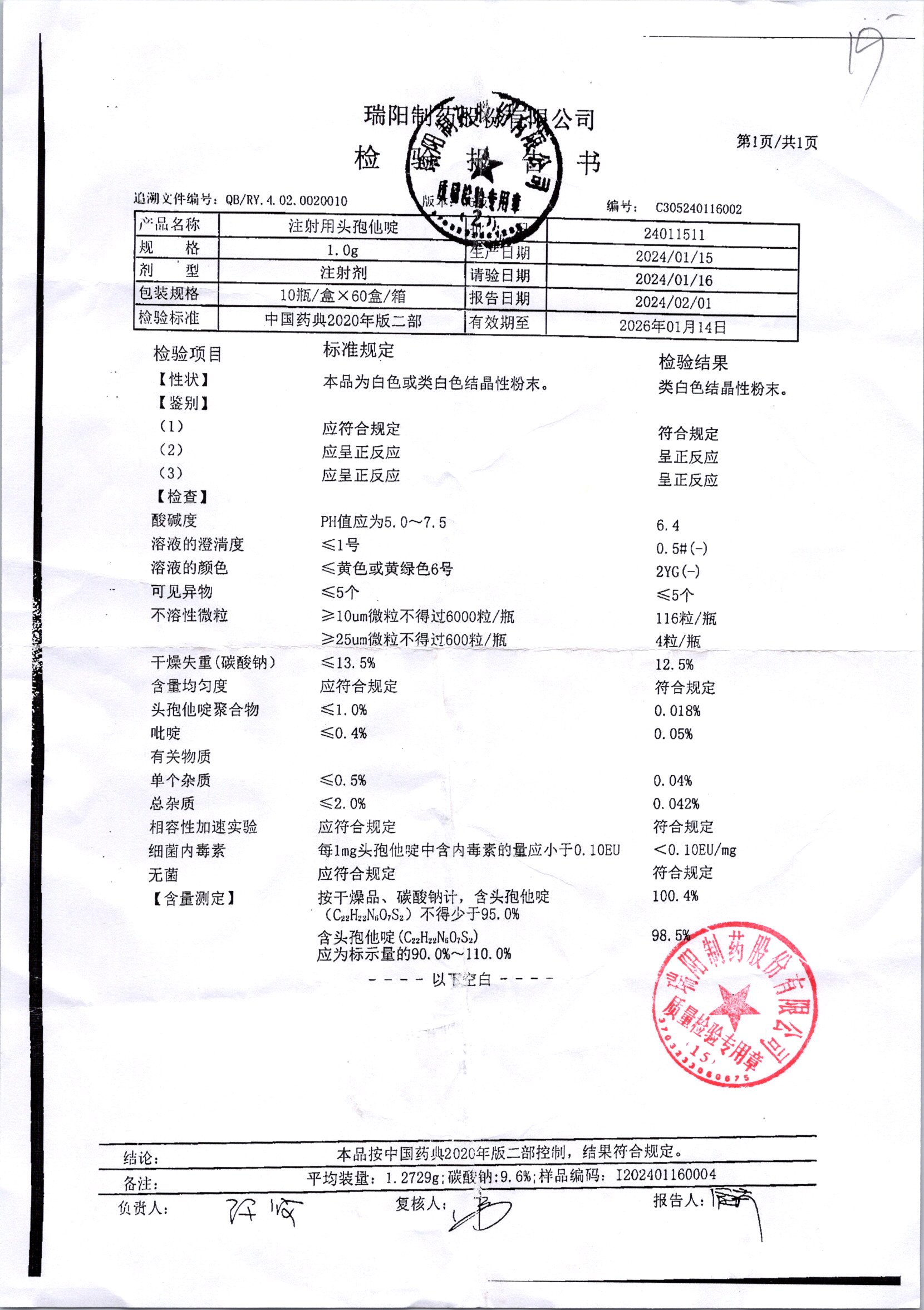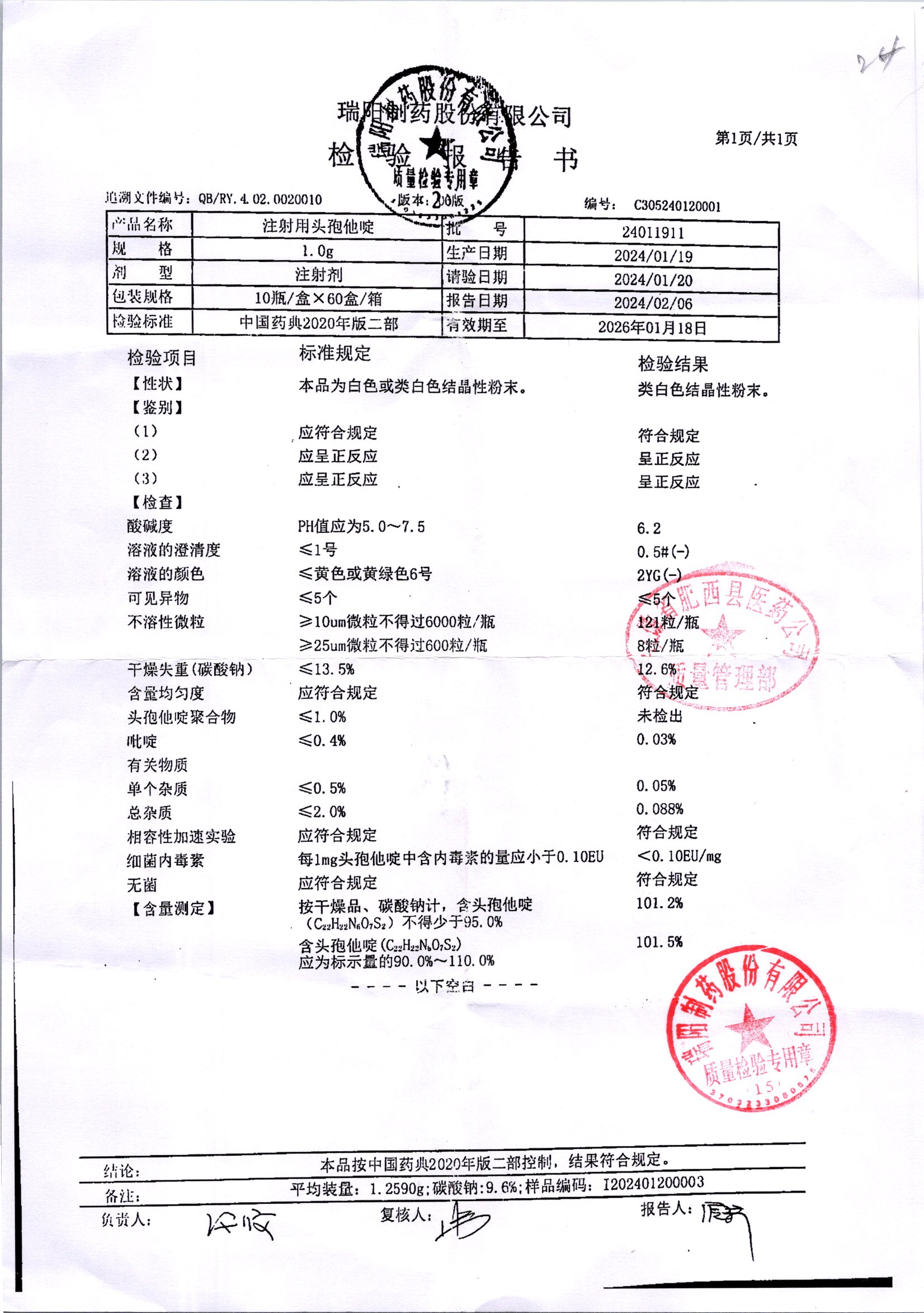 注射用头孢他啶 | 1.0g*10瓶 | 24012111 | 查看详情 |
