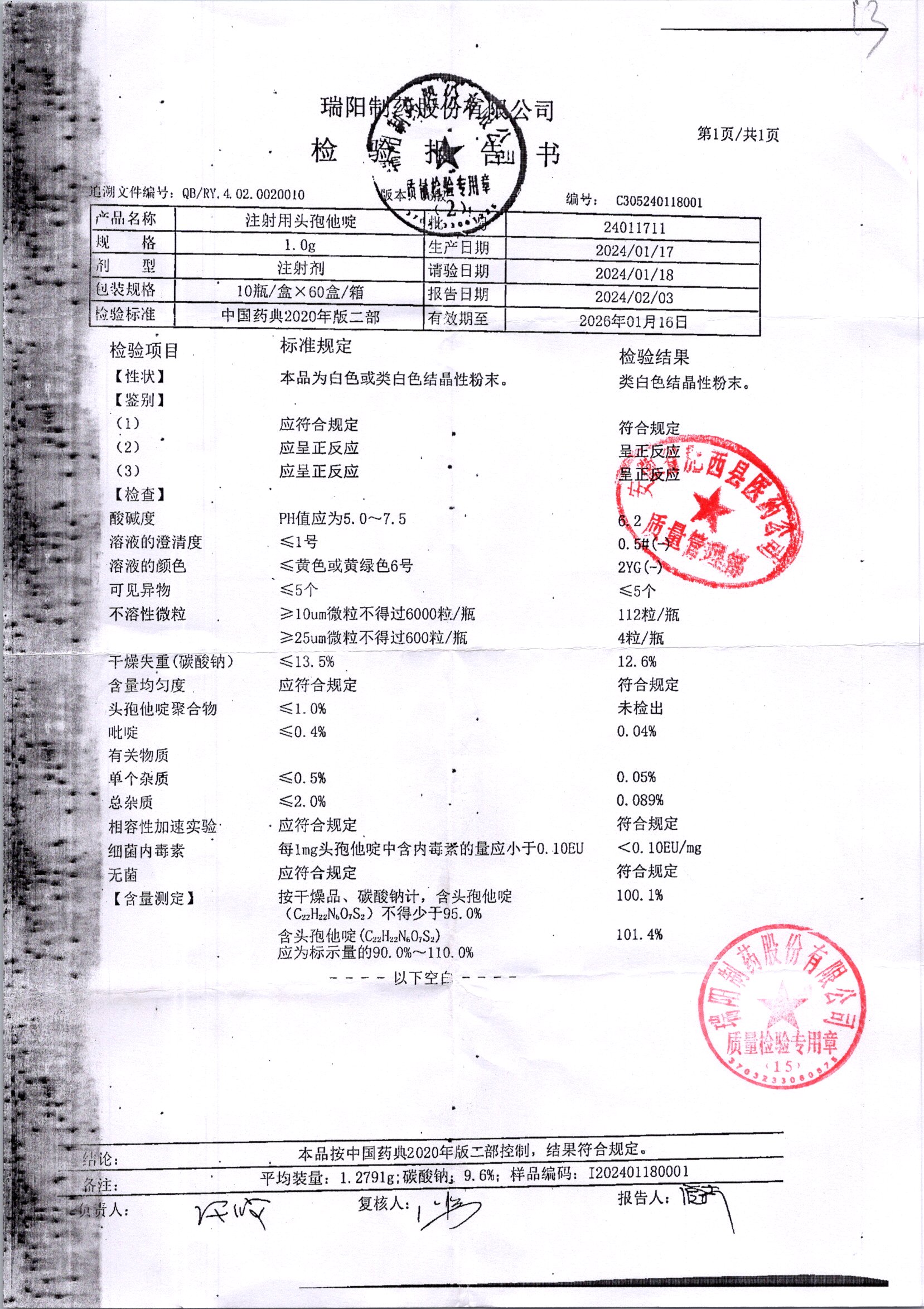 注射用头孢他啶 | 1.0g*10瓶 | 24011611 | 查看详情 |