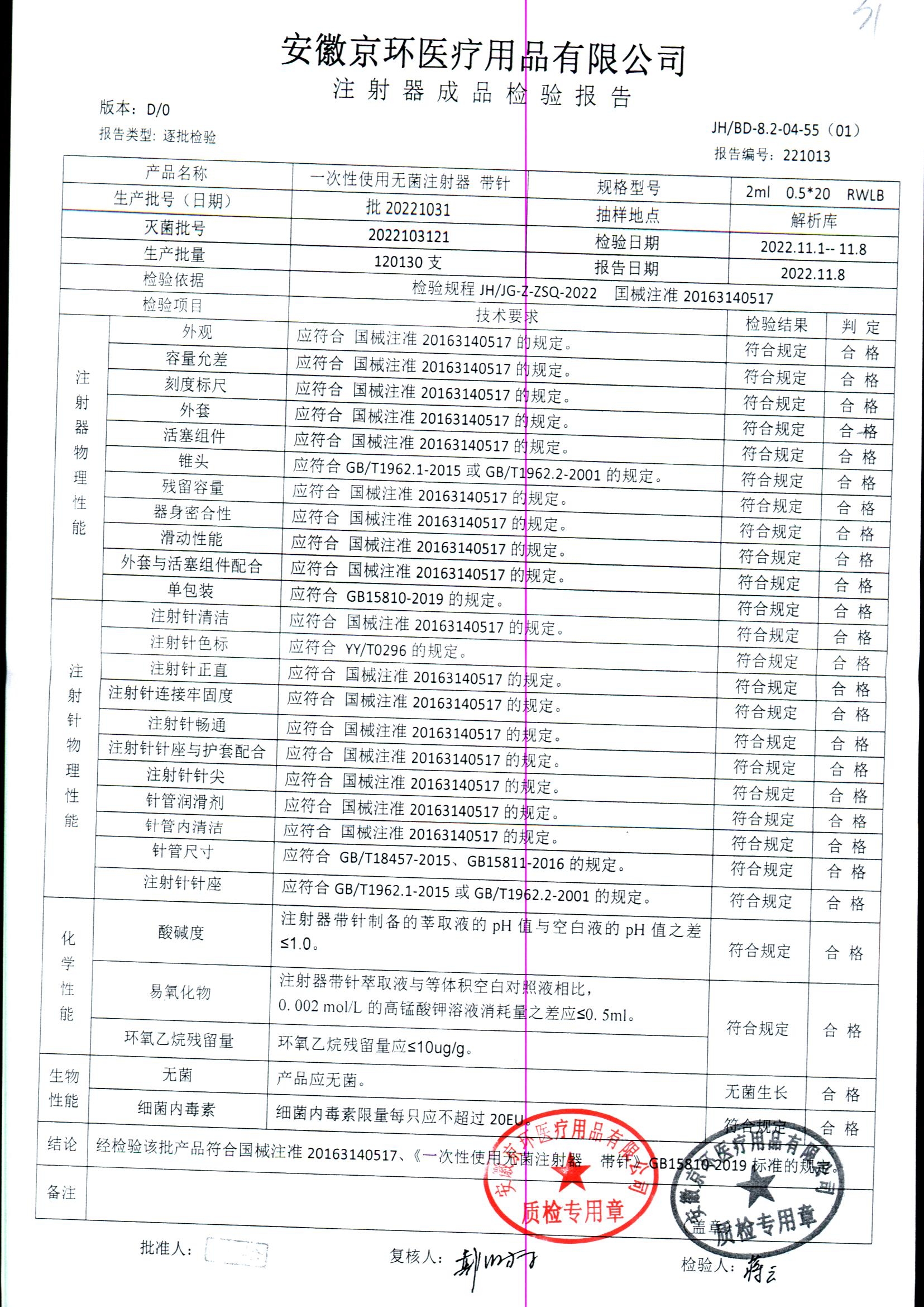 一次性使用无菌注射器带针 | 2mml/0.5*20 | 批20221031 | 查看详情 |