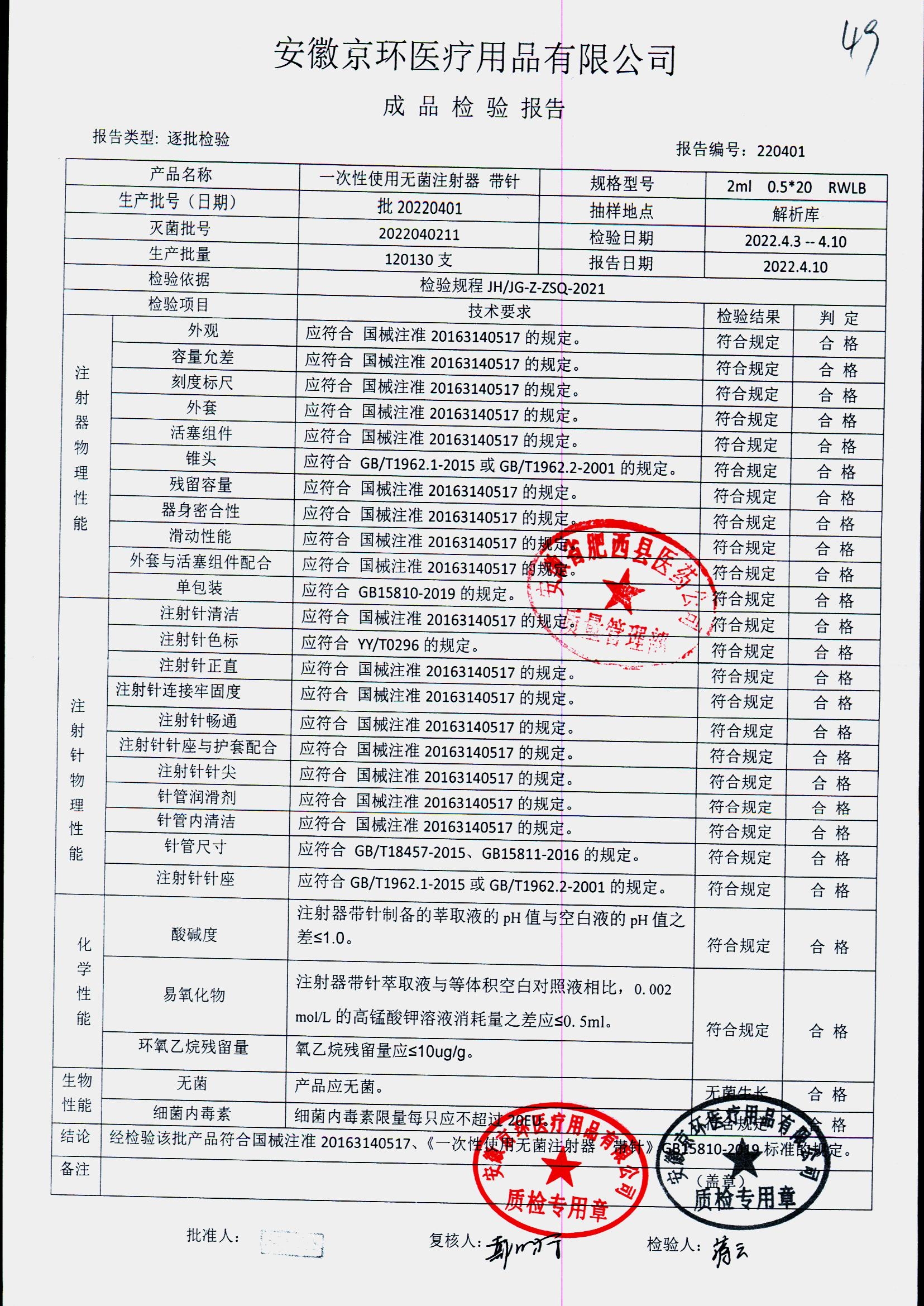 一次性使用无菌注射器带针 | 2mml/0.5*20 | 批20220401 | 查看详情 |
