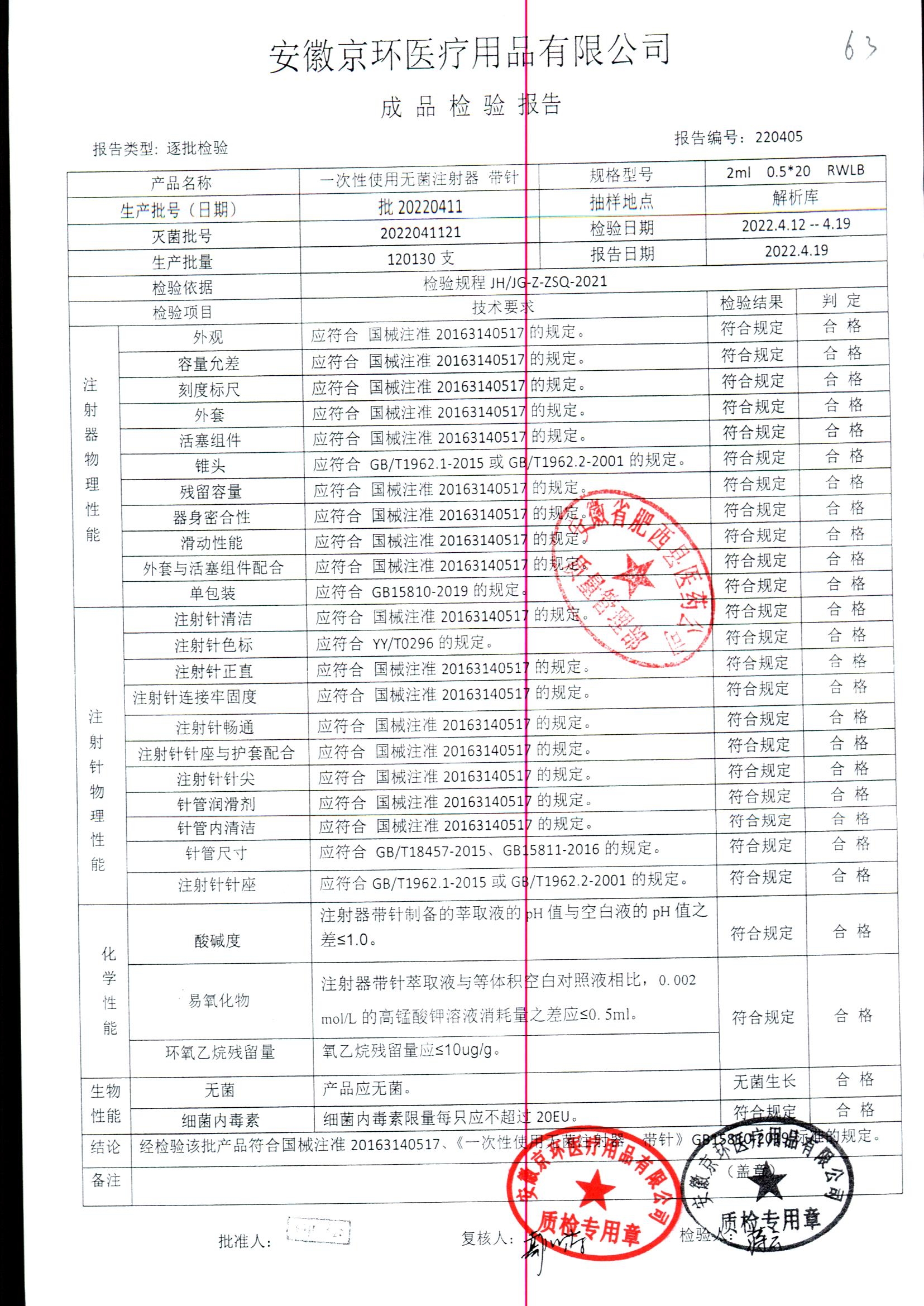 一次性使用无菌注射器带针 | 2mml/0.5*20 | 批20220411 | 查看详情 |