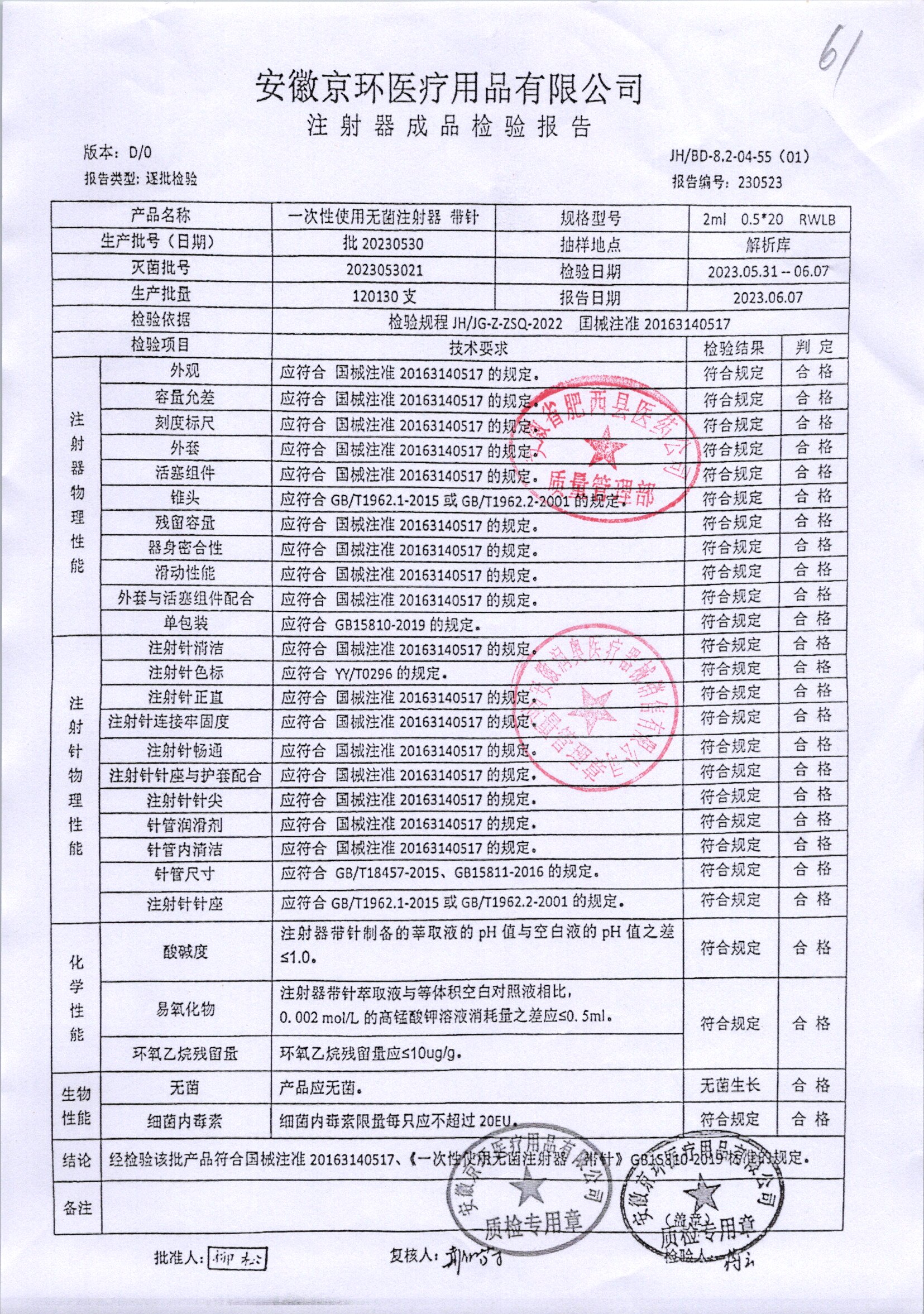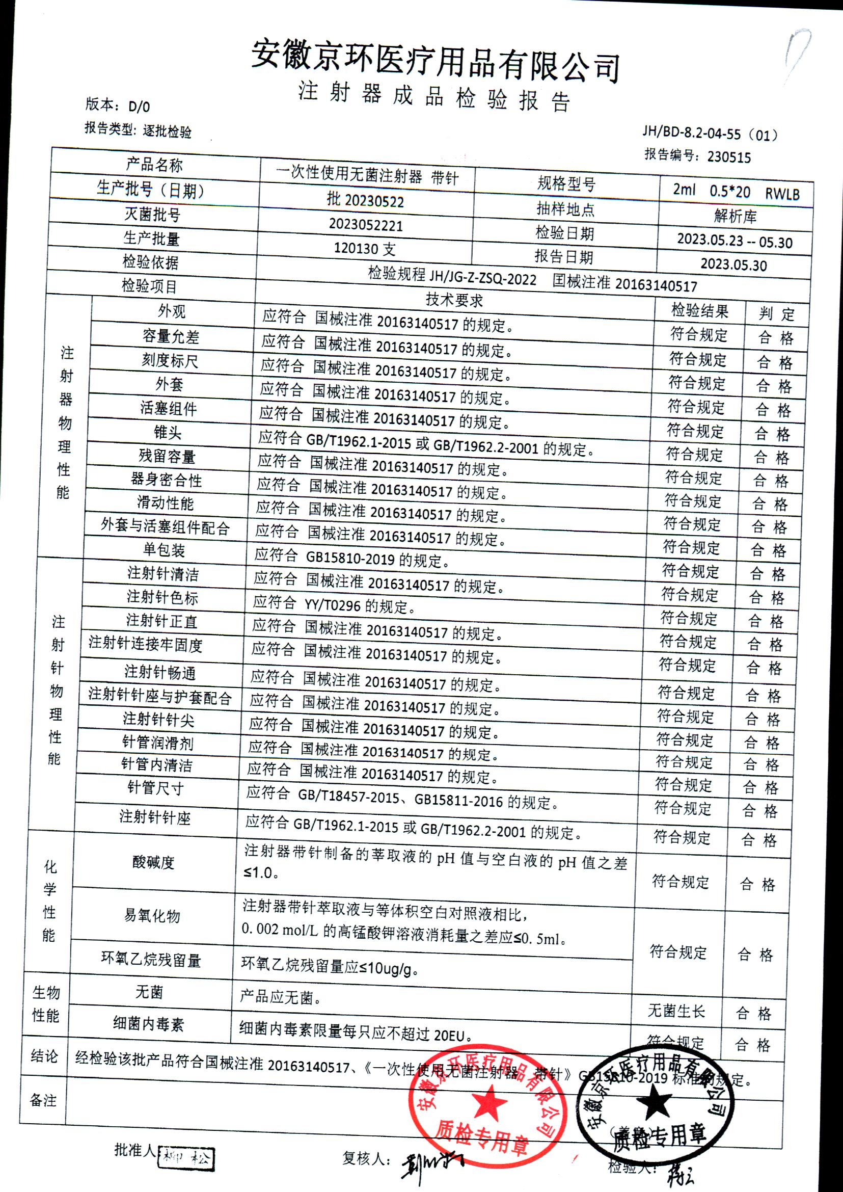 一次性使用无菌注射器带针 | 2mml/0.5*20 | 批20230530 | 查看详情 |