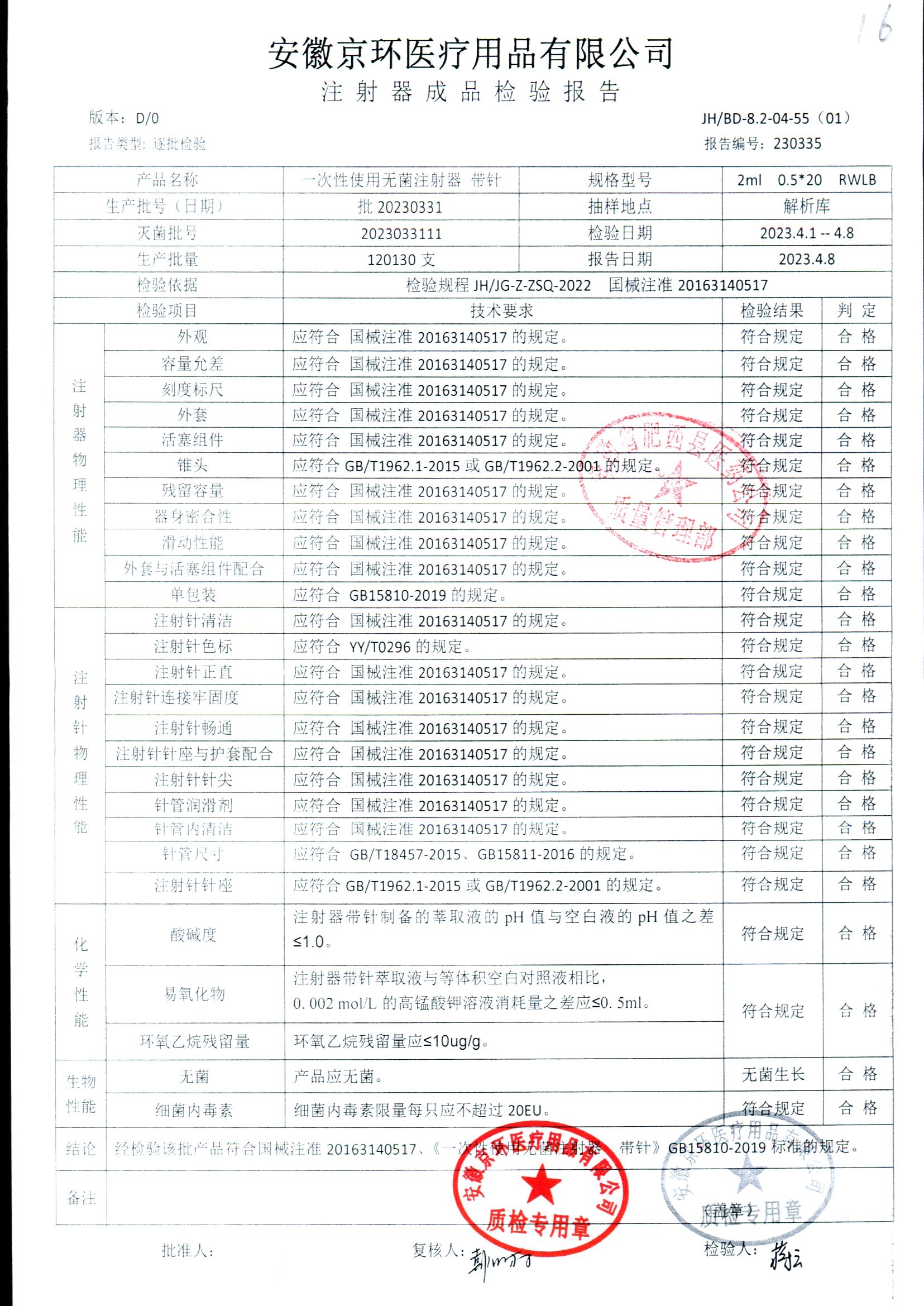 一次性使用无菌注射器带针 | 2mml/0.5*20 | 批20230522 | 查看详情 |