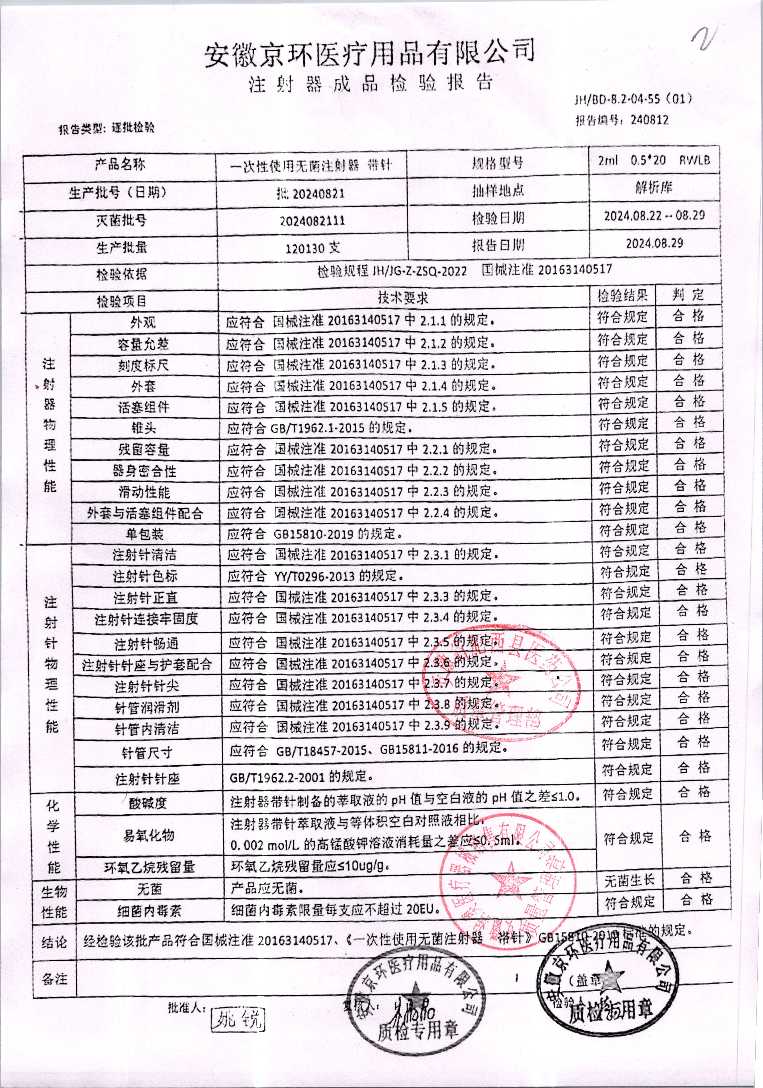 一次性使用无菌注射器带针 | 2mml/0.5*20 | 批20240821 | 查看详情 |