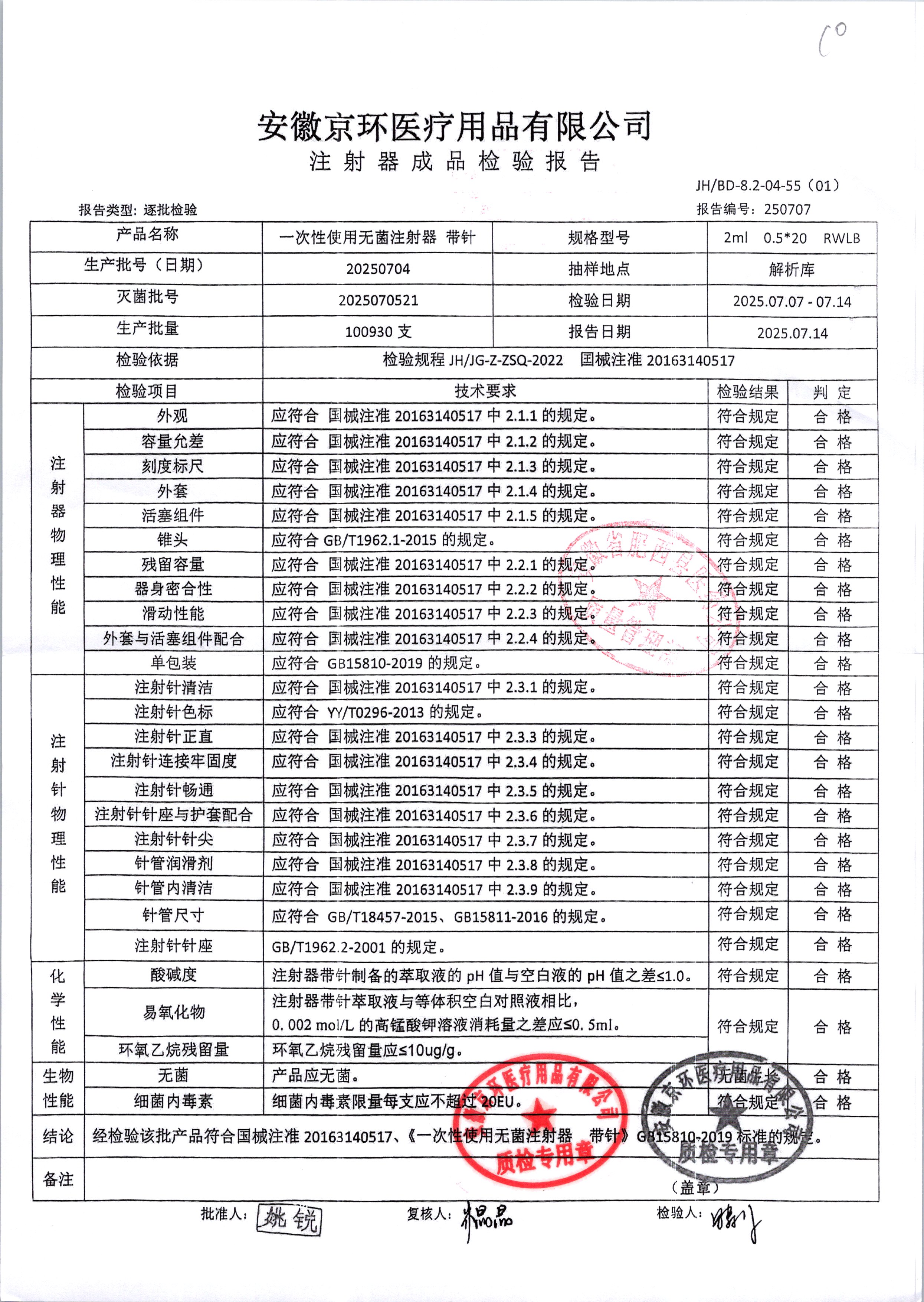 一次性使用无菌注射器带针 | 2mml/0.5*20 | 20250704 | 查看详情 |