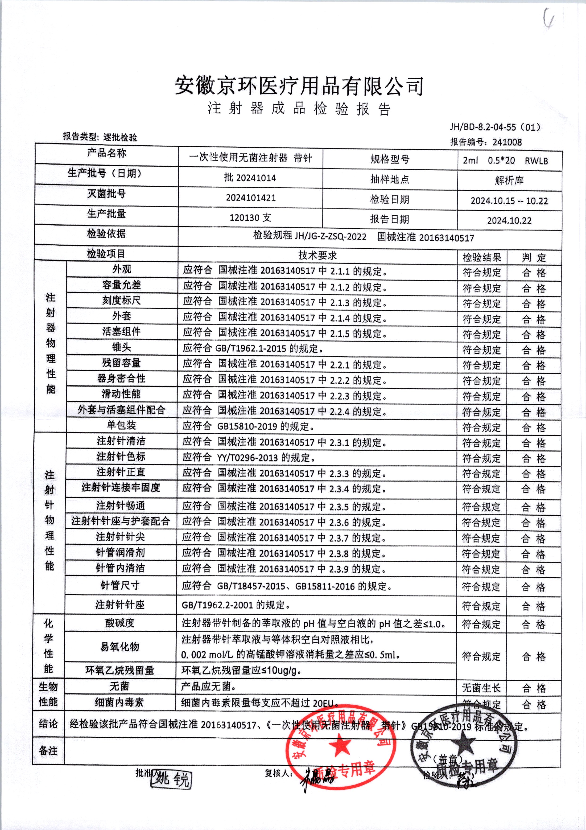 一次性使用无菌注射器带针 | 2mml/0.5*20 | 批20241014 | 查看详情 |